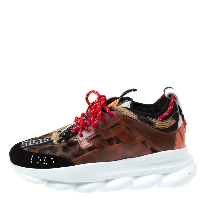 Versace’s Chain Reaction sneakers are for fashionable people like you. These ones are crafted from animal-printed calfhair and suede. They feature rubber panels through which the laces pass and high platforms soles with chain-like shape.
