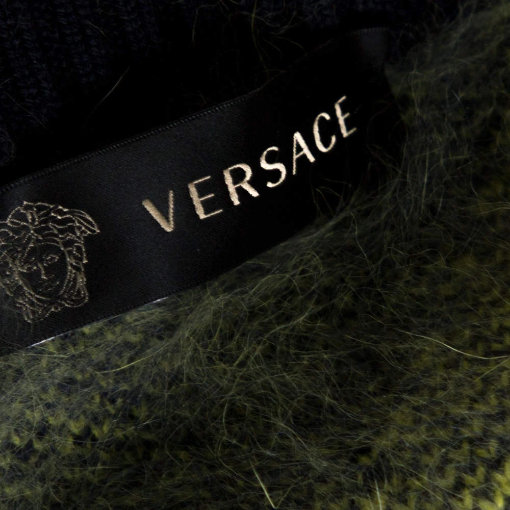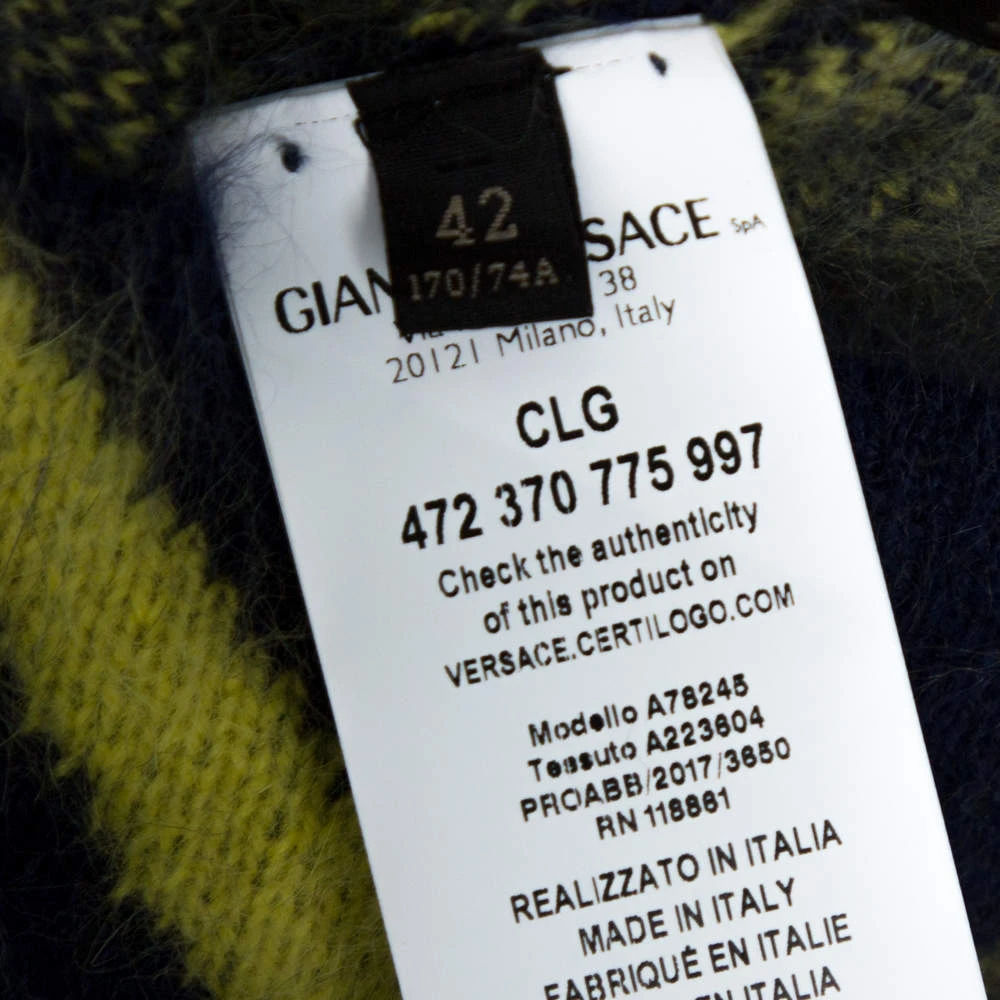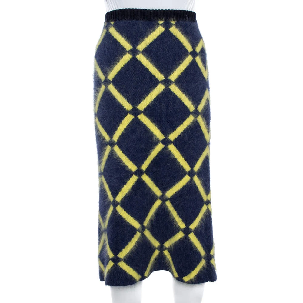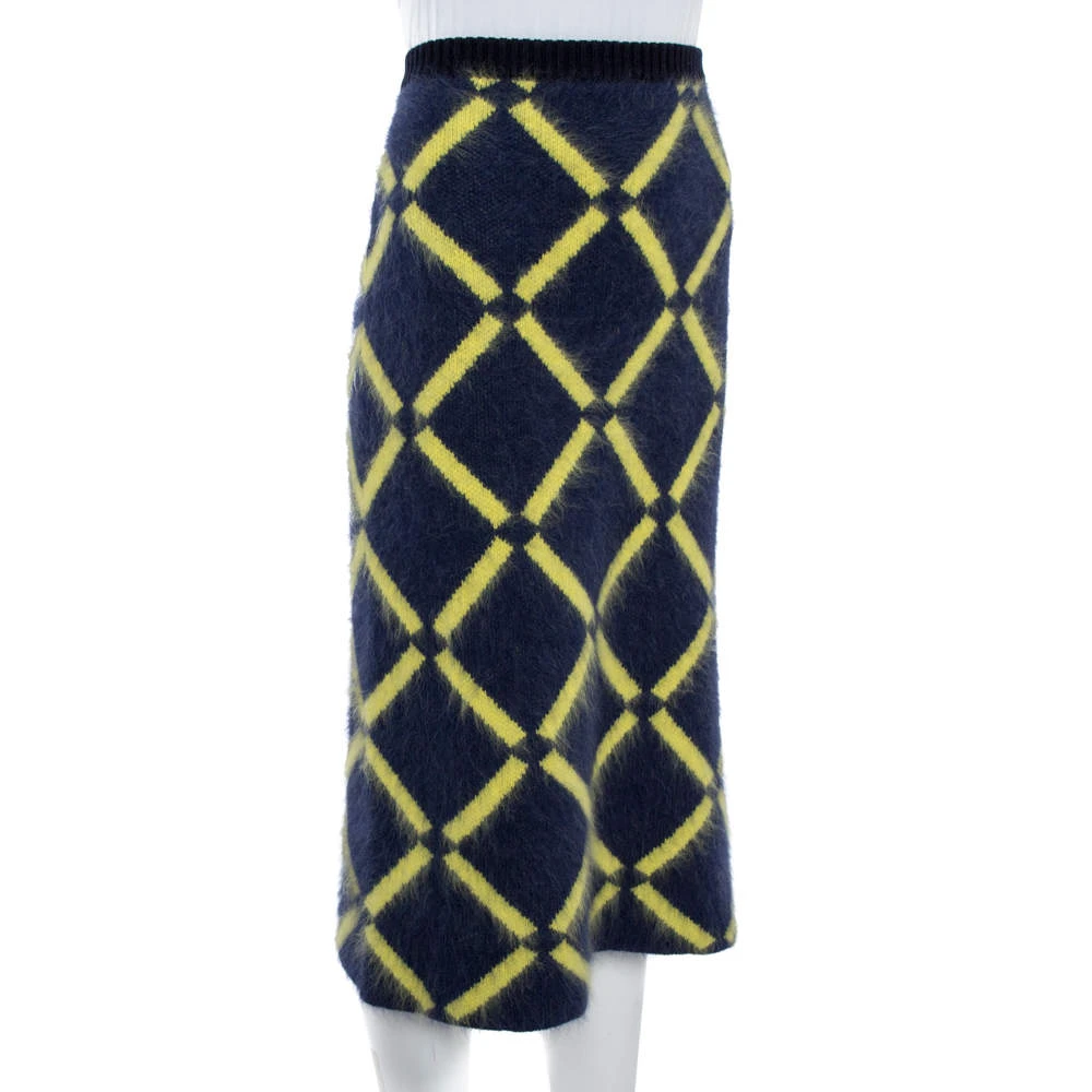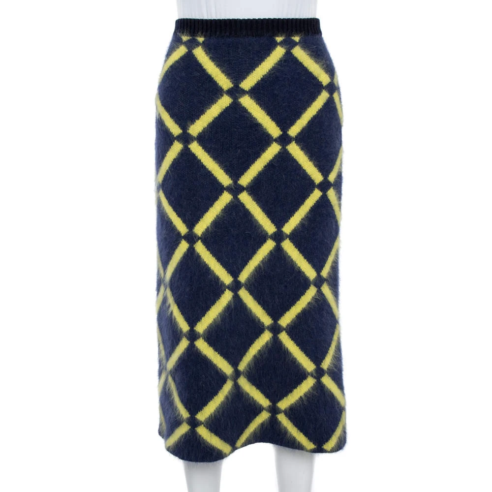 Elevate your fashion looks with this lovely pencil skirt from Versace! The navy blue skirt is made of a wool blend and features a diamond pattern on it. Pair it with a poncho and ankle boots for your fashionable days out.