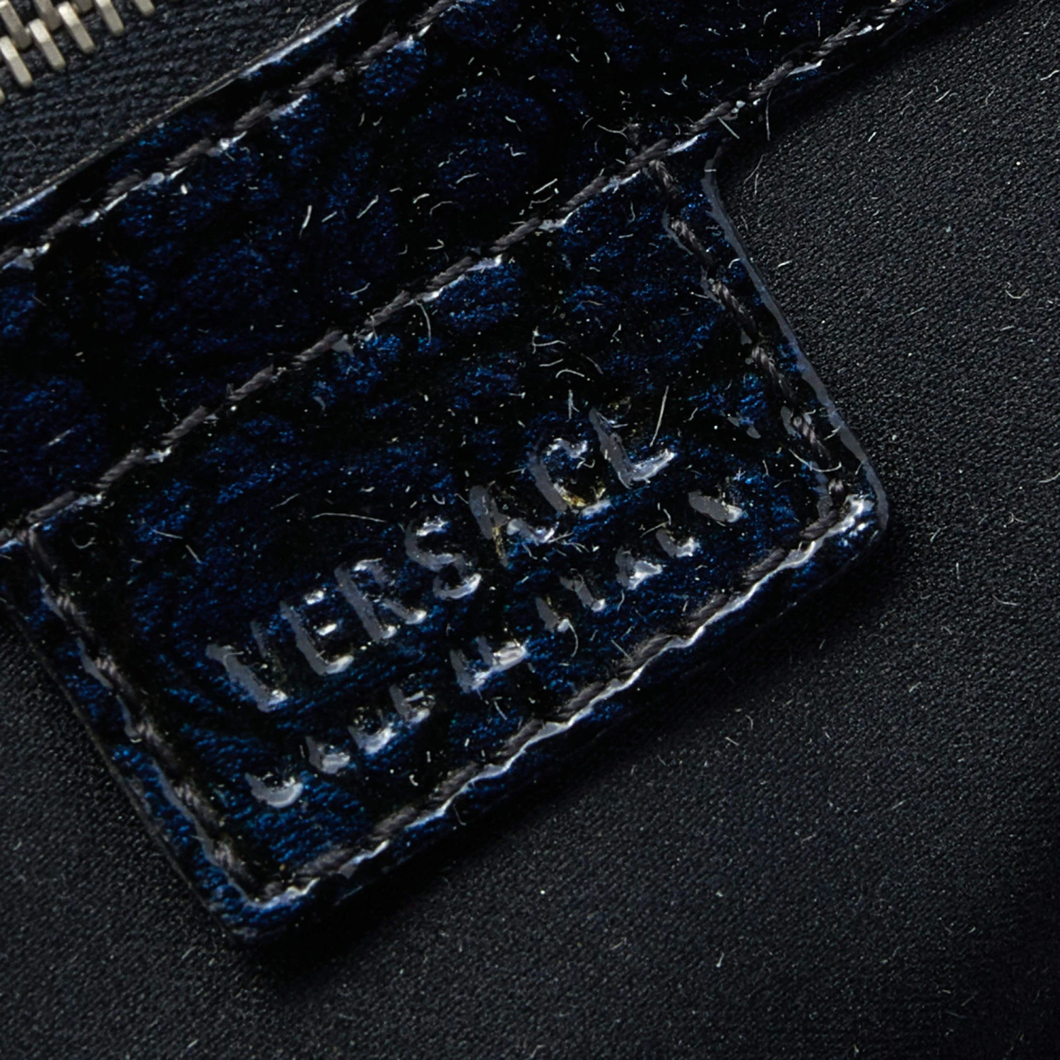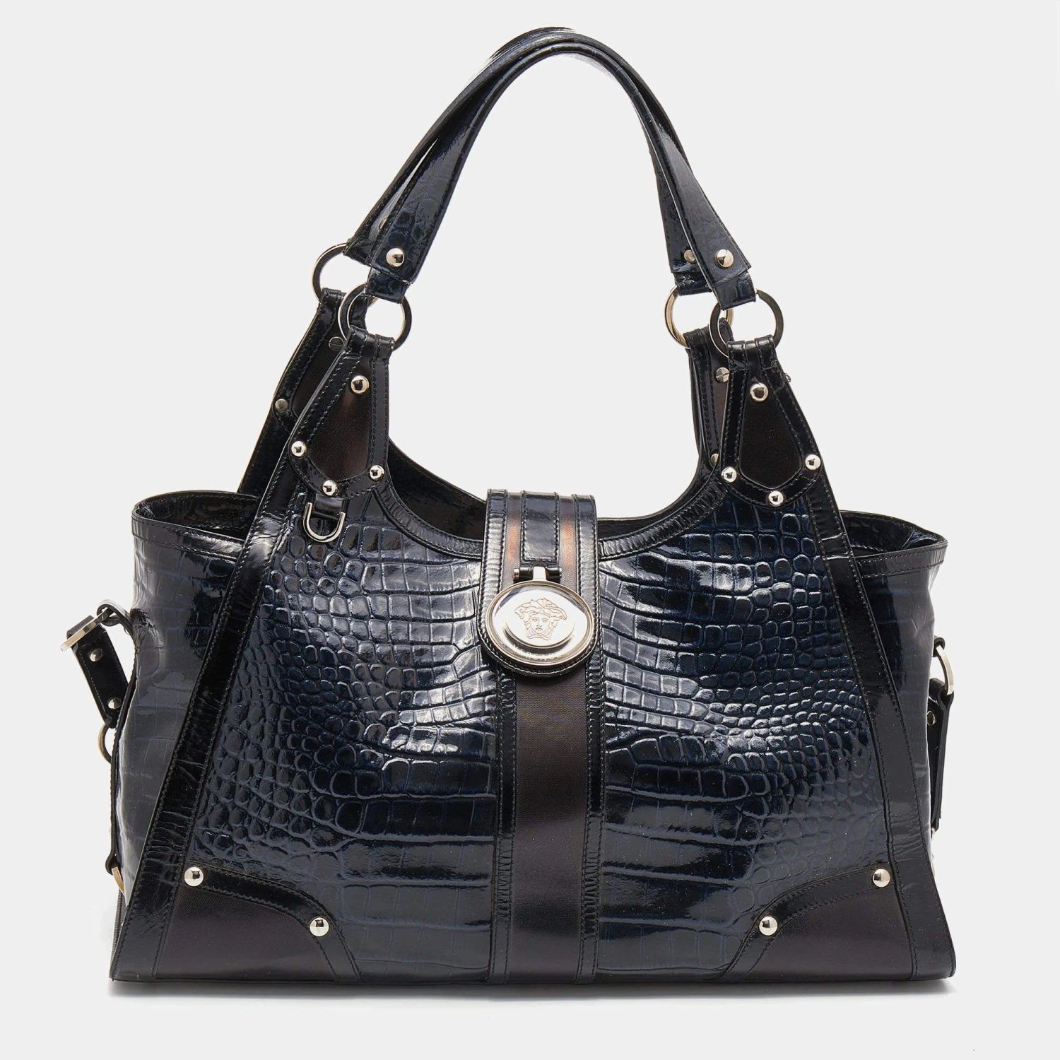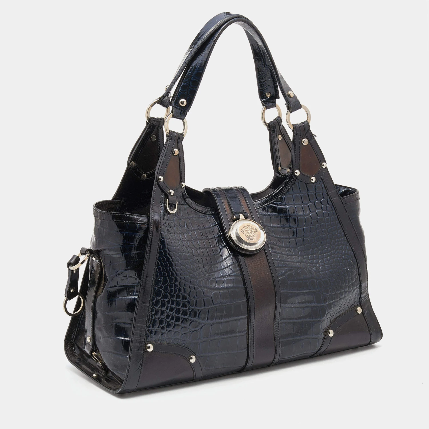 Created using croc-embossed patent leather and coated canvas on the exterior with the silver-toned emblematic Medusa charm, this satchel from Versace is more than just about high-end beauty. It is lined with satin internally and holds optimal storage space for your belongings.