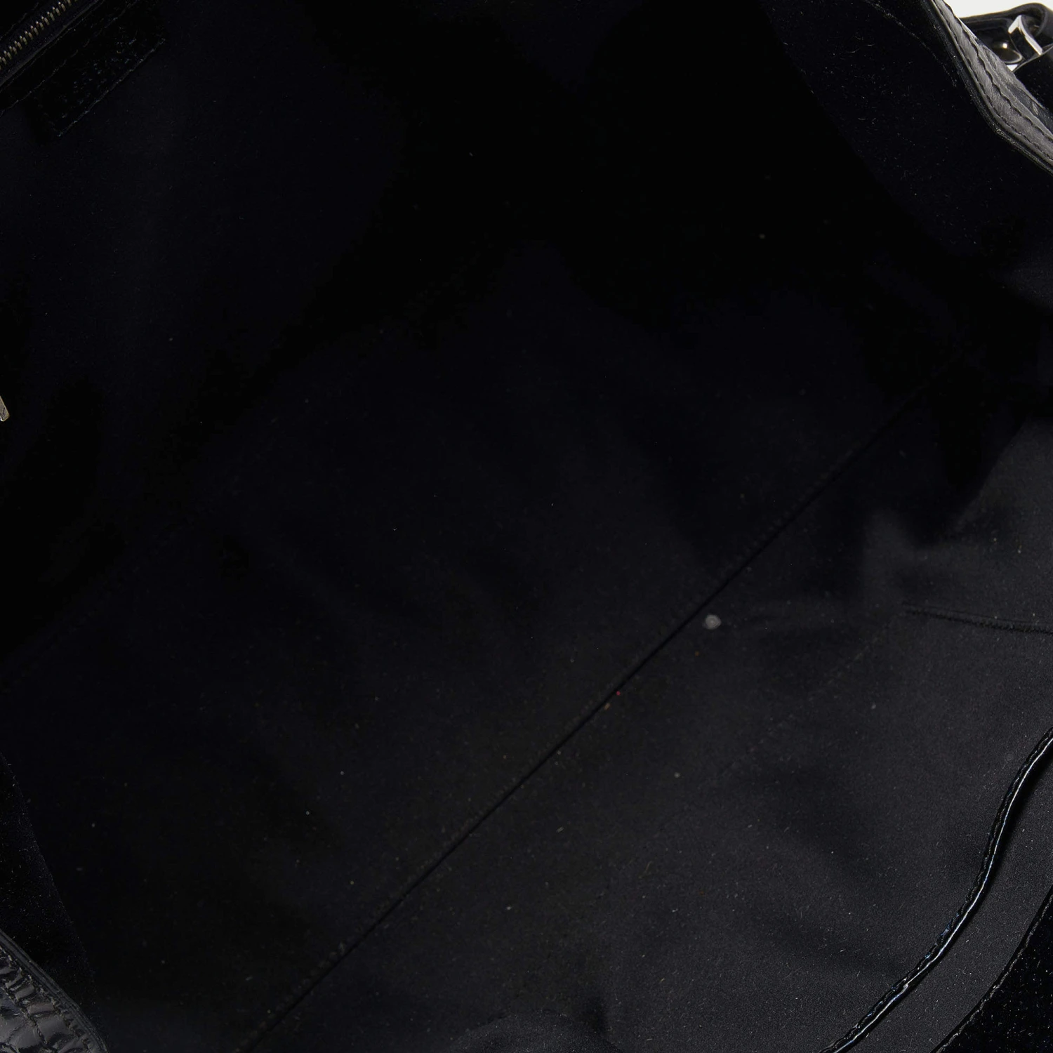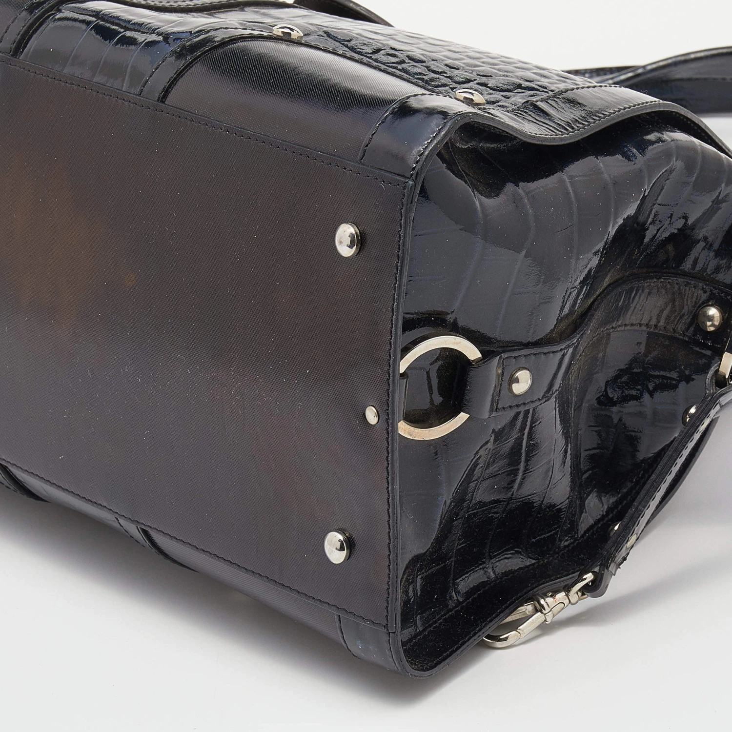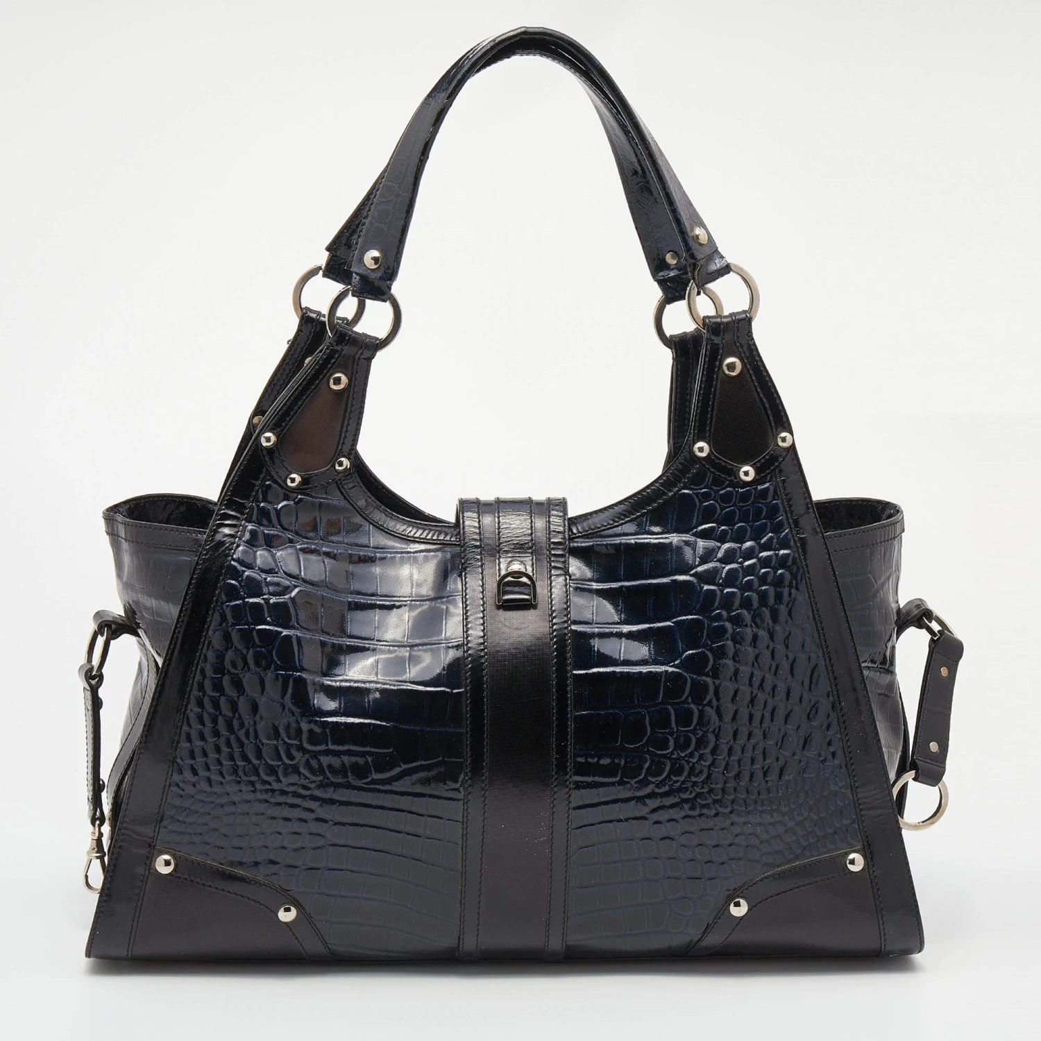 Created using croc-embossed patent leather and coated canvas on the exterior with the silver-toned emblematic Medusa charm, this satchel from Versace is more than just about high-end beauty. It is lined with satin internally and holds optimal storage space for your belongings.