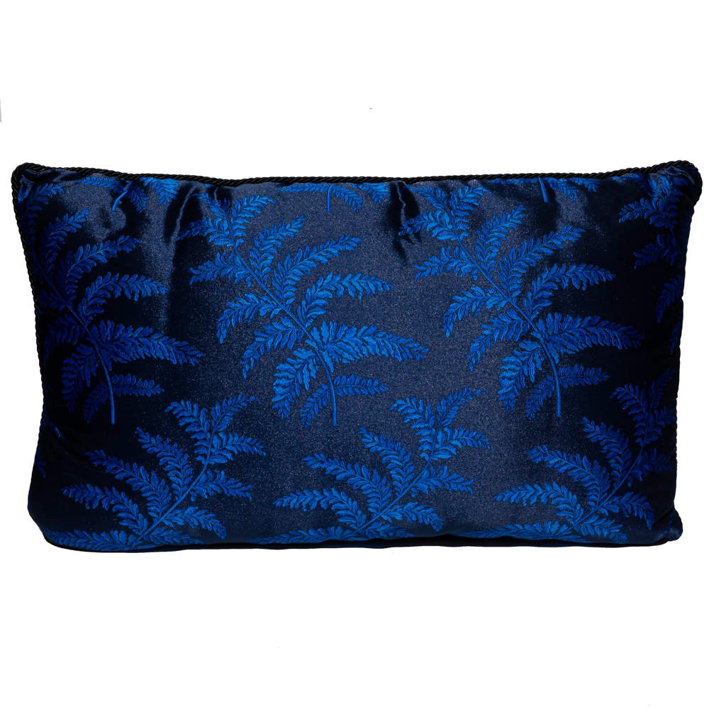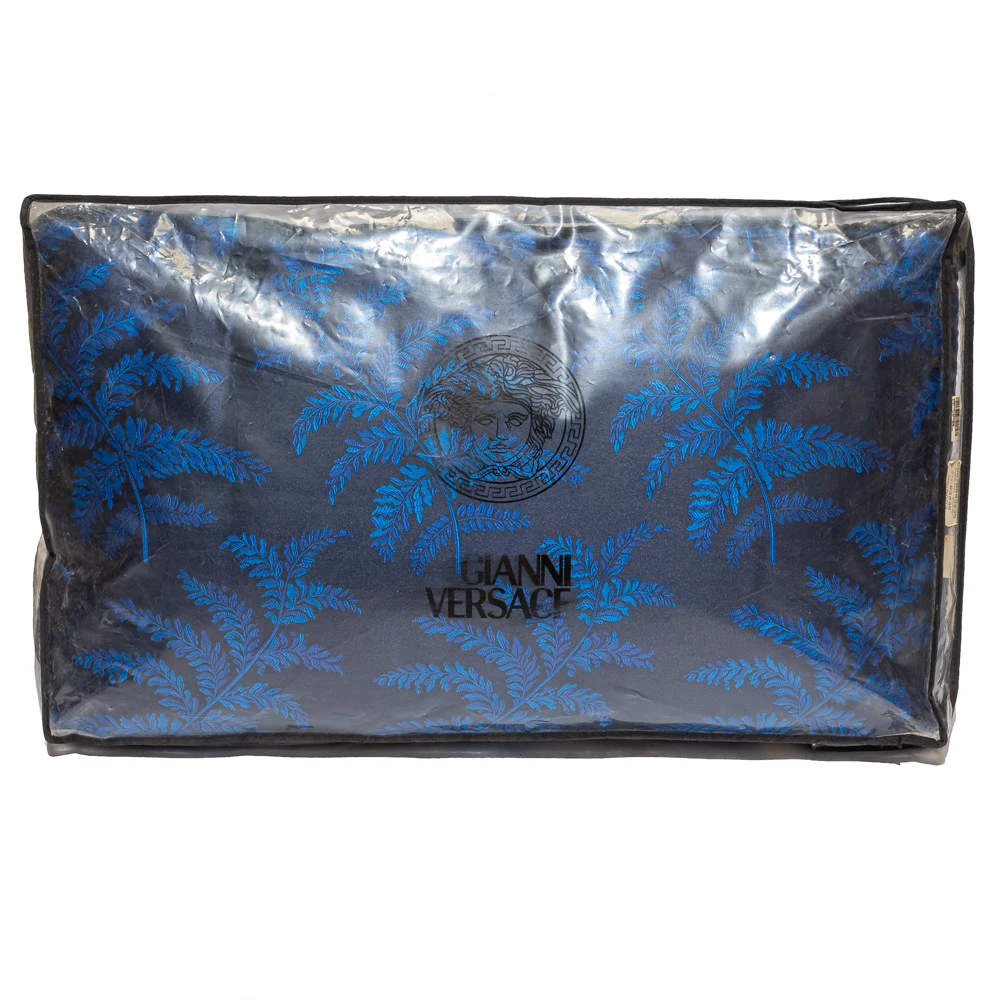 A soft, well-made pillow by Versace to add a luxe element to your home. The pillow in navy blue has a rectangular shape and a spread of motifs all over.