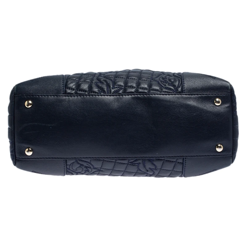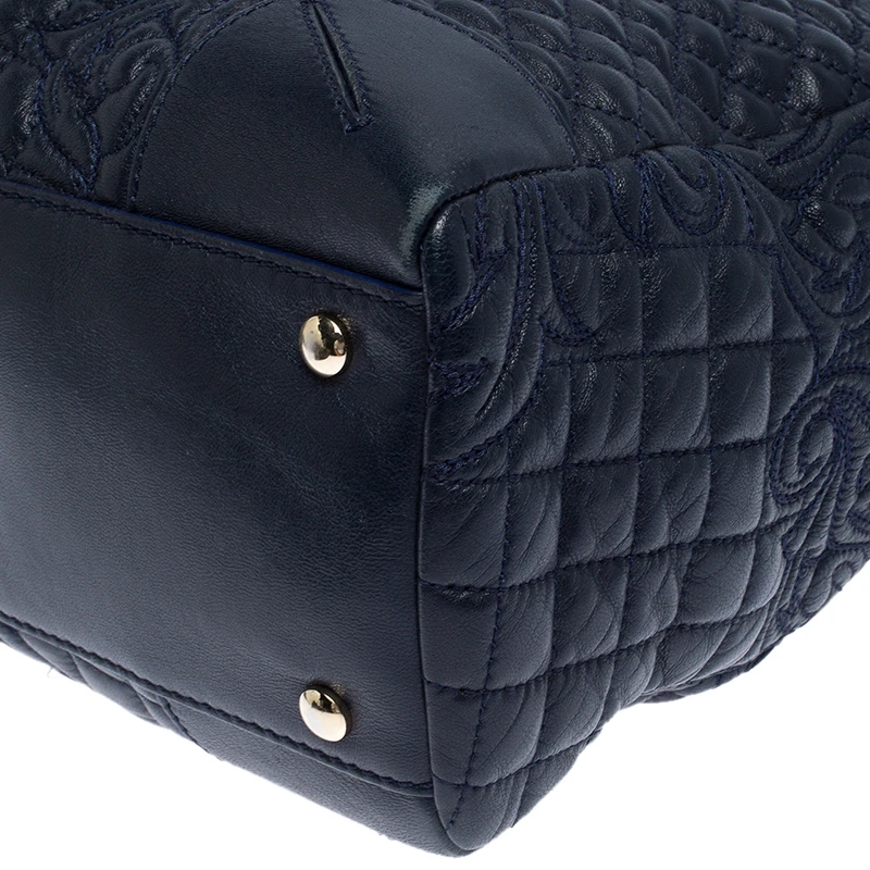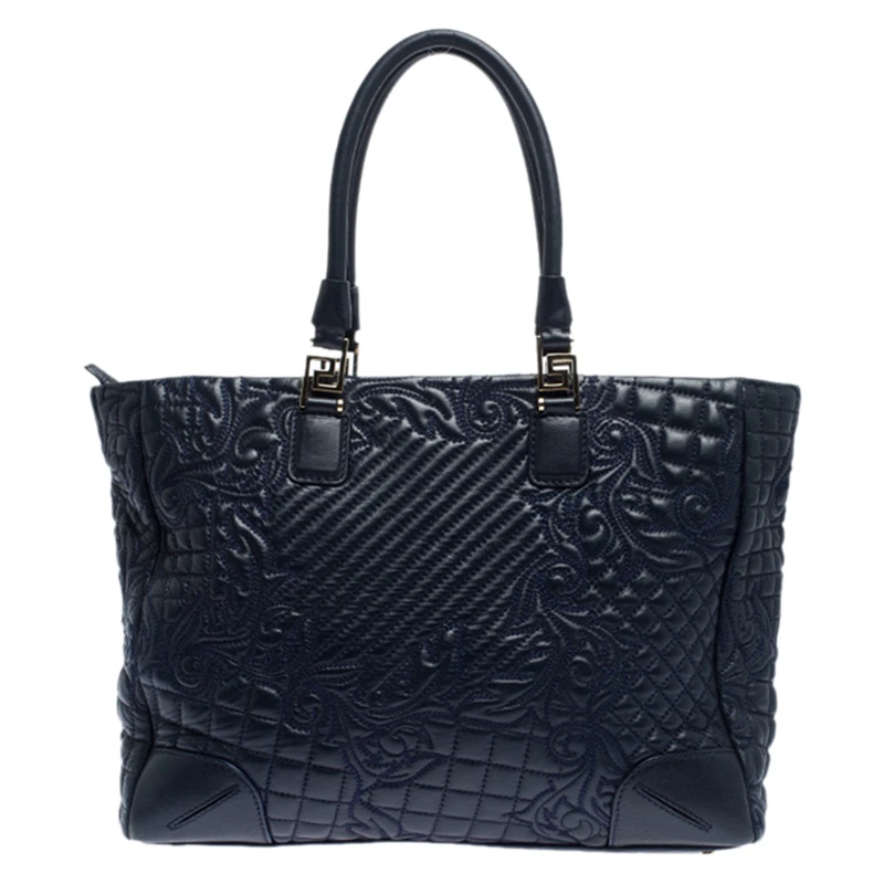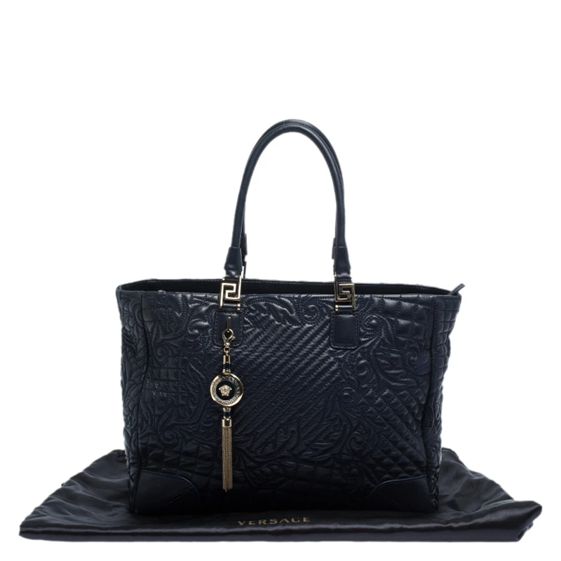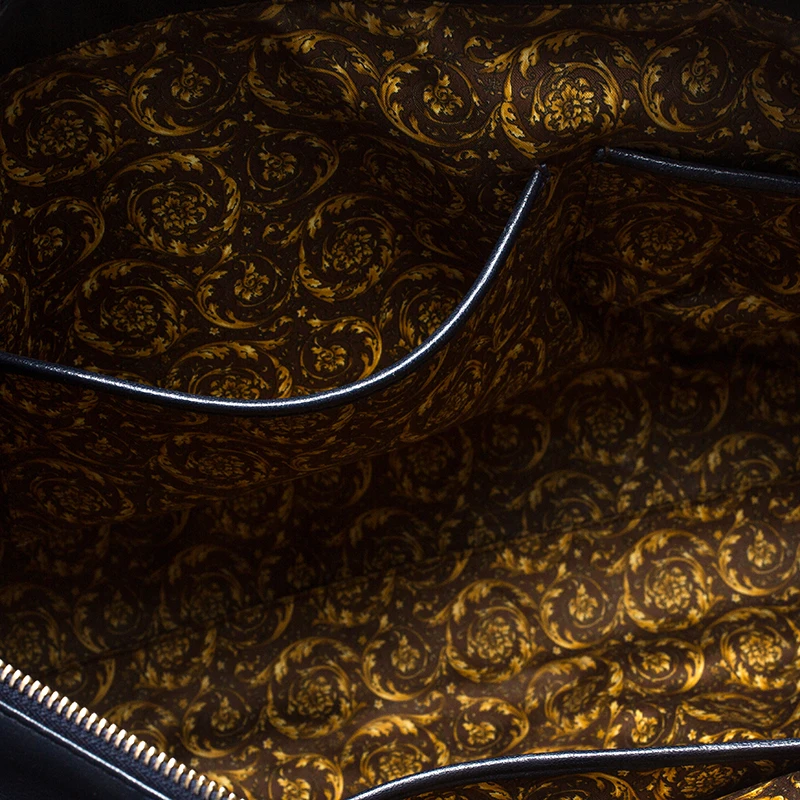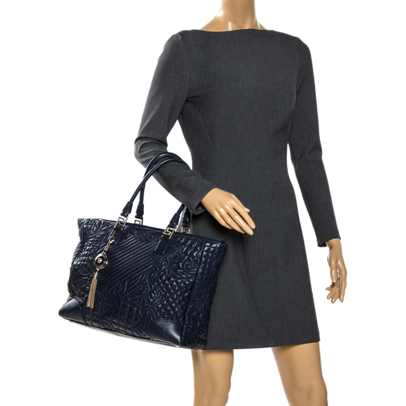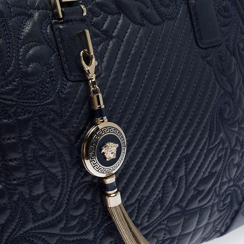 How gorgeous is this tote from Versace! Crafted from navy blue leather and gold-tone hardware, it carries an outstanding quilted design all over the exterior. It has a printed satin interior secured by zippers and it is held by two handles. The tasselled-Medusa charm uplifts its beauty and makes it a buy you will not regret.