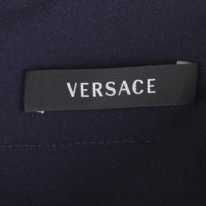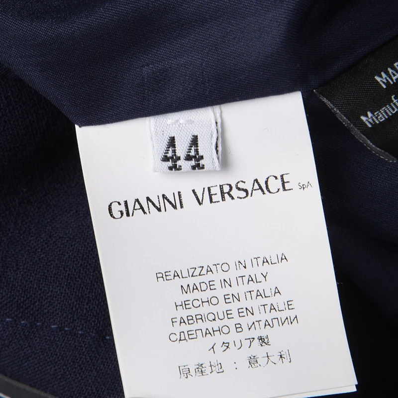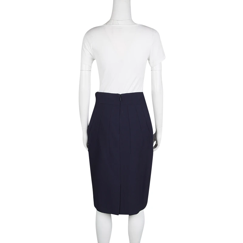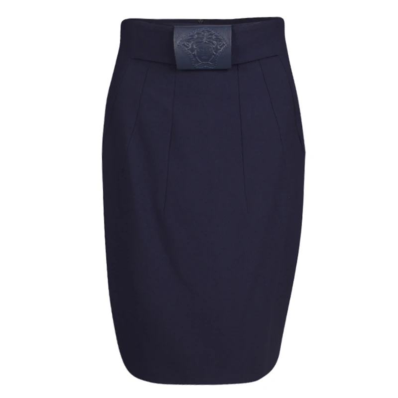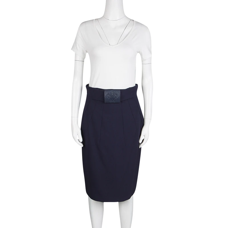 Fashioned in a rich navy blue wool, this pencil skirt from Versace comes with a Medusa leather patch that makes it both edgy and lust-worthy. It is well-appointed with neat pleats and secured with a concealed rear zipper closure. We think it looks absolutely flattering with a tucked in logo-tee or blouse.