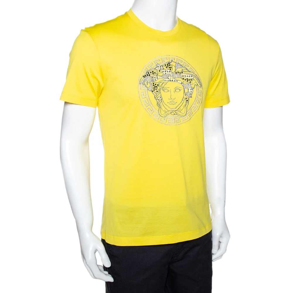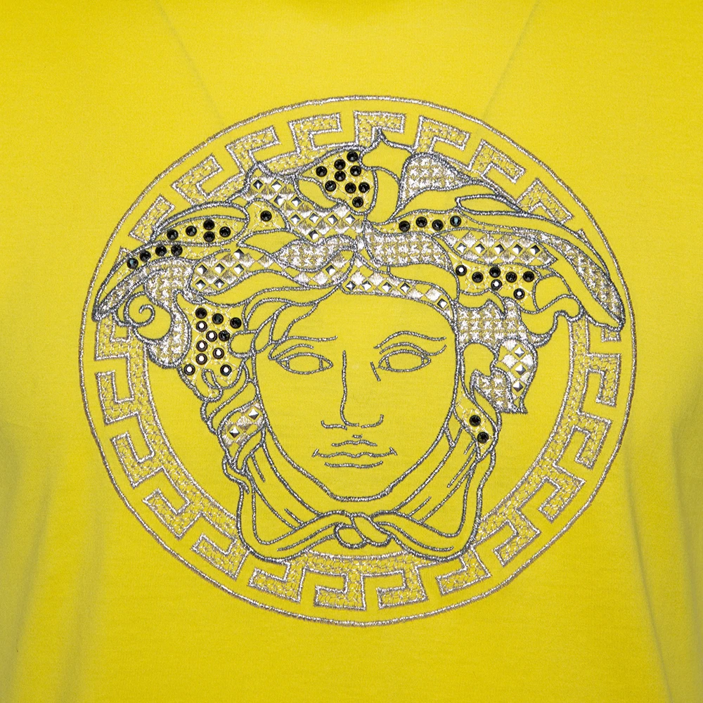 This t-shirt comes from the house of Versace. It is crafted from 100% cotton and flaunts a bright shade of yellow. It is styled with a round neckline, short sleeves and the signature Medusa motif the front. It is great for casual days and will pair well with jeans.