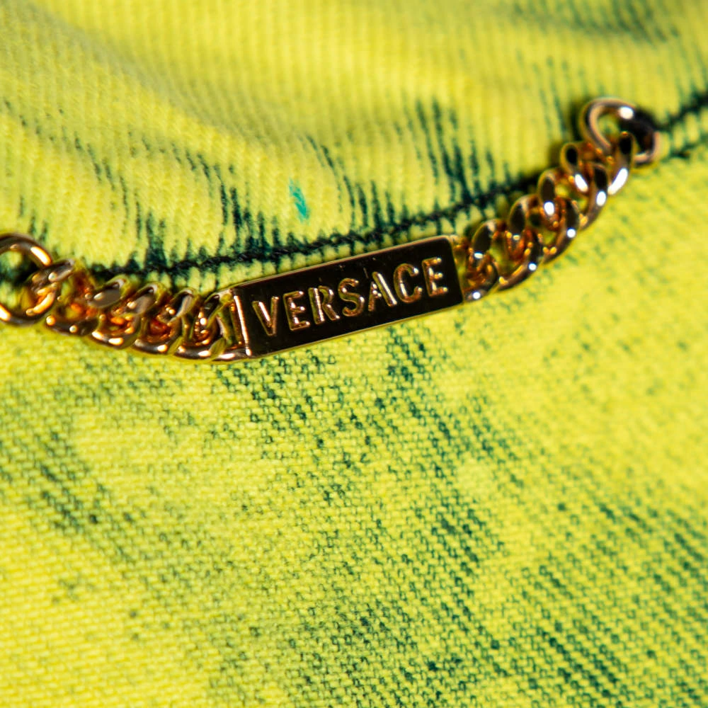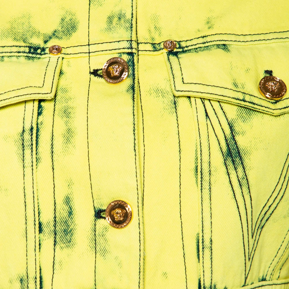 Add a pop of color to your ensemble with this stunning boxy jacket from the House of Versace. It is stitched using neon yellow denim fabric and features a cropped style. It comes with buttoned accents and two external pockets. Exude charm as you wear this Versace creation!