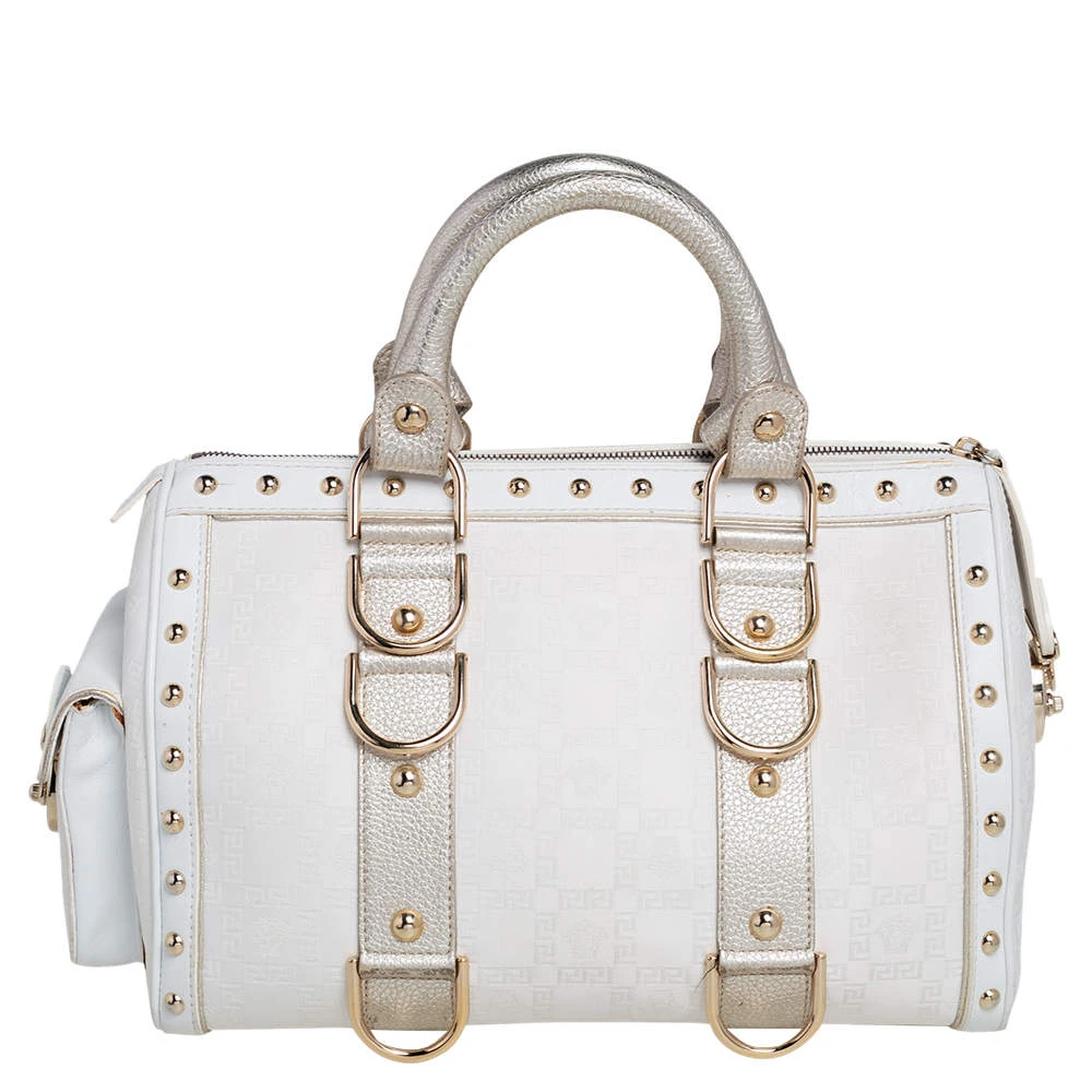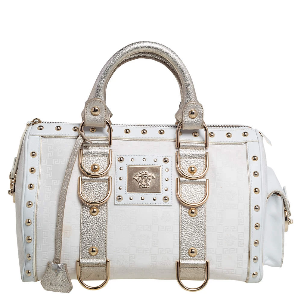 This Versace eye candy is crafted from off-white & gold monogram fabric & leather and detailed with gold-tone hardware with the logo plaque on the front. It has two short handles making it easier to carry it in the crook of your arm.