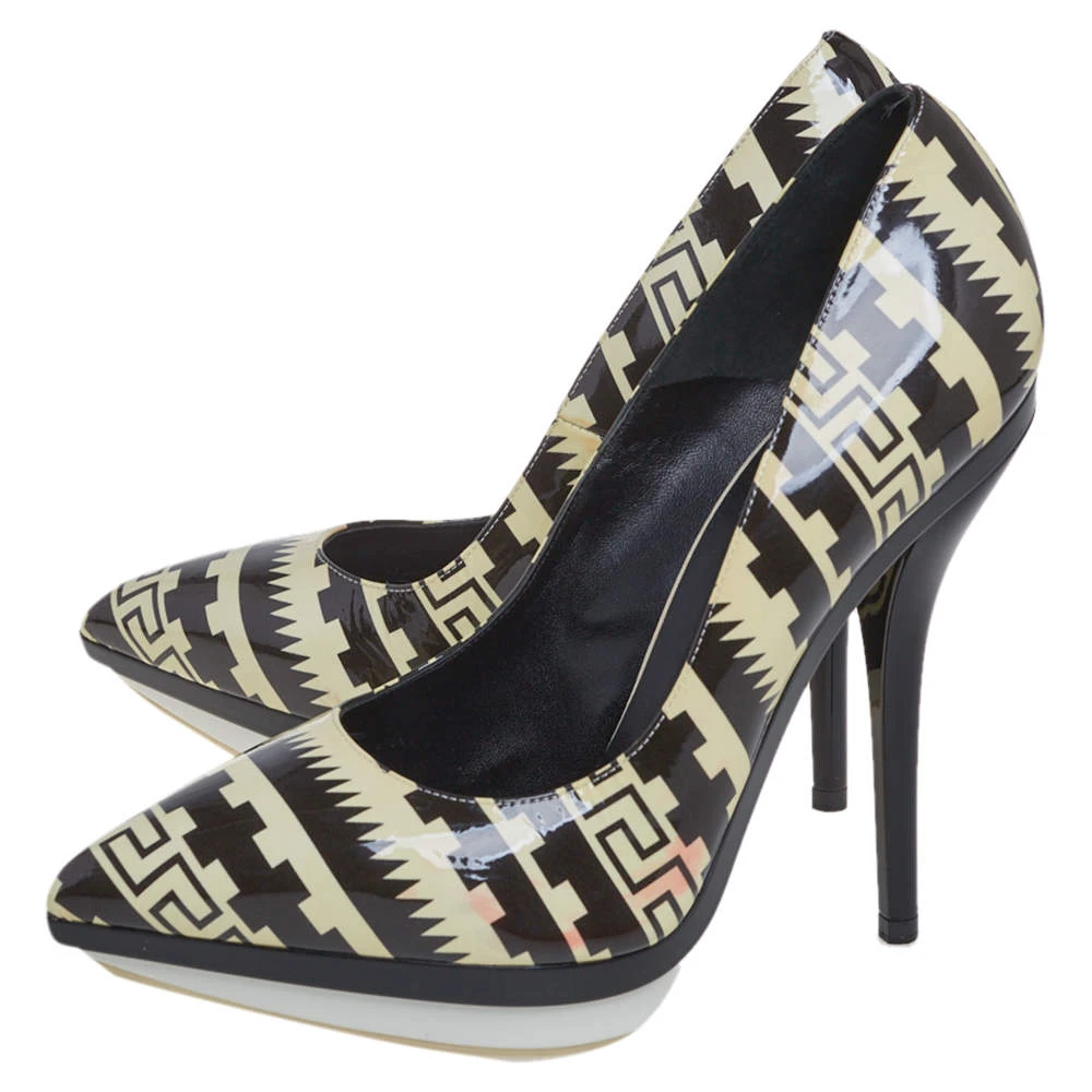 Get these classic pumps by Versace now. Crafted from black & off-white patent leather, they feature sophisticated pointed toes. 13 cm heels and platforms. Made in Italy, these heels have been designed to deliver style, comfort, and glamour. With pure rubber soles, they make a great buy.