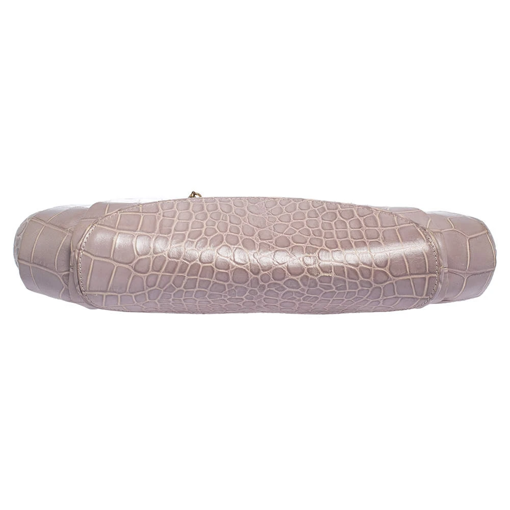 This stylish shoulder bag comes from the house of Versace. Crafted meticulously from croc-embossed leather, it comes in a lovely shade of old rose. It has interesting detailing on the sides, a brand charm and a single shoulder strap. It has a satin interior and is finished with gold-tone hardware.