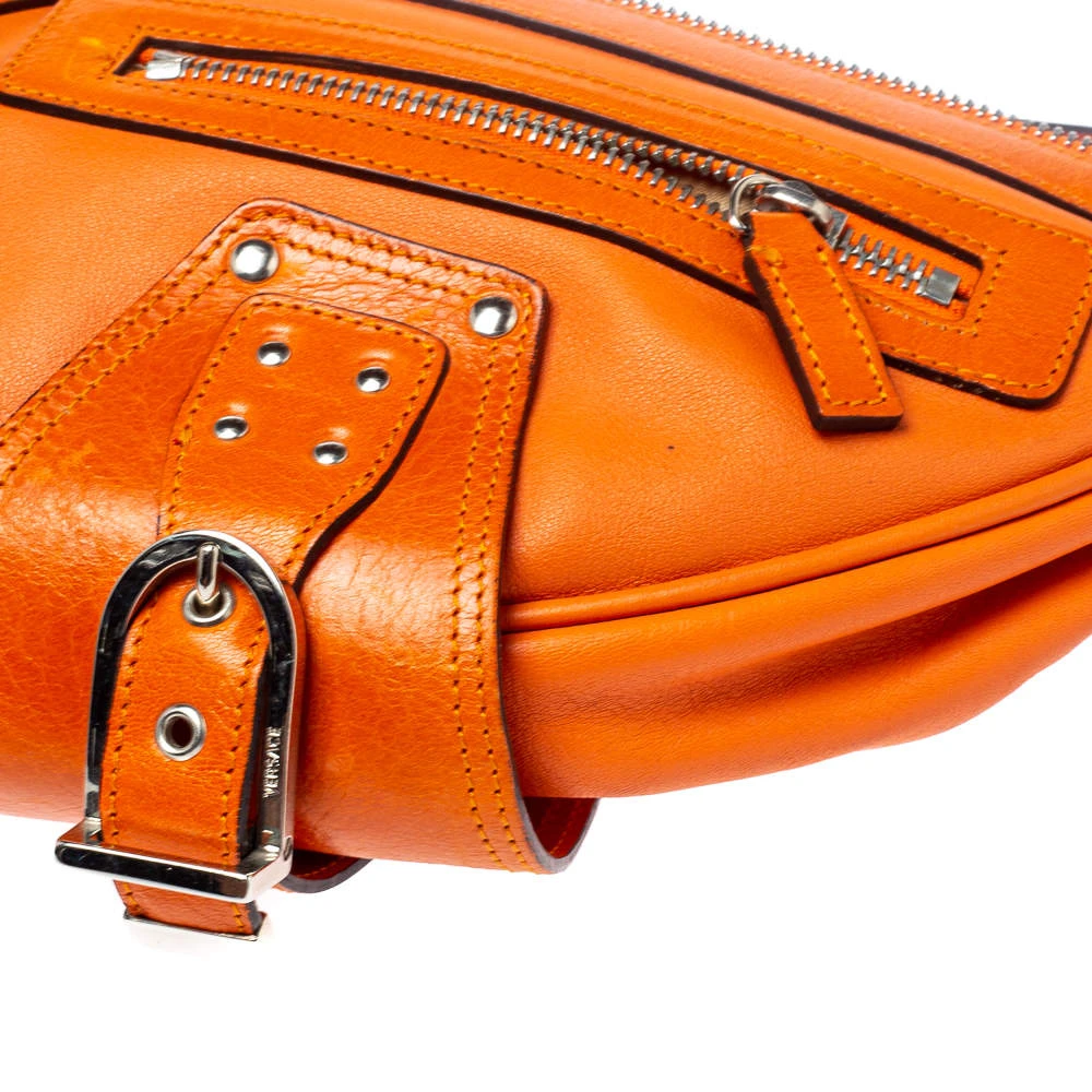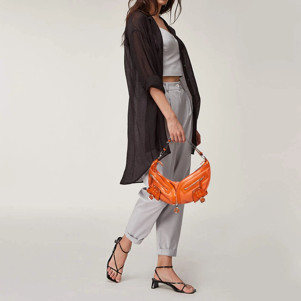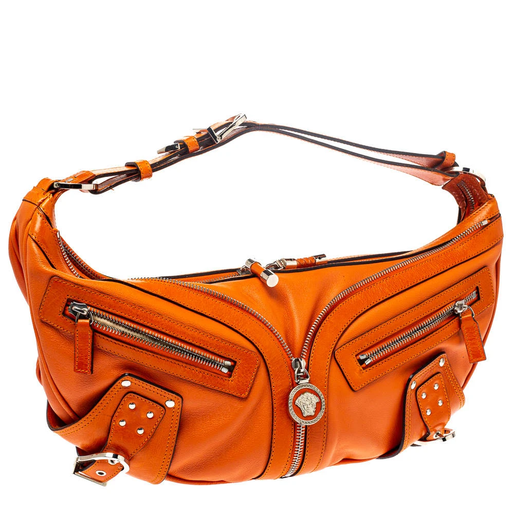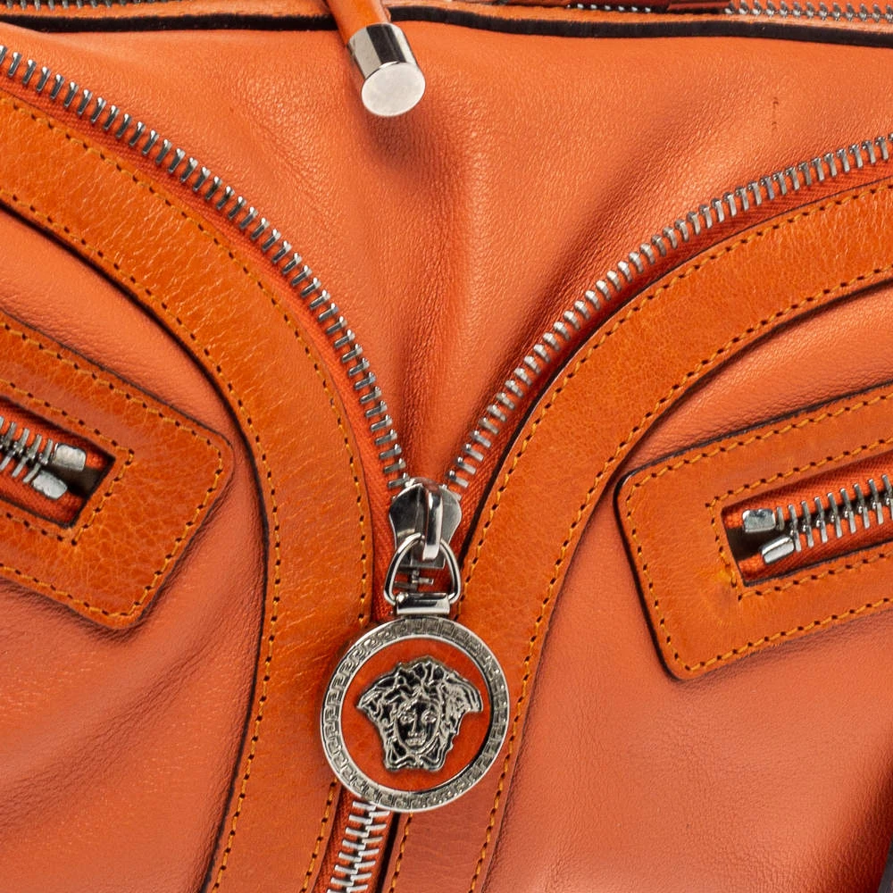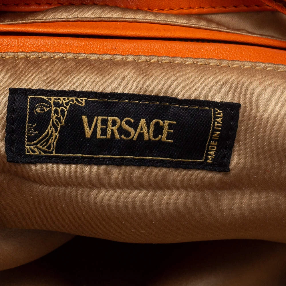 Made by Versace, this handbag is an immaculate balance of sophistication and rational utility. Designed with quality leather, this bag comes in a lovely shade of orange. This bag has a spacious interior lined with satin. The two pockets in the front with the logo in silver-tone add interest.