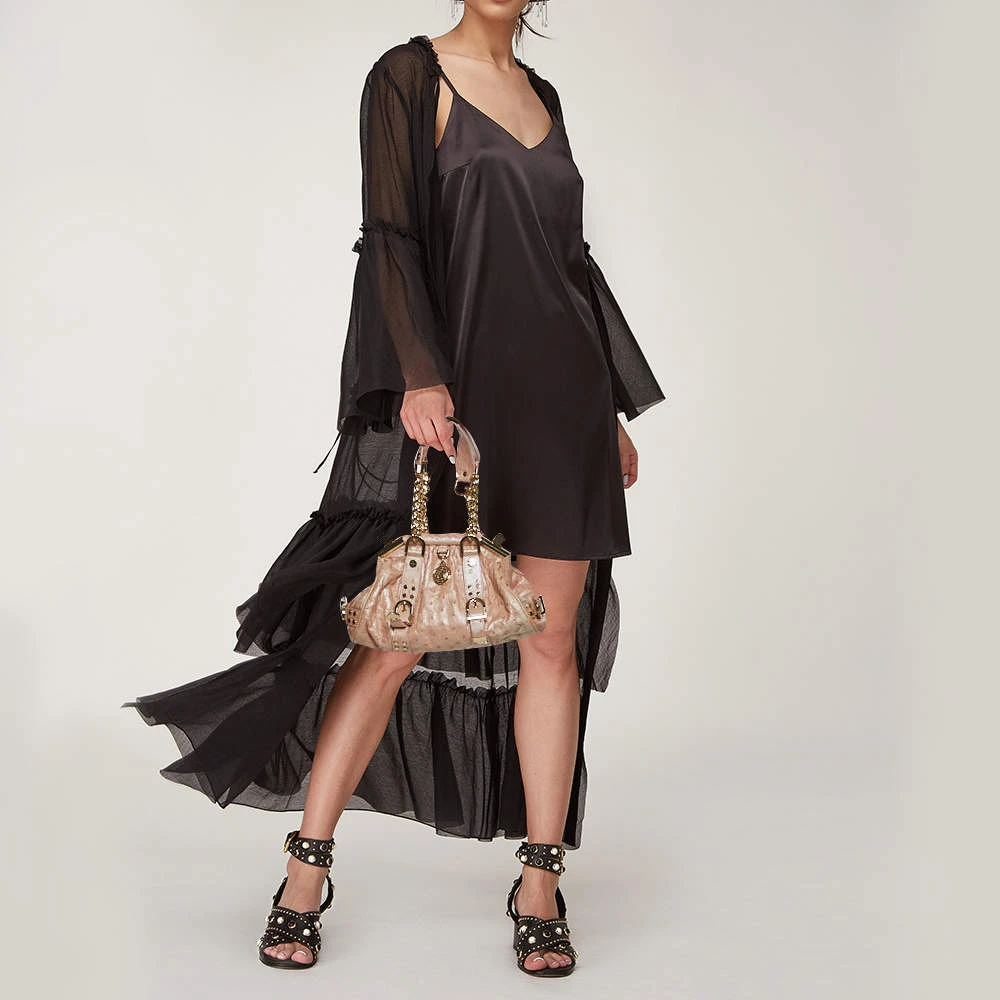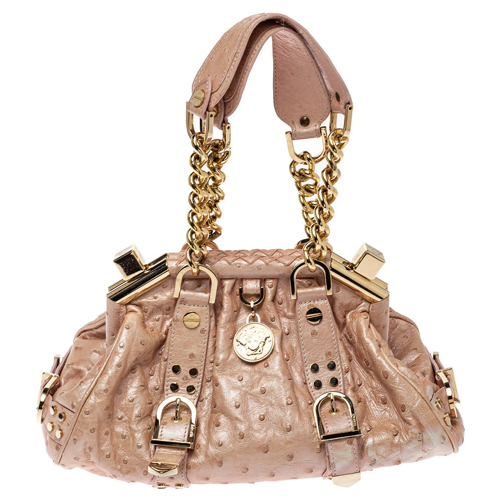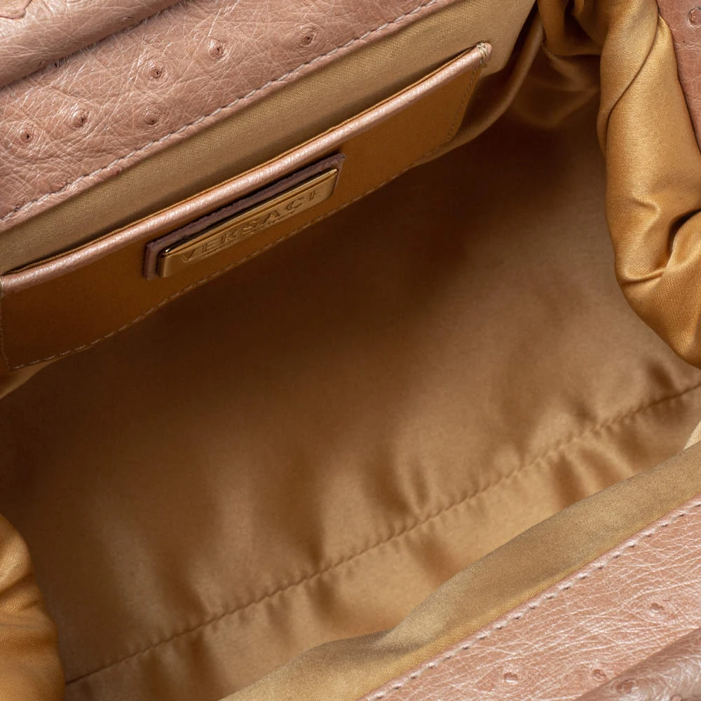 Special days call for special bags, and Versace has just the one for you. This gorgeous bag, sewn to perfection, is covered in a peach shade. It is constructed very carefully using metal frames and ostrich leather, thus exhibiting a tactile feel. Inside the satin interior, there’s enough space to house the essentials you would require. Two shapely handles and metal feet are added as a finishing touch to this exceptional creation. NOTE: FOR UAE CUSTOMERS ONLY