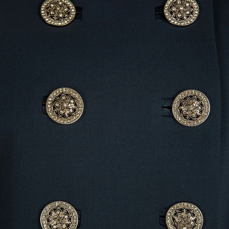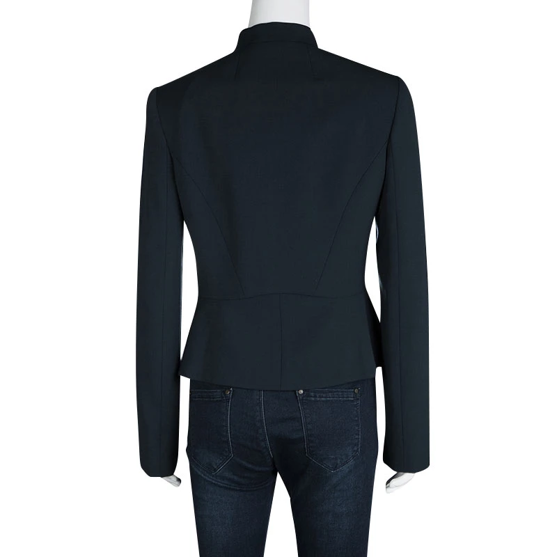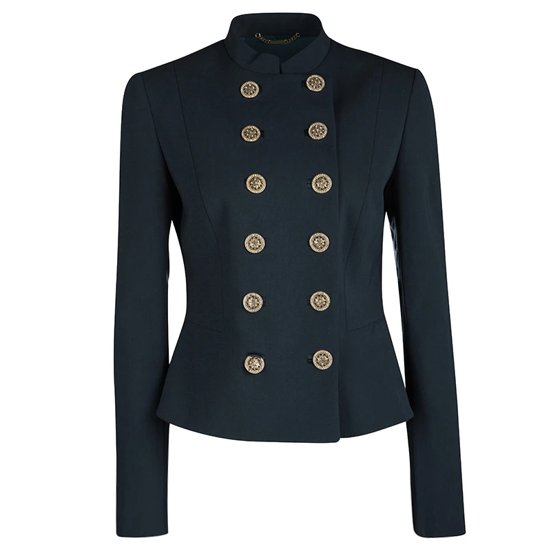 A jacket as finely tailored as this one from Versace deserves to be in your closet. It has been made from quality fabrics and it flaunts a peacock blue shade, double-breasted style, and a mandarin collar. It’ll look perfect with trousers and slingback sandals.