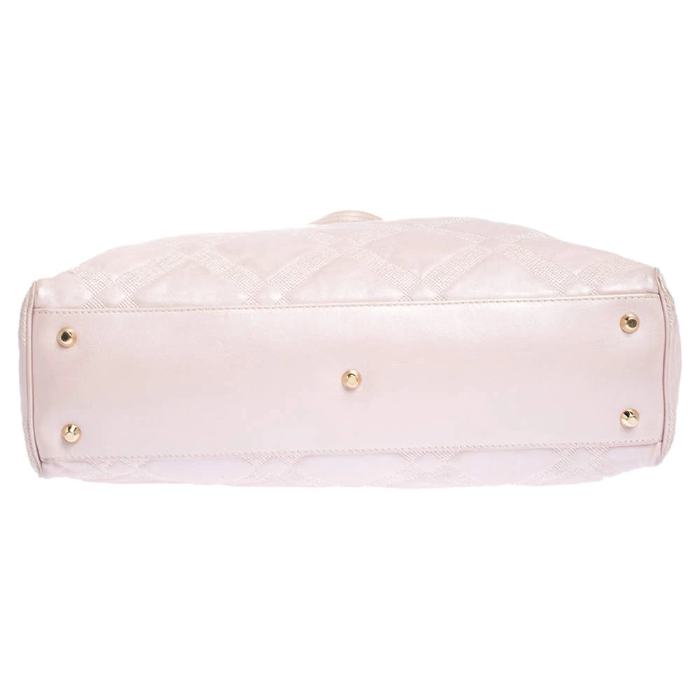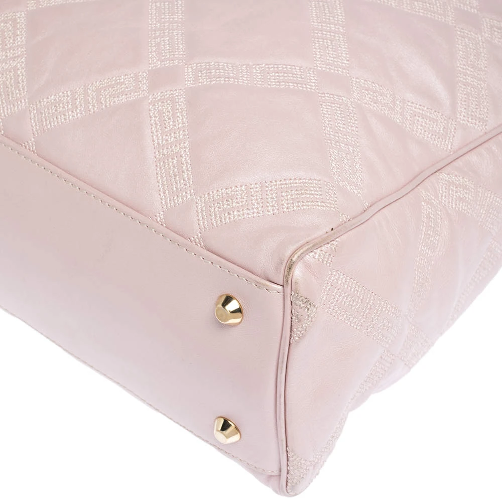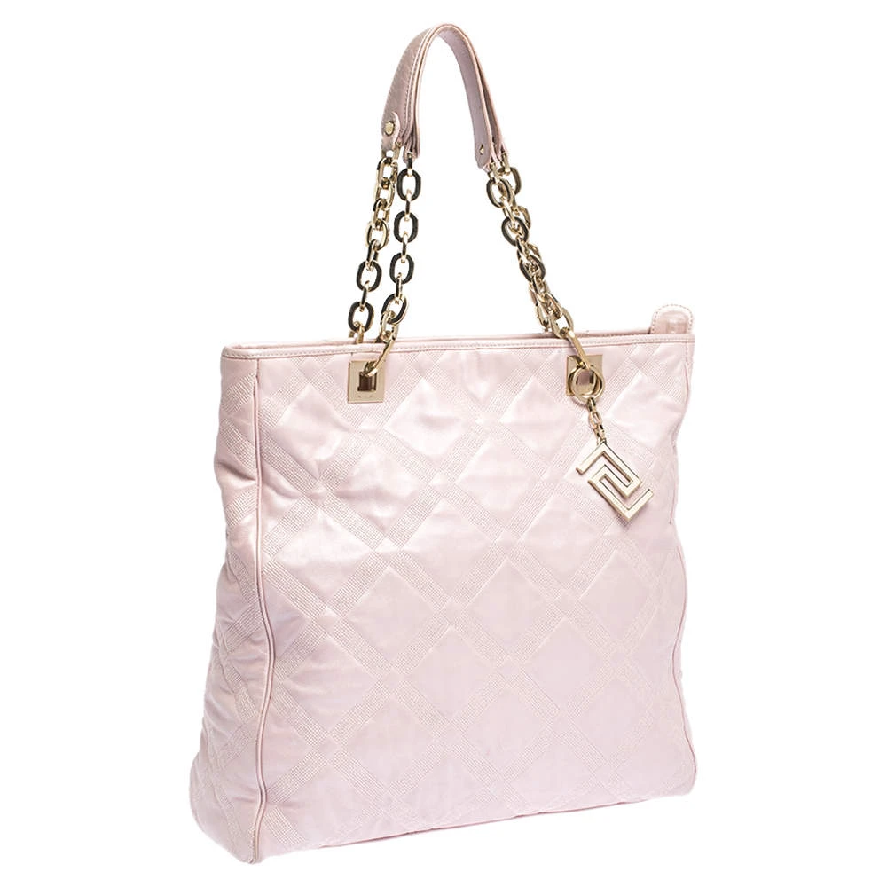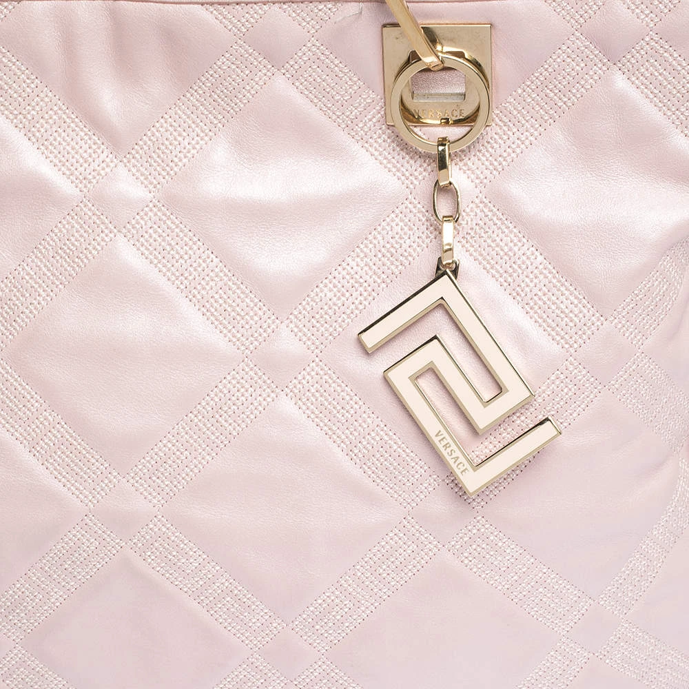 This elegant tote from Versace is crafted from pearl pink leather and is perfect for daily use. The bag features double chain handles with leather rest, protective metal feet, and gold-tone hardware. The nylon interior is spacious enough to hold all your belongings.