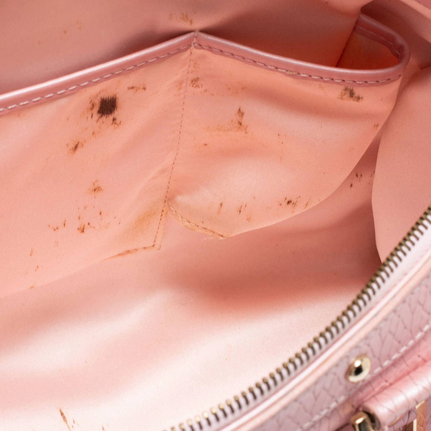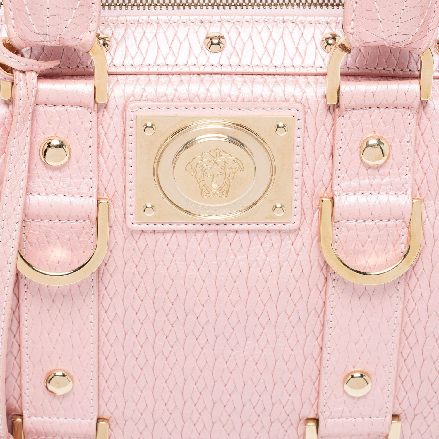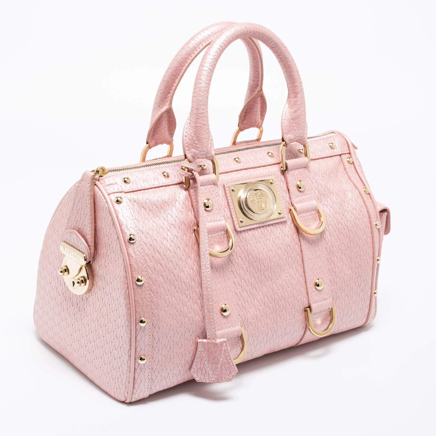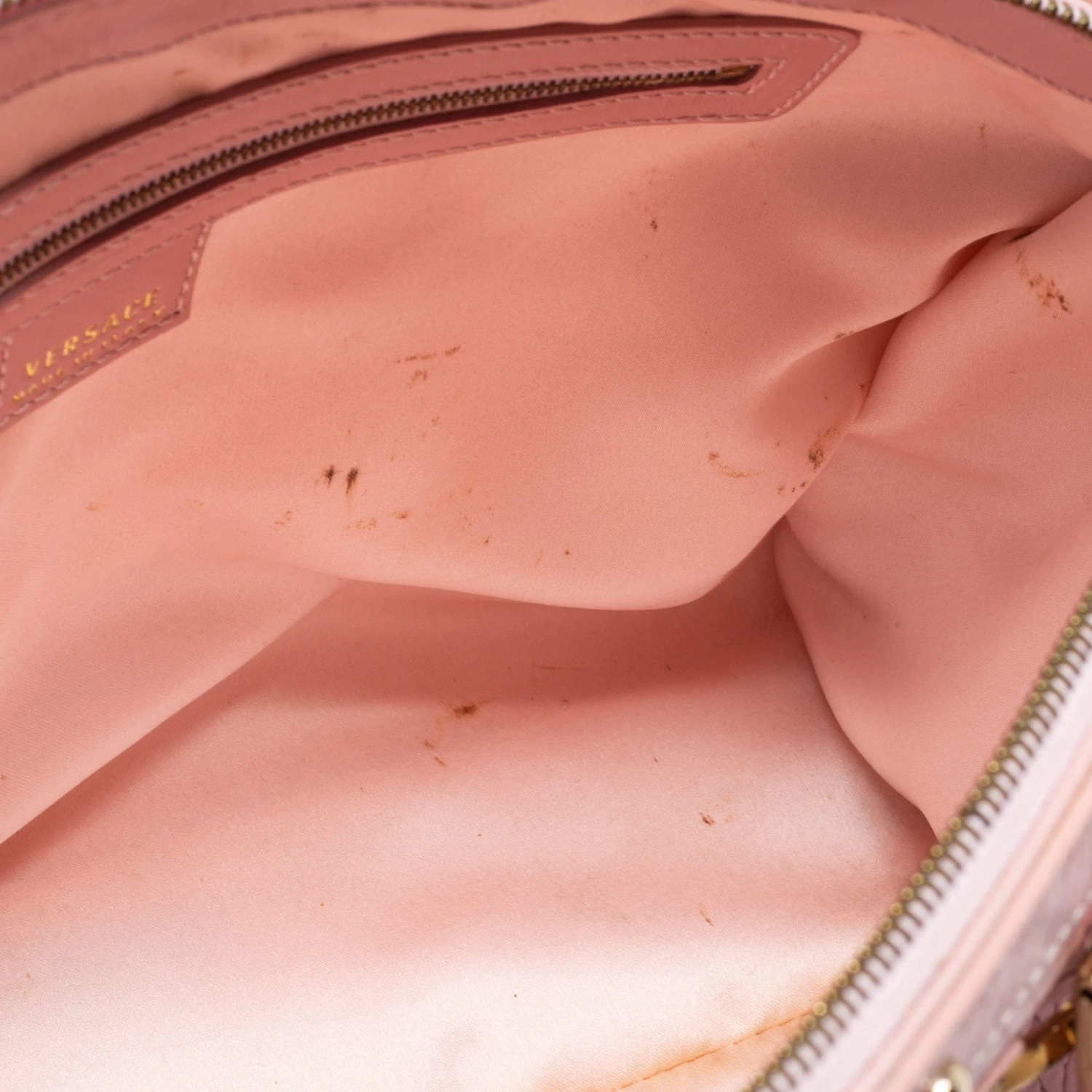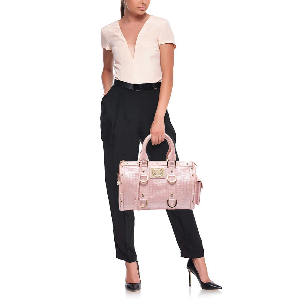 How gorgeous is this satchel from Versace! It carries an amazing design and a fabulous interplay of pink braided, embossed leather, and gold-tone hardware. It has a zip-top leading to a plush satin interior while being held by two top handles. The fabulous shape and the brand logo on the front uplift its beauty and make it a buy you will not regret.