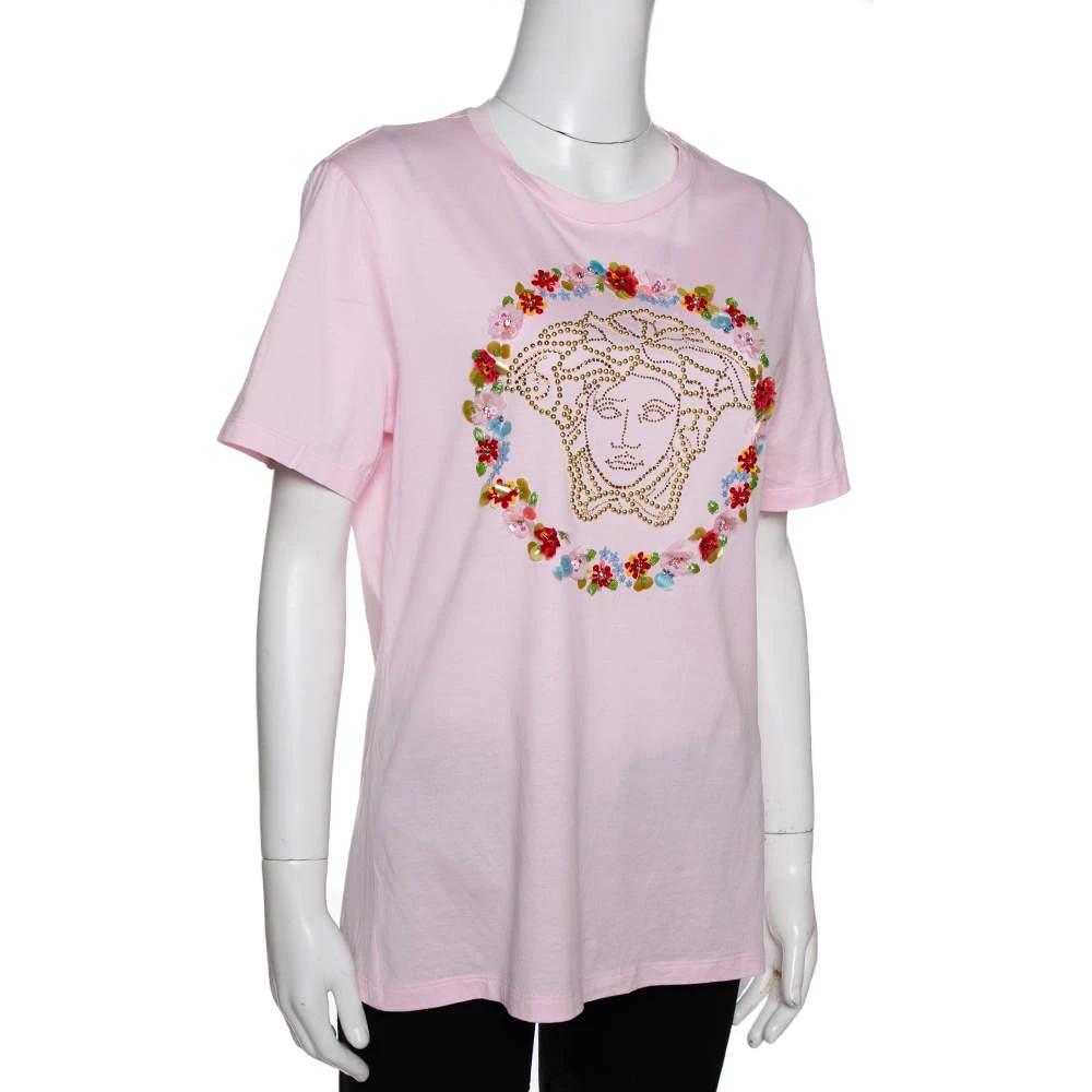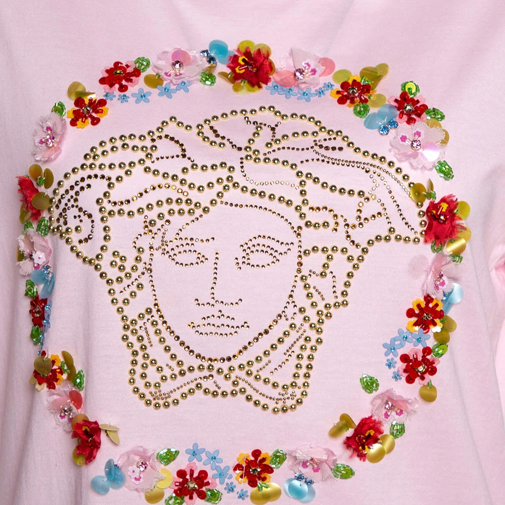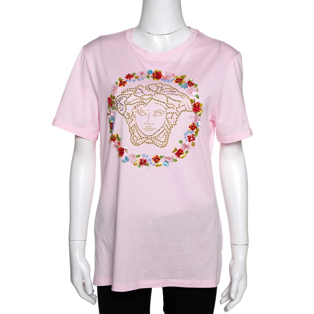 Characterized by the studded Medusa motif on the front outlined by floral appliques, this T-shirt by Versace is perfect for your casual style. It is pink in color and is designed with a crew neckline and short sleeves. Cut from cotton, grab this comfortable piece of clothing today!