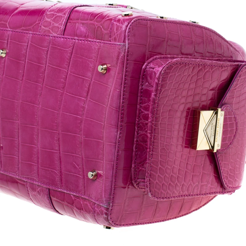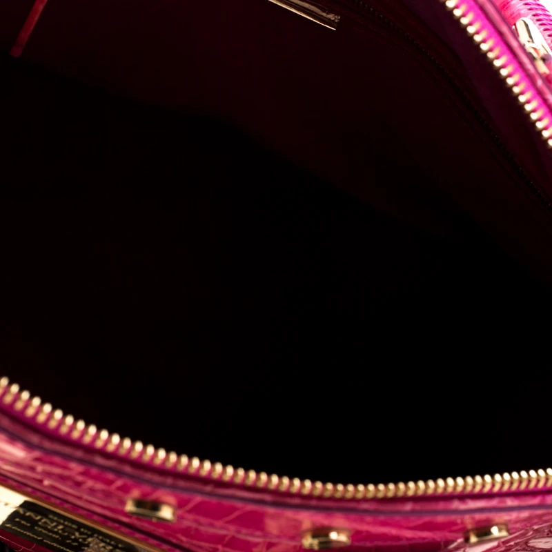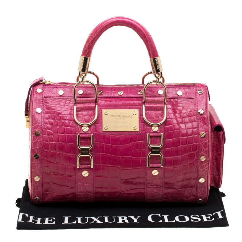 Crafted to perfection is this Versace ‘Snap Out Of It’ satchel in crocodile leather. It features dual top handles, gold-tone hardware, one side pocket and the metal brand plaque on the front. The top zip closure opens to a suede-lined interior housing enough space to store your necessities. The satchel is complete with protective metal feet.