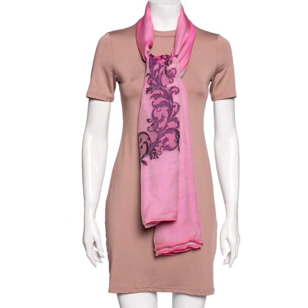 Presented by the House of Versace, this scarf is a beautiful accessory that will make you look polished and stylish! It is made from pink and lavender logo printed Fil Coupe silk fabric. This scarf has a length of 180 cm. Add this creation to your collection today!