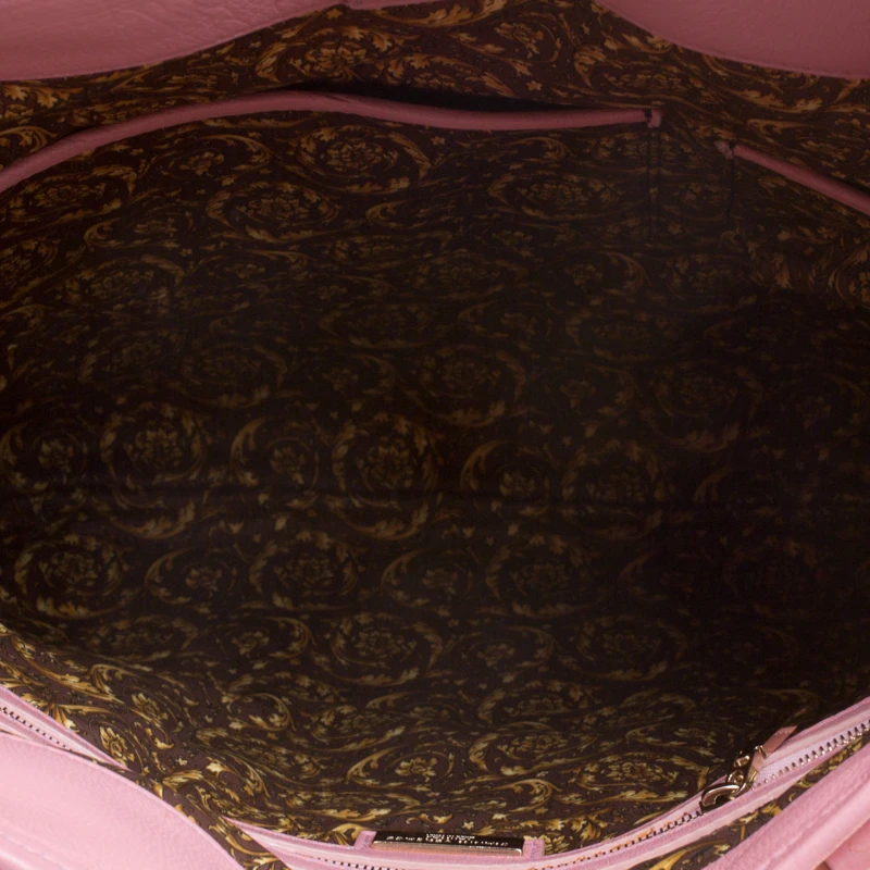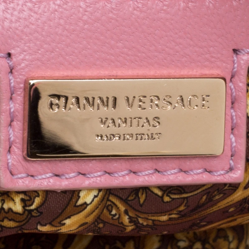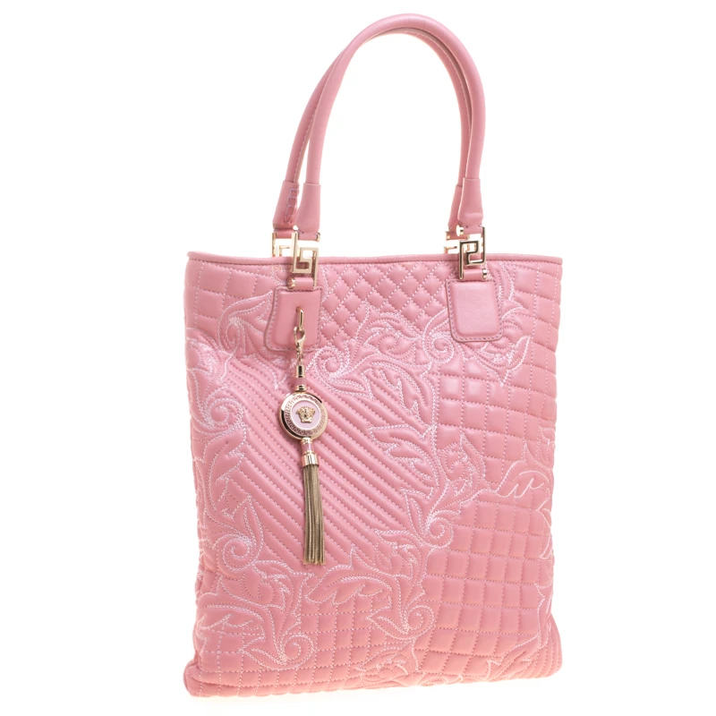 Swing with pride this pretty pink tote that comes crafted from leather and designed with luscious embroidery. The bag is from Versace and it has a spacious satin interior, two top handles, and a detachable charm.