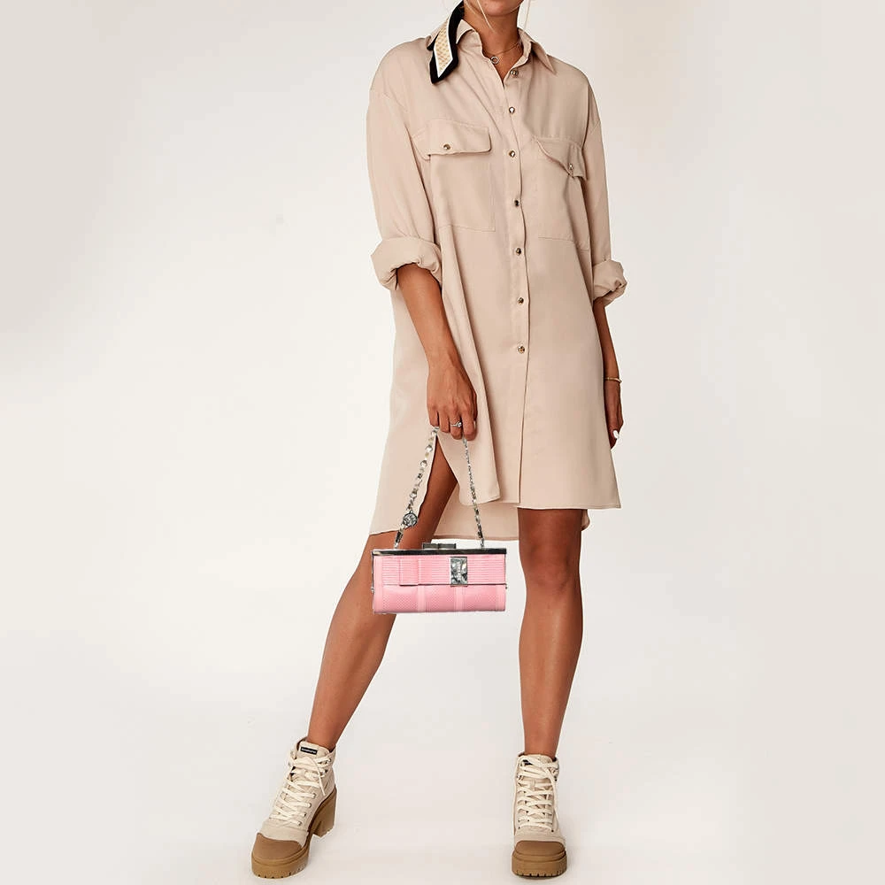 This clutch from Versace has an appealing design, perfect to complement an evening dress or a party ensemble. Crafted from pink leather and gold-tone metal, the creation features a bow embellishment, a well-lined interior, and a woven chain strap.