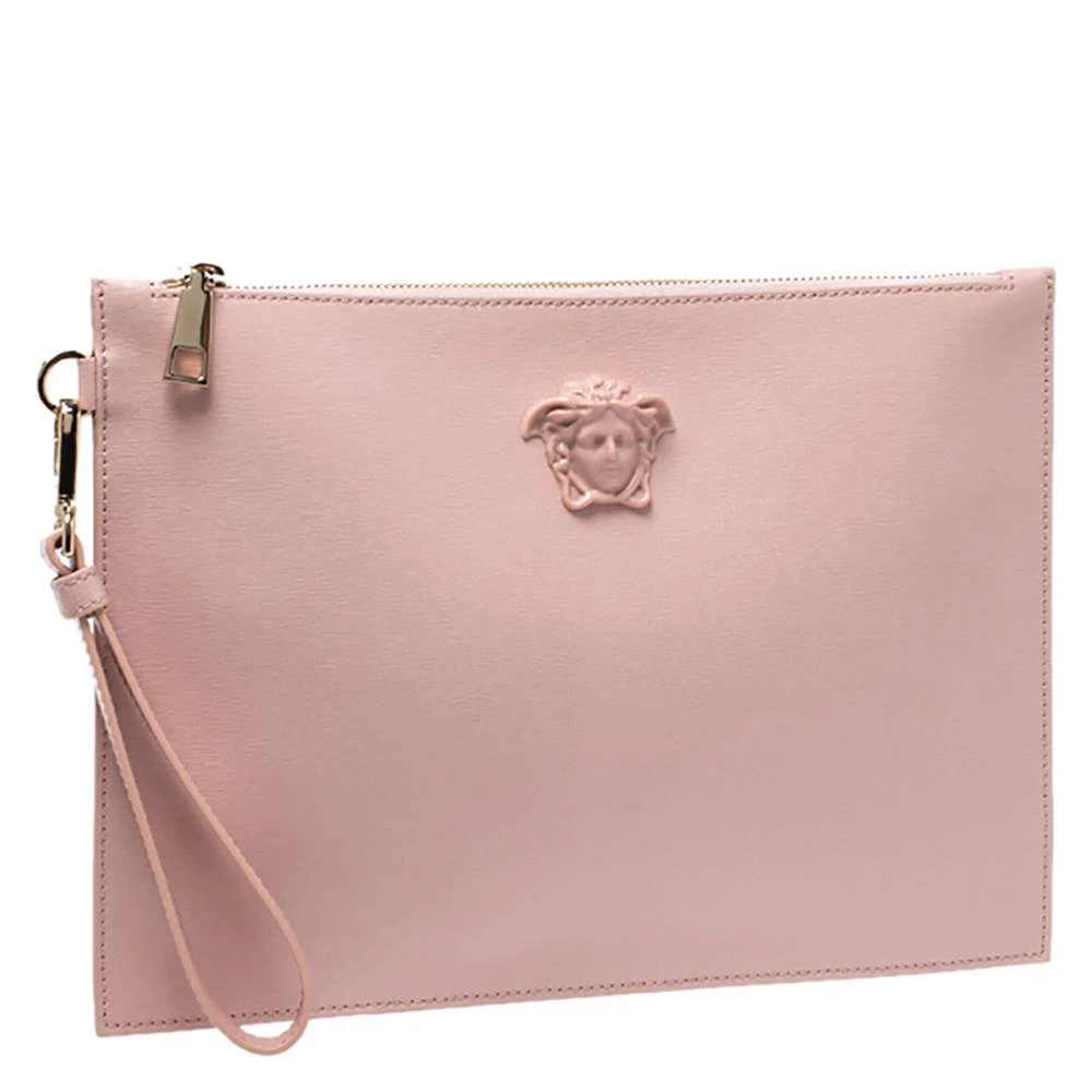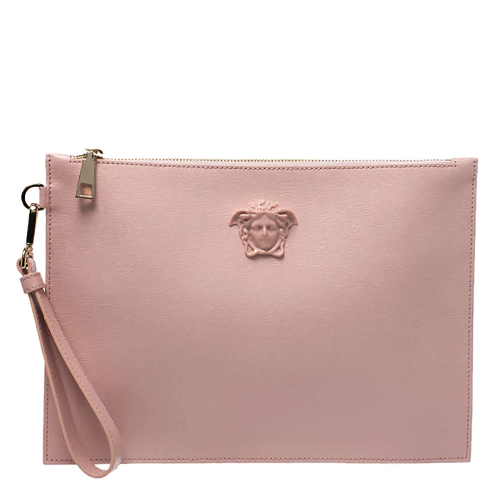 This Versace clutch is great for special occasions and will make sure you stand out from the crowds. Crafted in Italy, it is made from quality leather and comes in a lovely shade of pink. It is styled with the iconic Medusa motif on the front that adds interest, gold-tone hardware and a zip closure that leads to a fabric interior. It is finished with a wristlet strap.