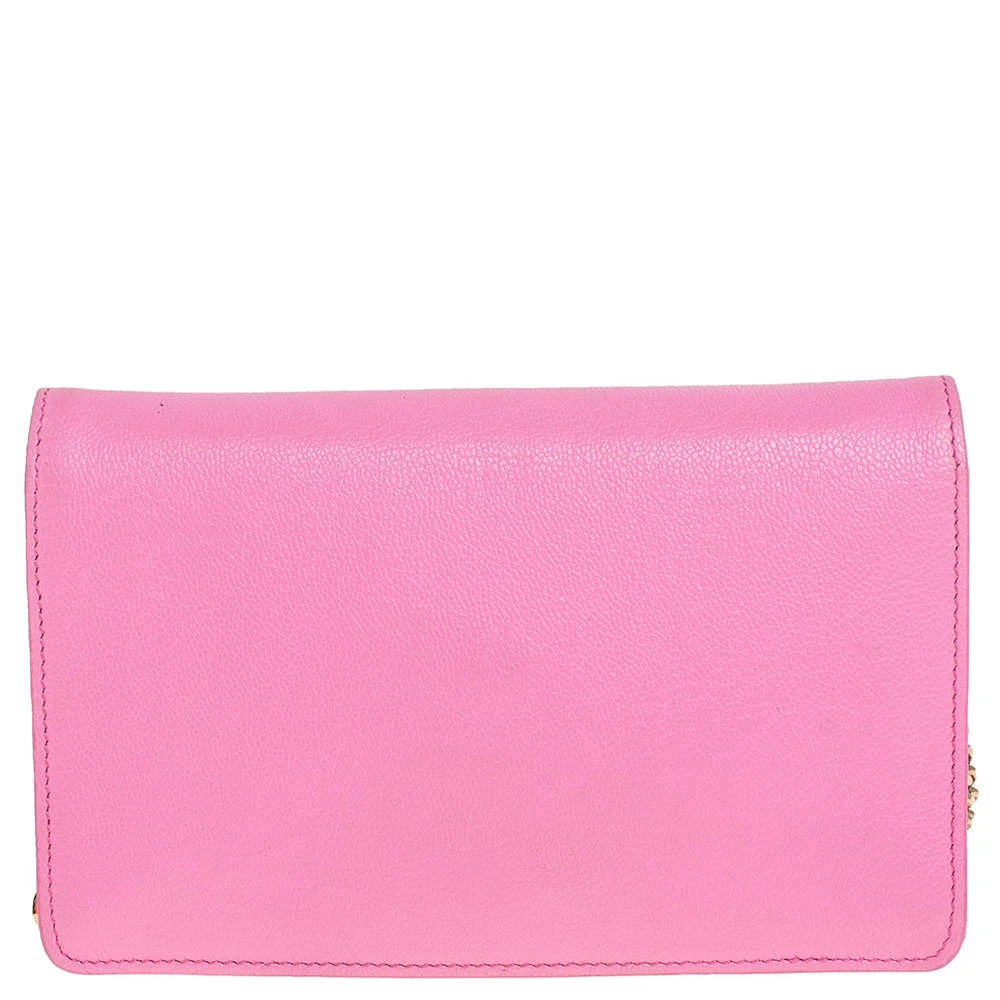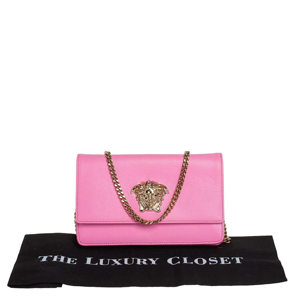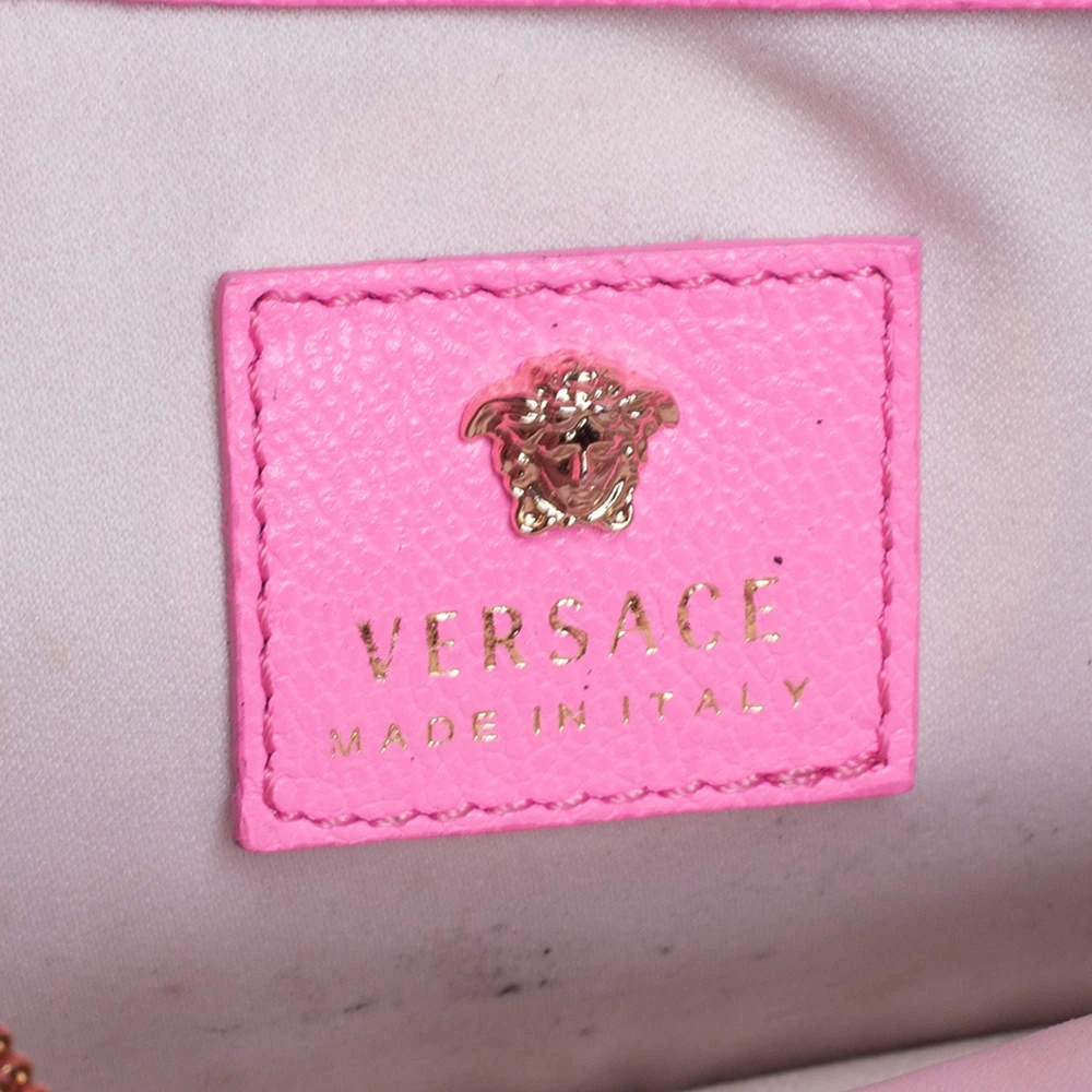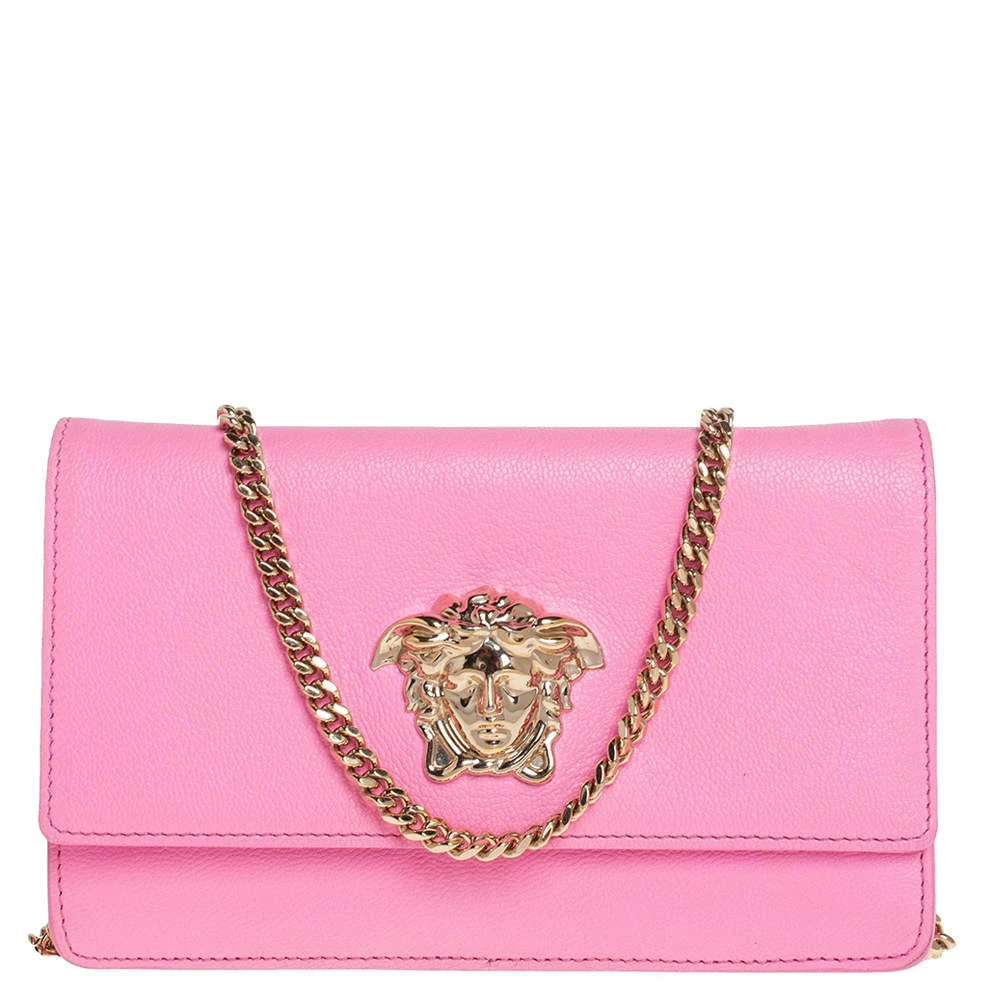 This bag from Versace is designed in a pink leather body. It brings a Medusa-adorned flap to secure the interior which is lined with fabric. It comes held by a gold-tone chain and is perfect for evenings.