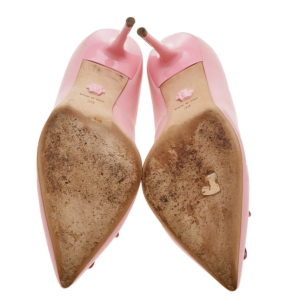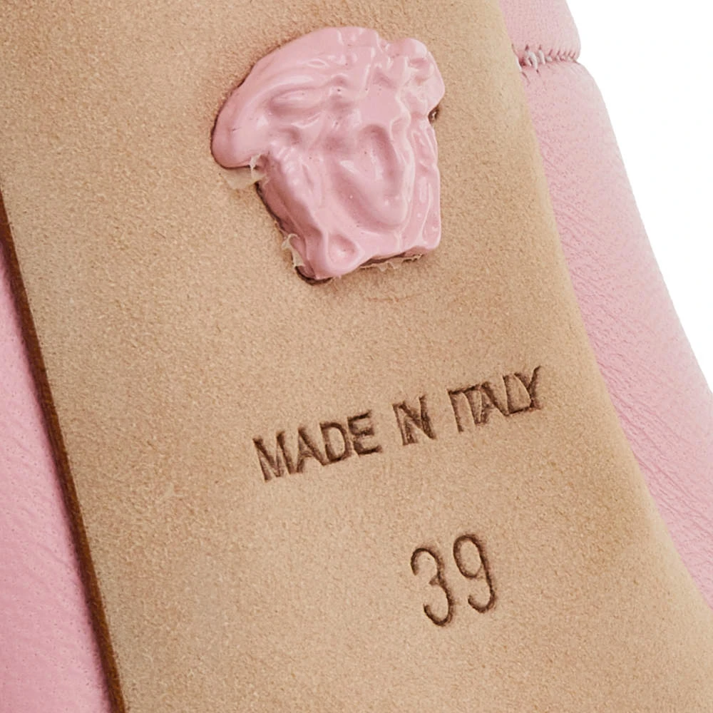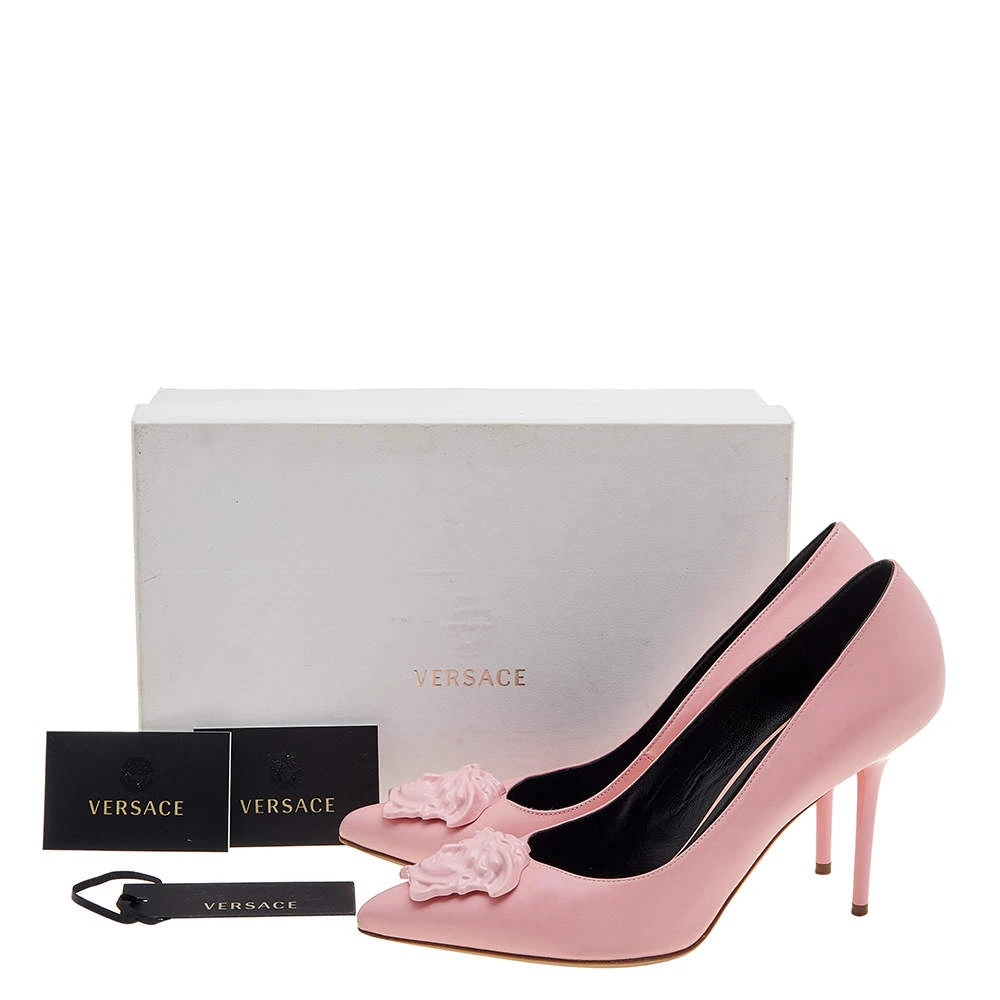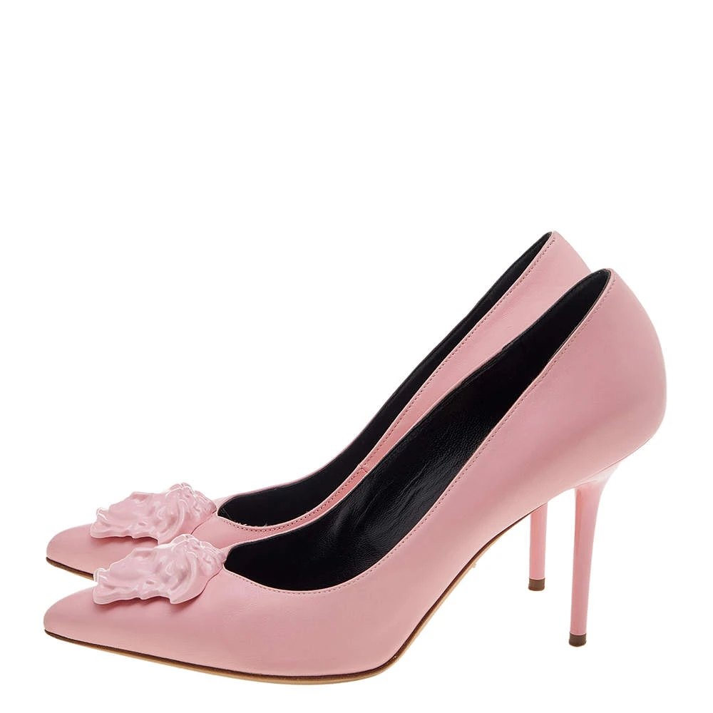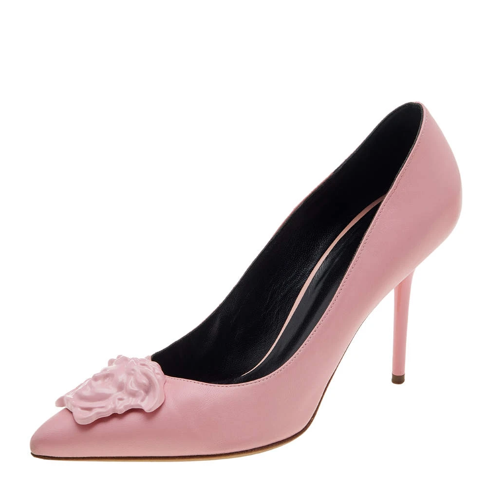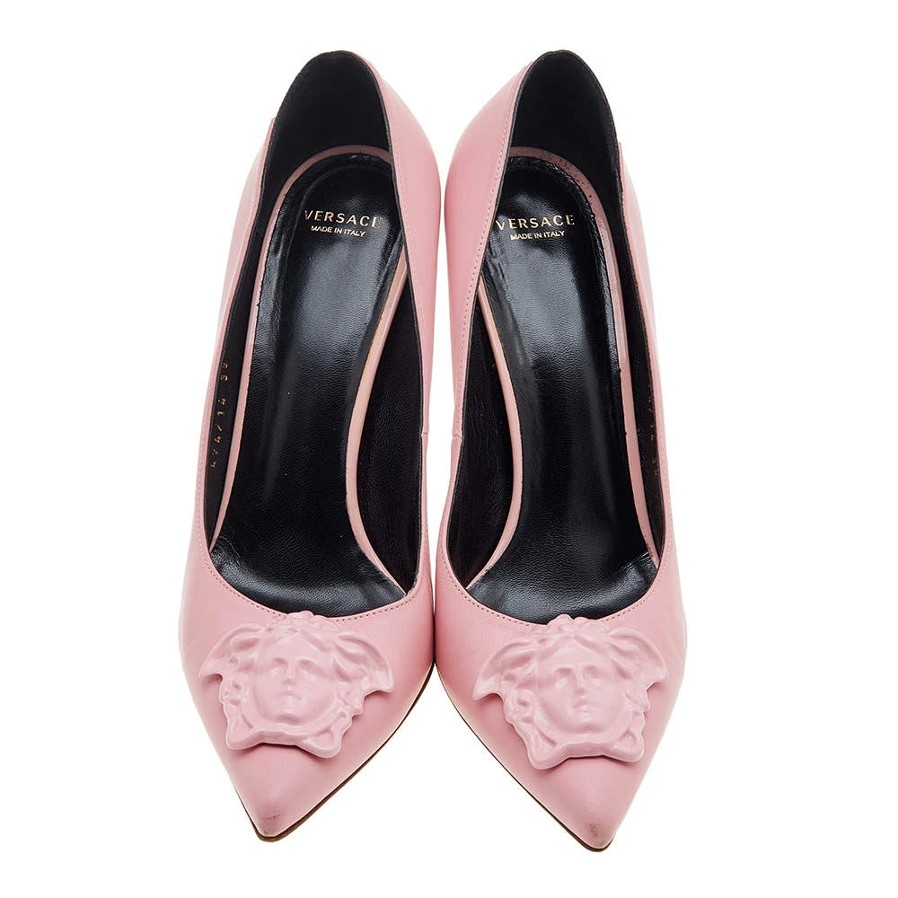 This pair of Versace pumps are a style statement with a timeless design. Crafted from pink leather, they feature pointed toes accented with the iconic Medusa motifs in a matching pink color. They are complete with slender heels and sturdy leather soles.