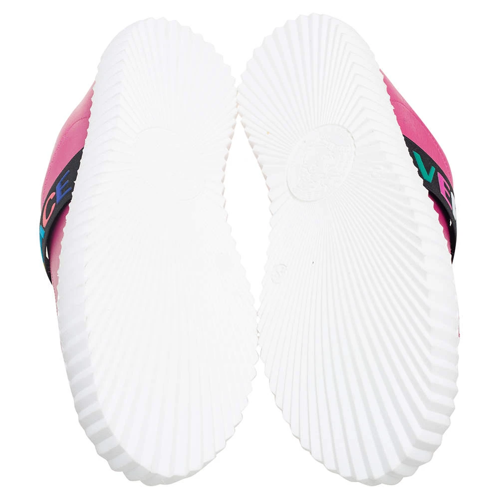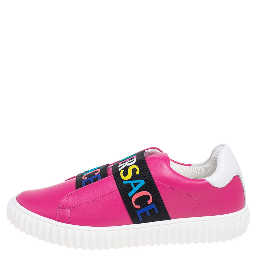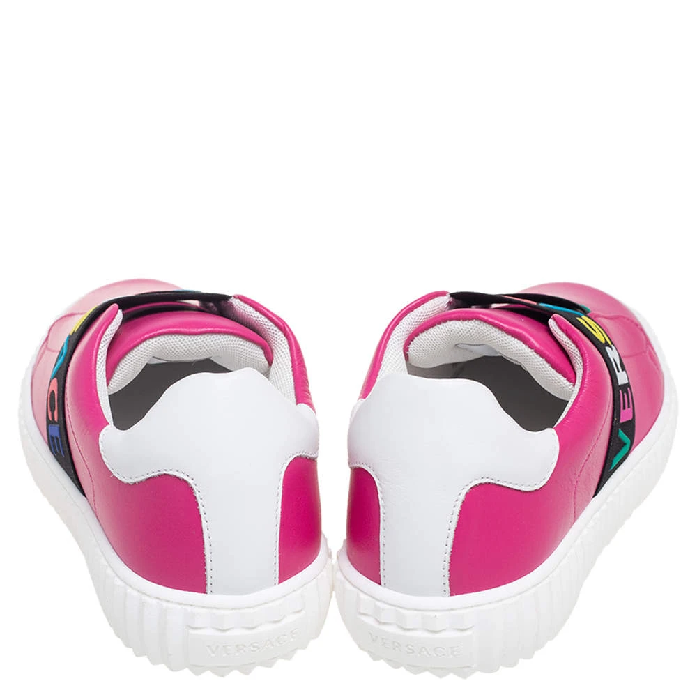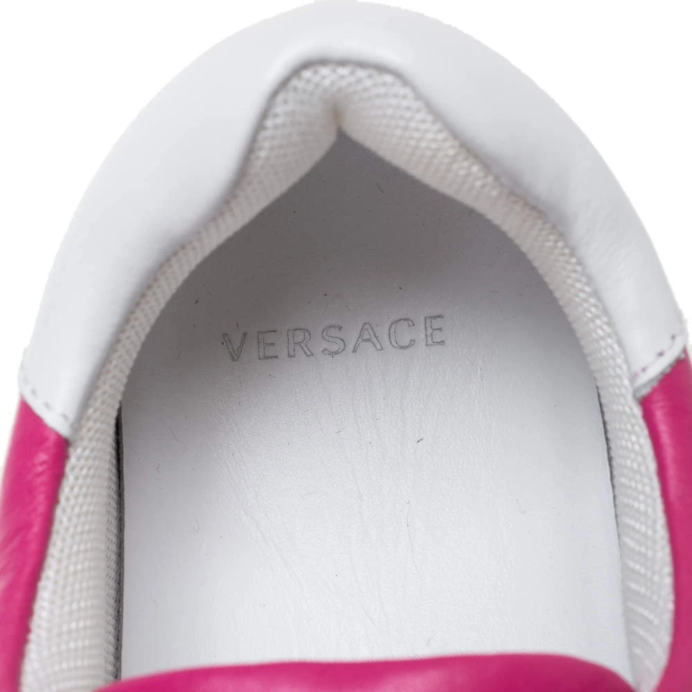 Coming with a classic low-top silhouette, these Versace sneakers are a seamless combination of luxury, comfort, and style. They are made from quality materials in a pink shade. These sneakers are designed with black straps on the vamps detailed with colorful logo lettering, rubber soles, and comfortable insoles.