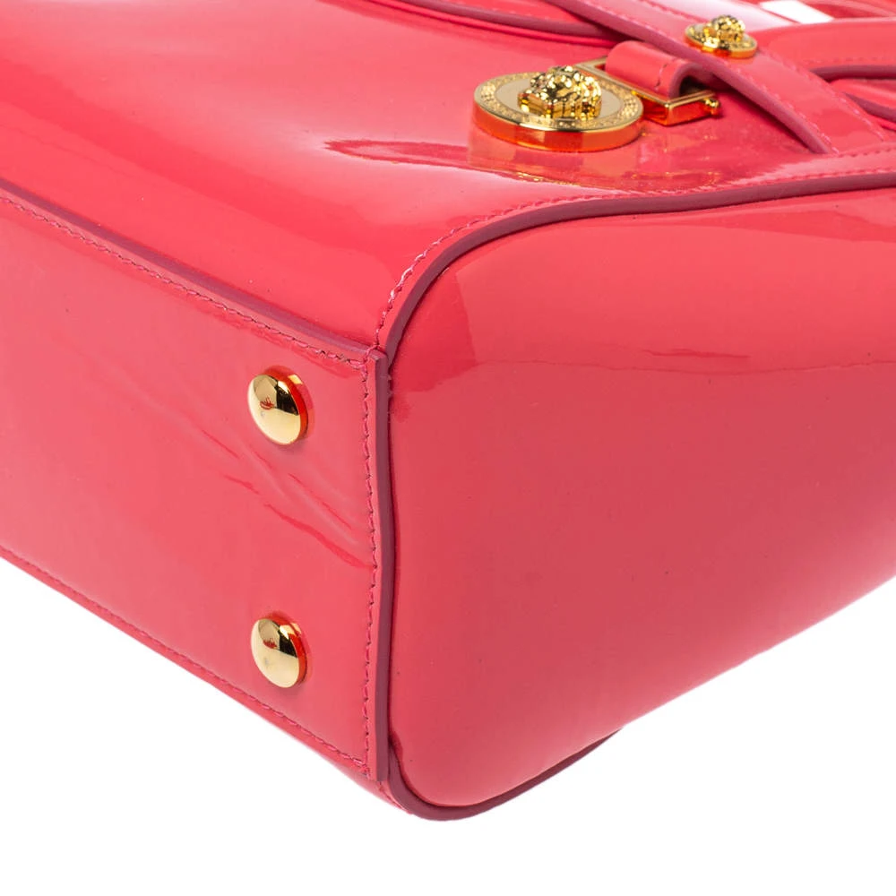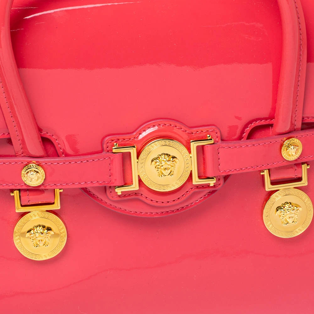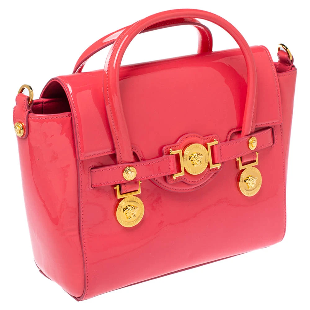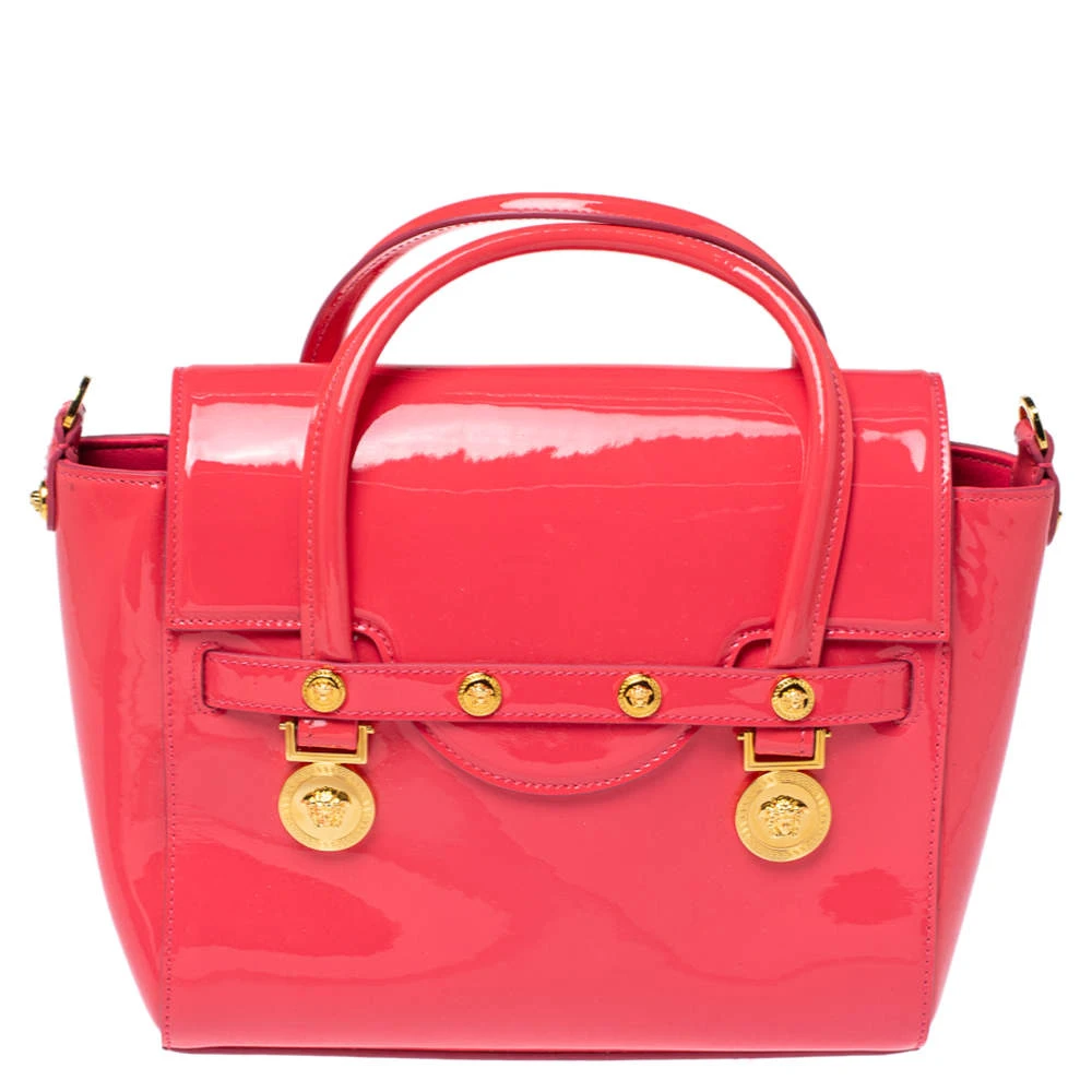 Sophisticated and luxe, this bag from Versace definitely needs to be on your wishlist. The bag is crafted from patent leather in a lovely pink shade, and it features a structured silhouette. It flaunts dual handles, a removable shoulder strap, and the famous Medusa logo on the front. The spacious satin interior houses slip pockets.