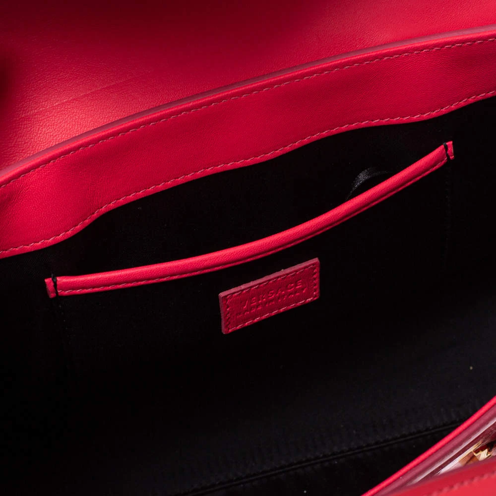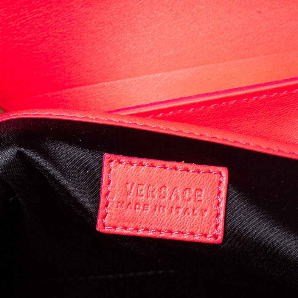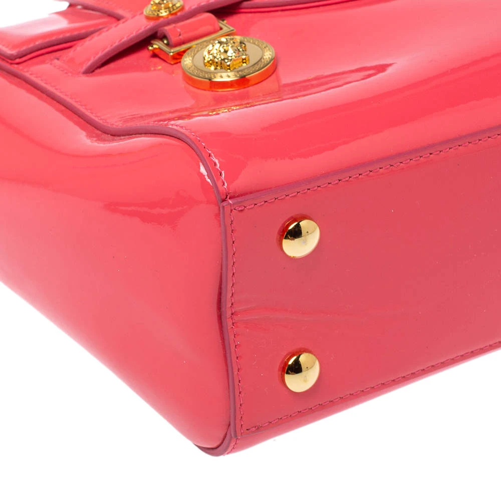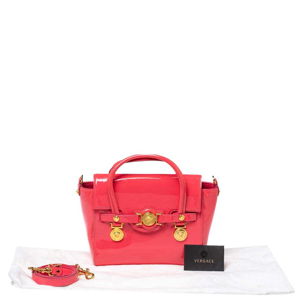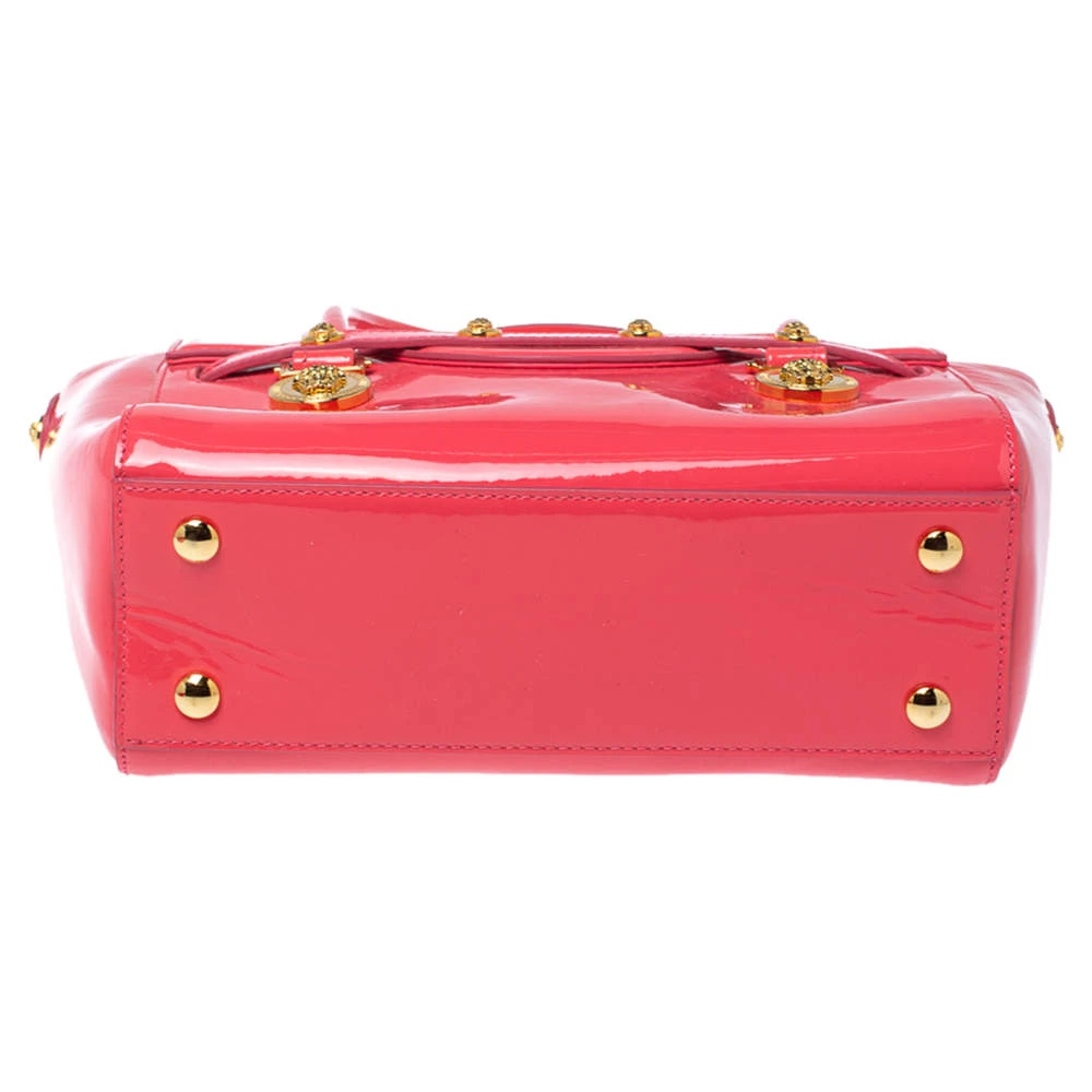 Sophisticated and luxe, this bag from Versace definitely needs to be on your wishlist. The bag is crafted from patent leather in a lovely pink shade, and it features a structured silhouette. It flaunts dual handles, a removable shoulder strap, and the famous Medusa logo on the front. The spacious satin interior houses slip pockets.