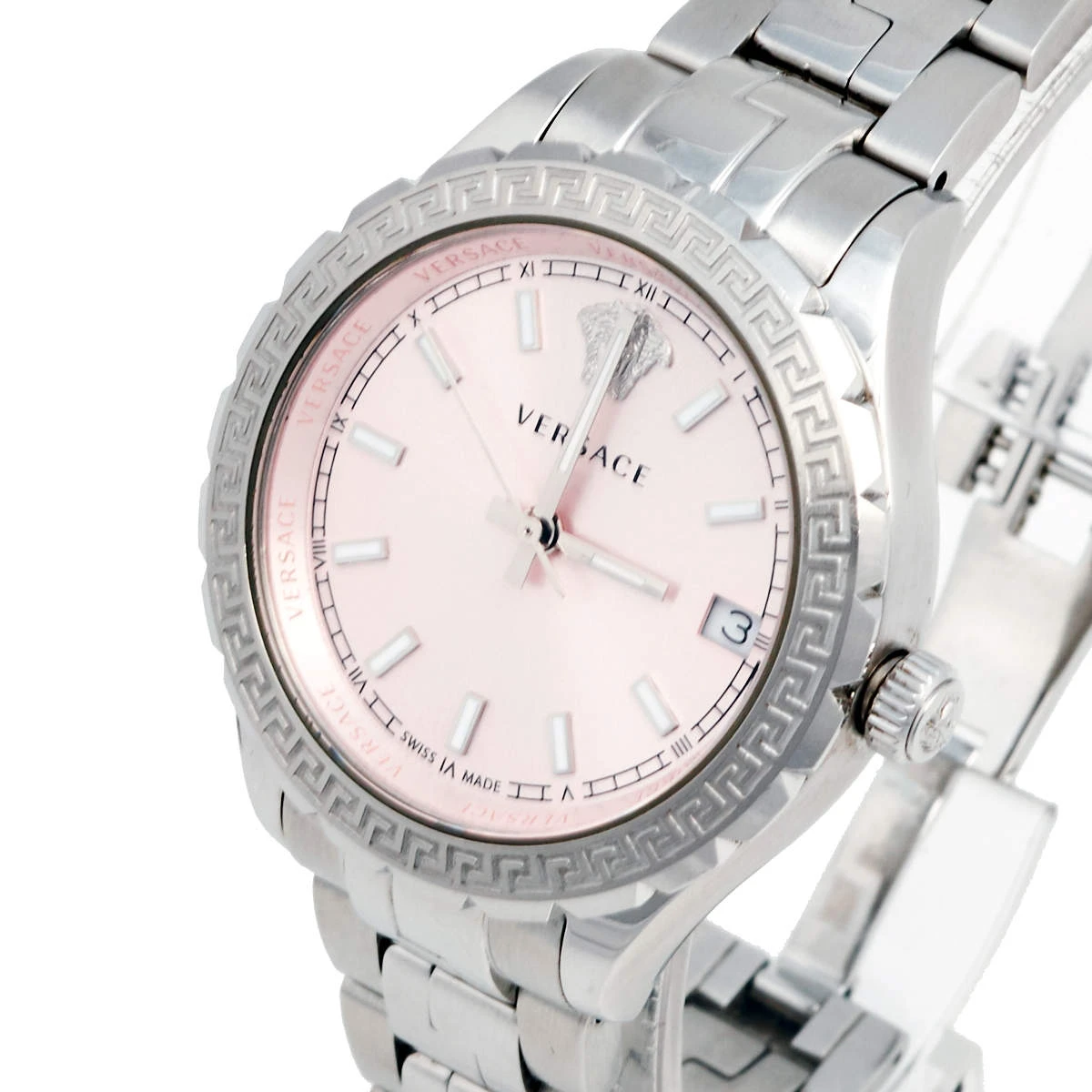 Let this impressive wristwatch by Versace adorn your wrist and grant you a touch of luxury. It is made from stainless steel and on its pink dial, there are hour markers, a date window, and the Medusa head at the 12 o’clock position. The bezel shows the signature Greca engravings, a feature that enhances its design and is finished with a push-button clasp.