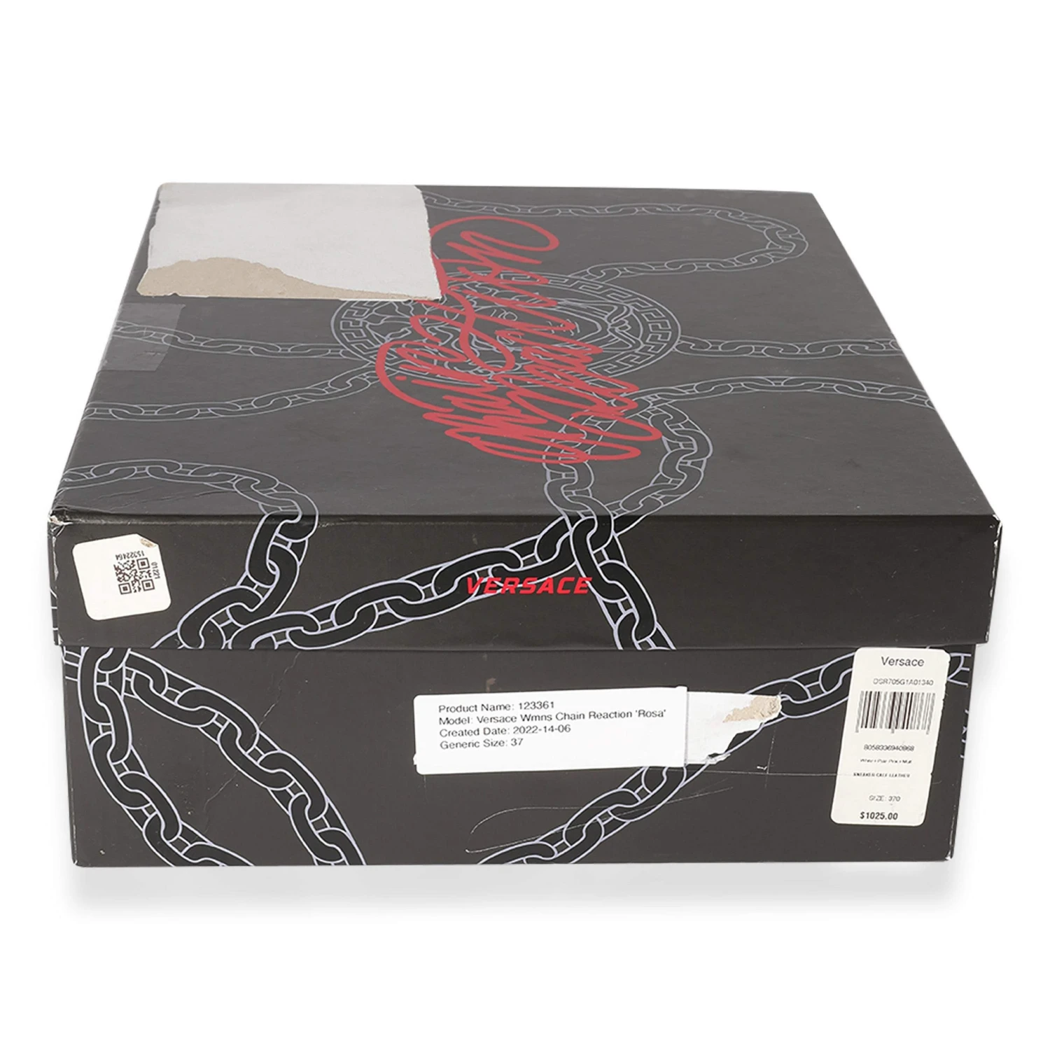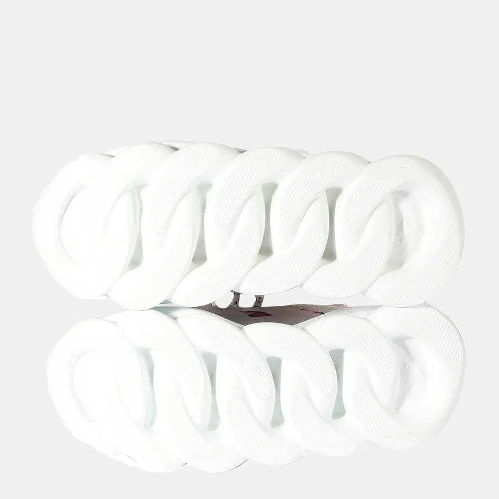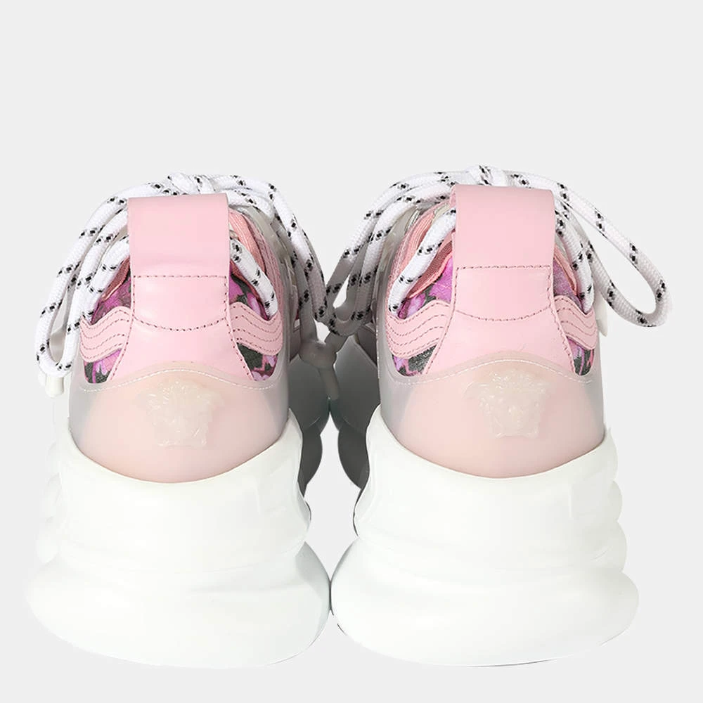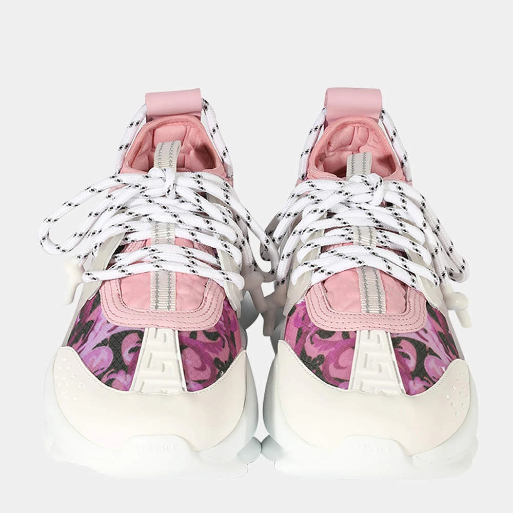 These stylish Versace sneakers strike the right balance between trendy and chic. Featuring a beautiful pink and white print, these cool sneakers are set on a chain-linked rubber sole inspired by iconic Versace chain jewelry. Other signature details include the iconic Greek Key pattern, the ‘Chain Reaction’ logo patch, a white toe cap, and dipped laces.