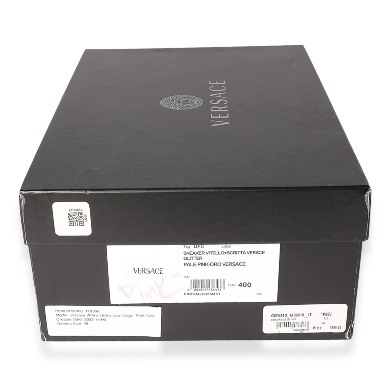 Embrace everyday chic styling with these attractive Versace low-top sneakers. Distinguished by sleek, clean lines, this stylish pink pair features a leather upper, a lace-up front, the graphic Greca pattern on the midsole, a lateral logo in a golden hue, and a hidden Medusa on the outsole at the heel.