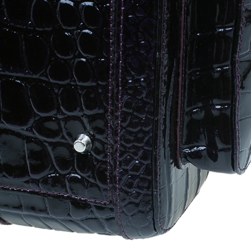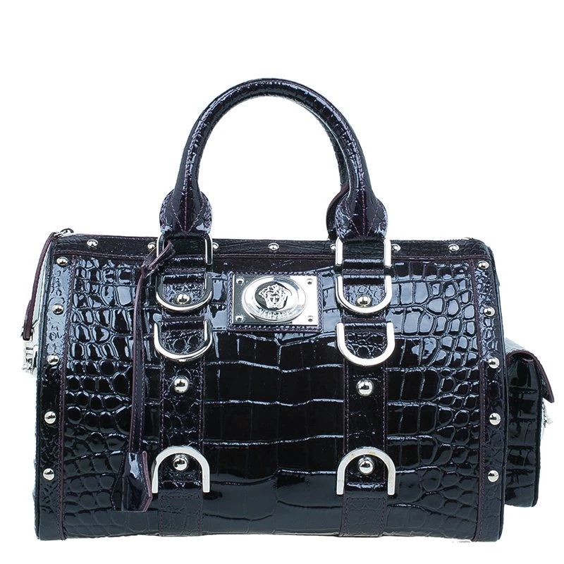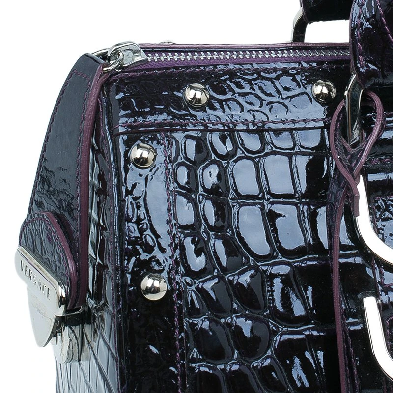 This over the top Versace Snap Out Of It satchel is a bold statement-making bag from the fashion-forward Italian label. Crafted from purple croc embossed patent leather, it is accented with rolled double handles, a Gianni Versace Couture plate, a side pocket, and silver-tone studded hardware. The interior is lined with satin and features a zip pocket. It will bring just the right amount of glamour to understated evening ensembles.