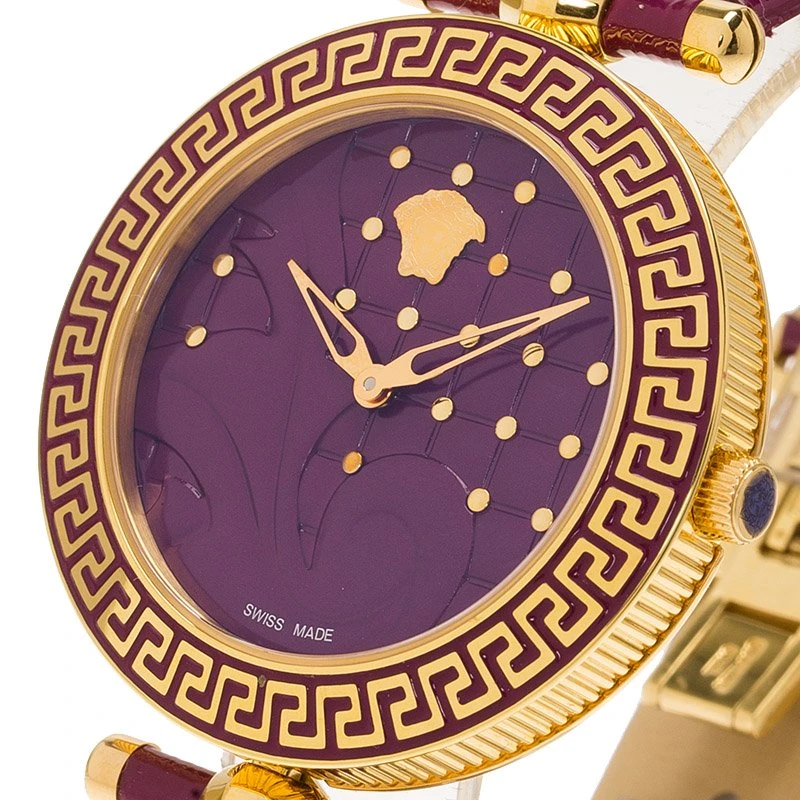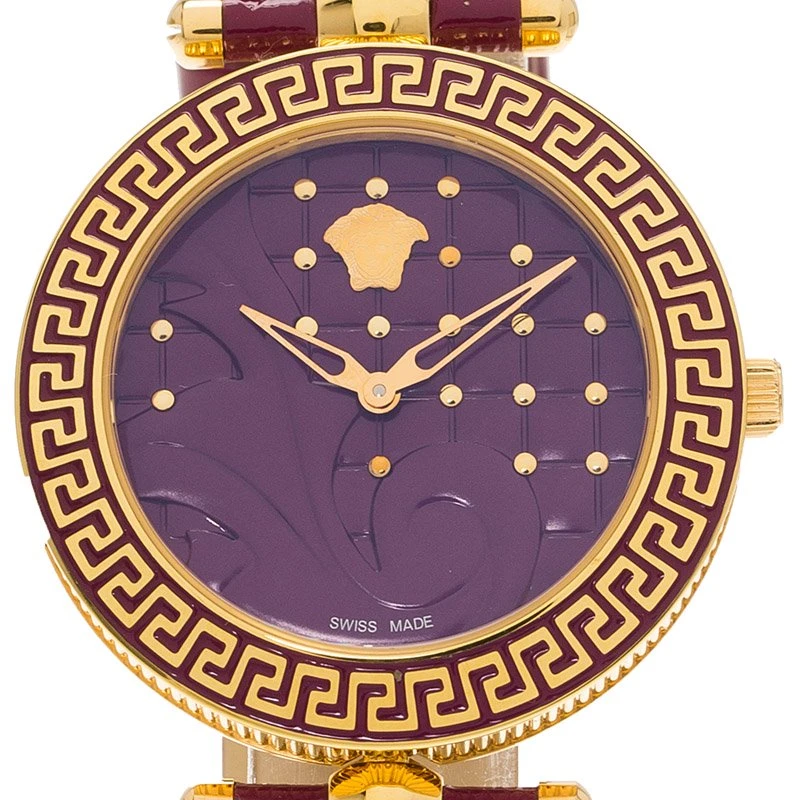This wristwatch is a member of the famous “Vanitas” collection from Versace. This purple toned wristwatch exceptionally flatters the gold-plated stainless steel case and hardware. The feminine attributes are meticulously reflected through its remarkable design. Wear yours at a select occasion.