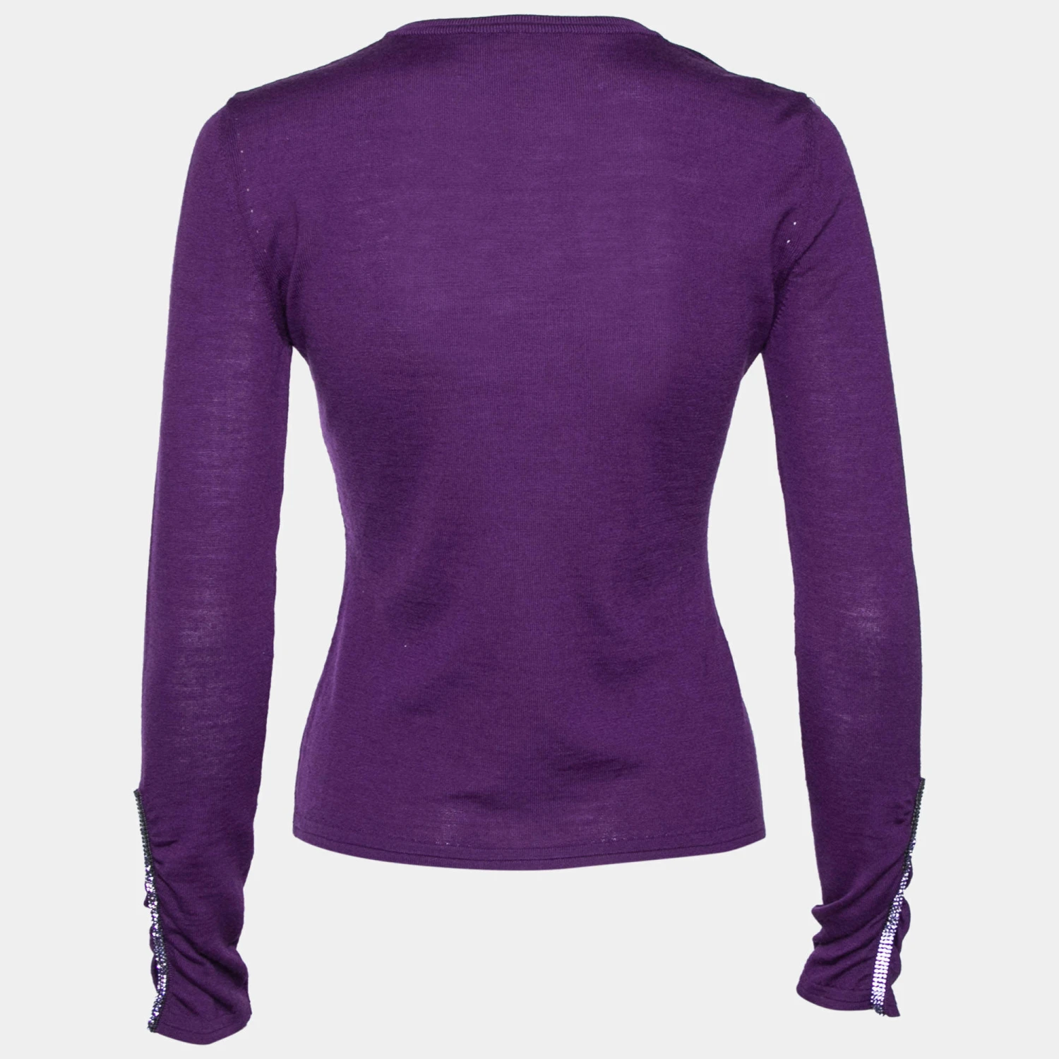 Update your winter wardrobe with this classy sweater from Versace. Cut from purple knit fabric, this top is adorned with crystal embellishments and ruched formations. It has long sleeves and a V-shaped neckline. Make a luxe fashion statement as you wear this gorgeous creation.