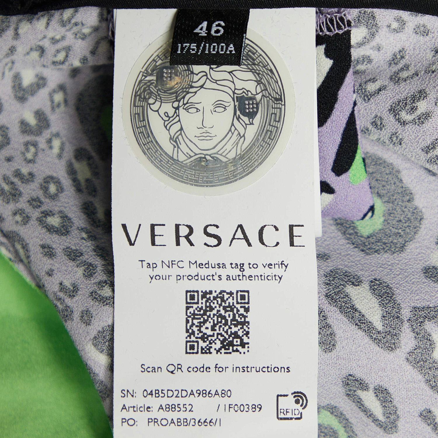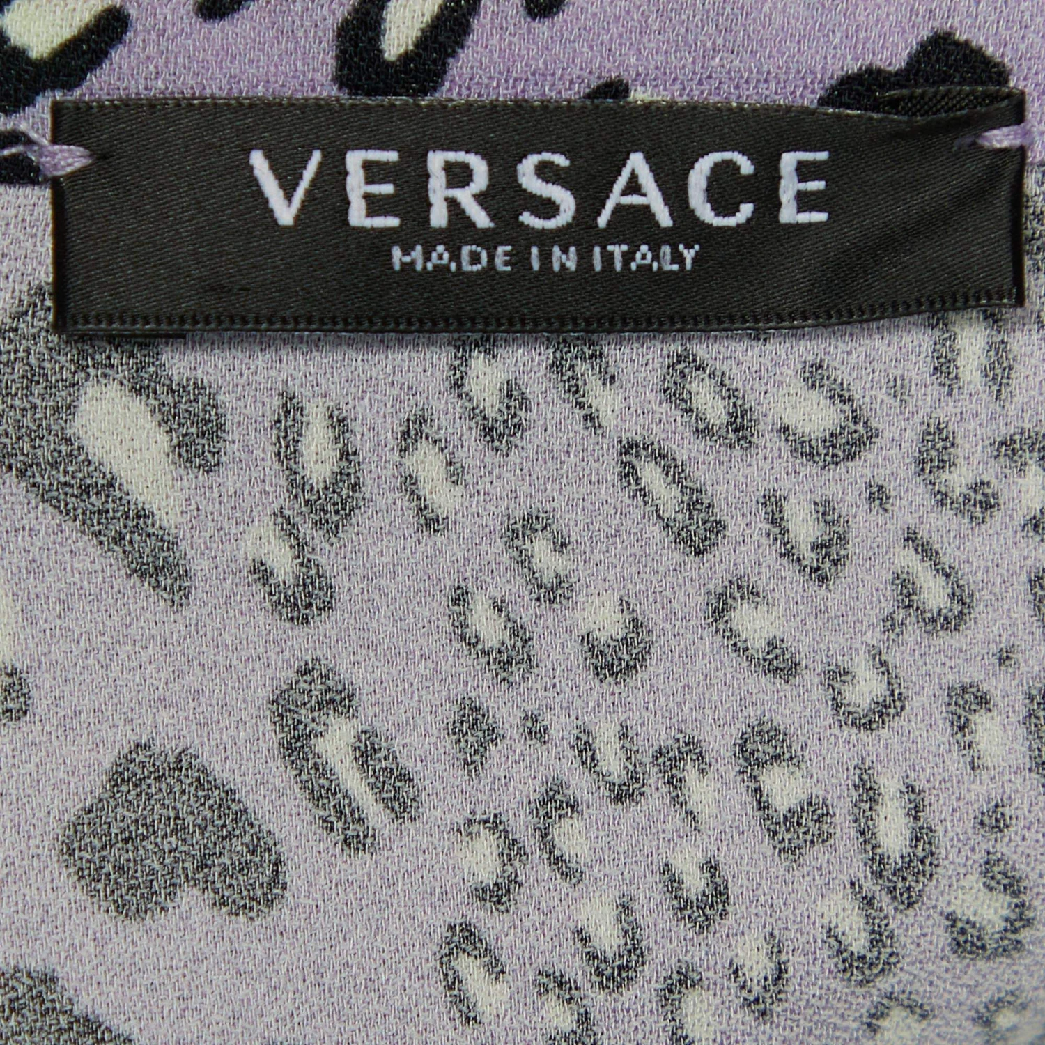 This crop top from the House of Versace is here to make you look fashionable. It is tailored using purple knit fabric, which is enhanced with leopard prints. It showcases a cropped fit and long sleeves. Wear this Versace top with high-waisted pants or denim for casual outings.