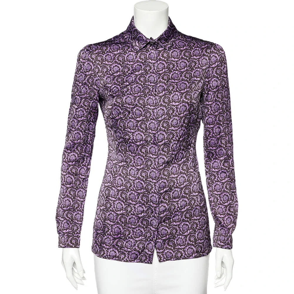 Tailored with precision using a silk blend, this purple shirt from Versace will be a staple addition to your closet. It features long sleeves, full front buttons, and prints all over. It will complement both skirts and pants.
