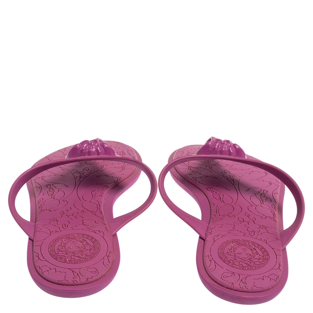 These Versace thong flats are made from rubber just so you can wear them at pools, beaches, or lounge around in them. They come in a purple shade and feature the label’s Medusa logo on the vamps for a signature finish.