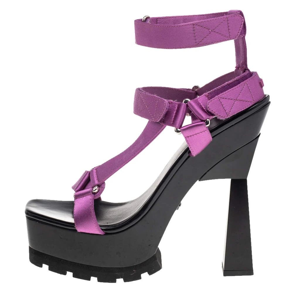 Don’t miss out on making these unique sandals yours this season. They are by Versace, carefully crafted to exude nothing but high fashion. The sandals feature satin velcro straps in purple hue, 15.5 cm heels, and platforms.