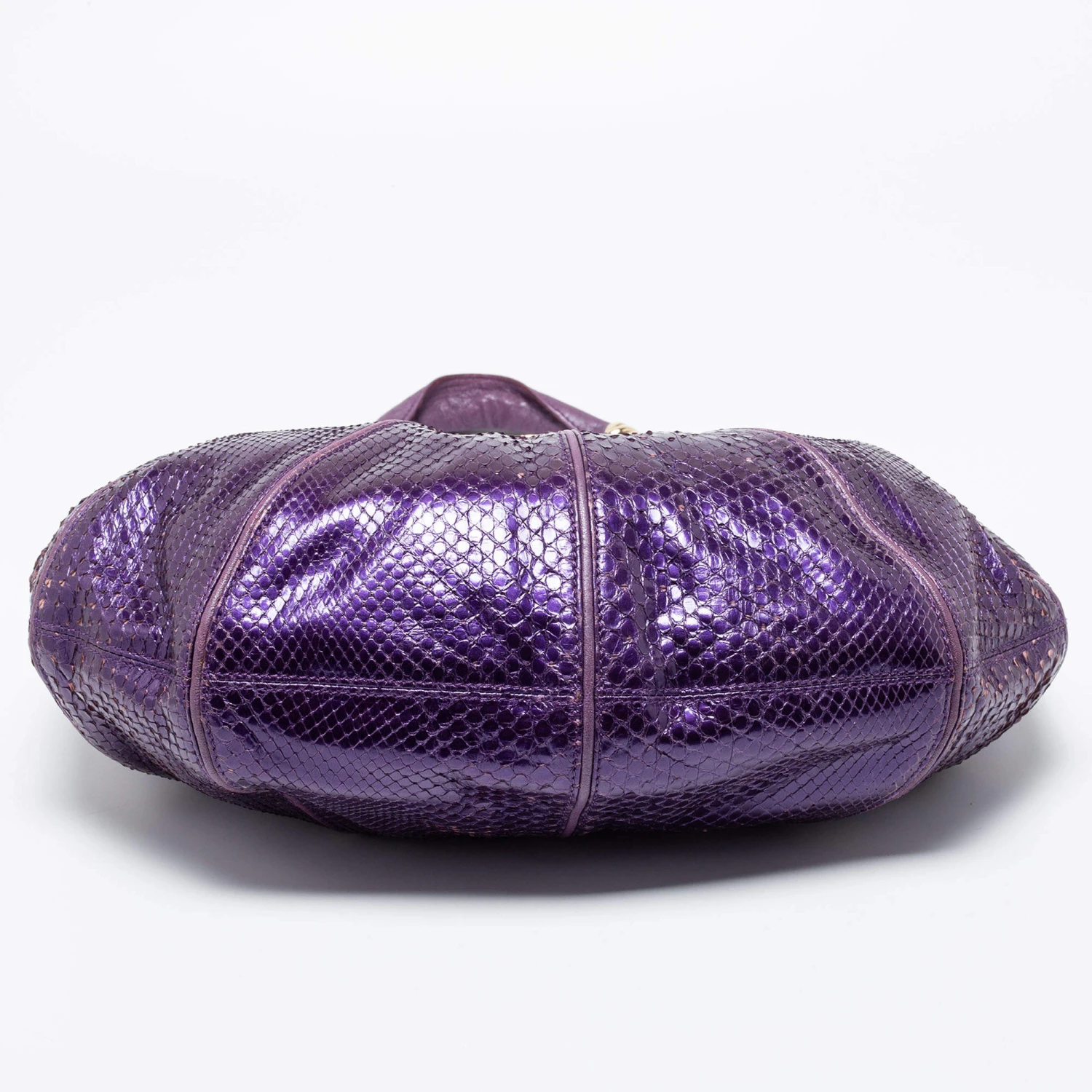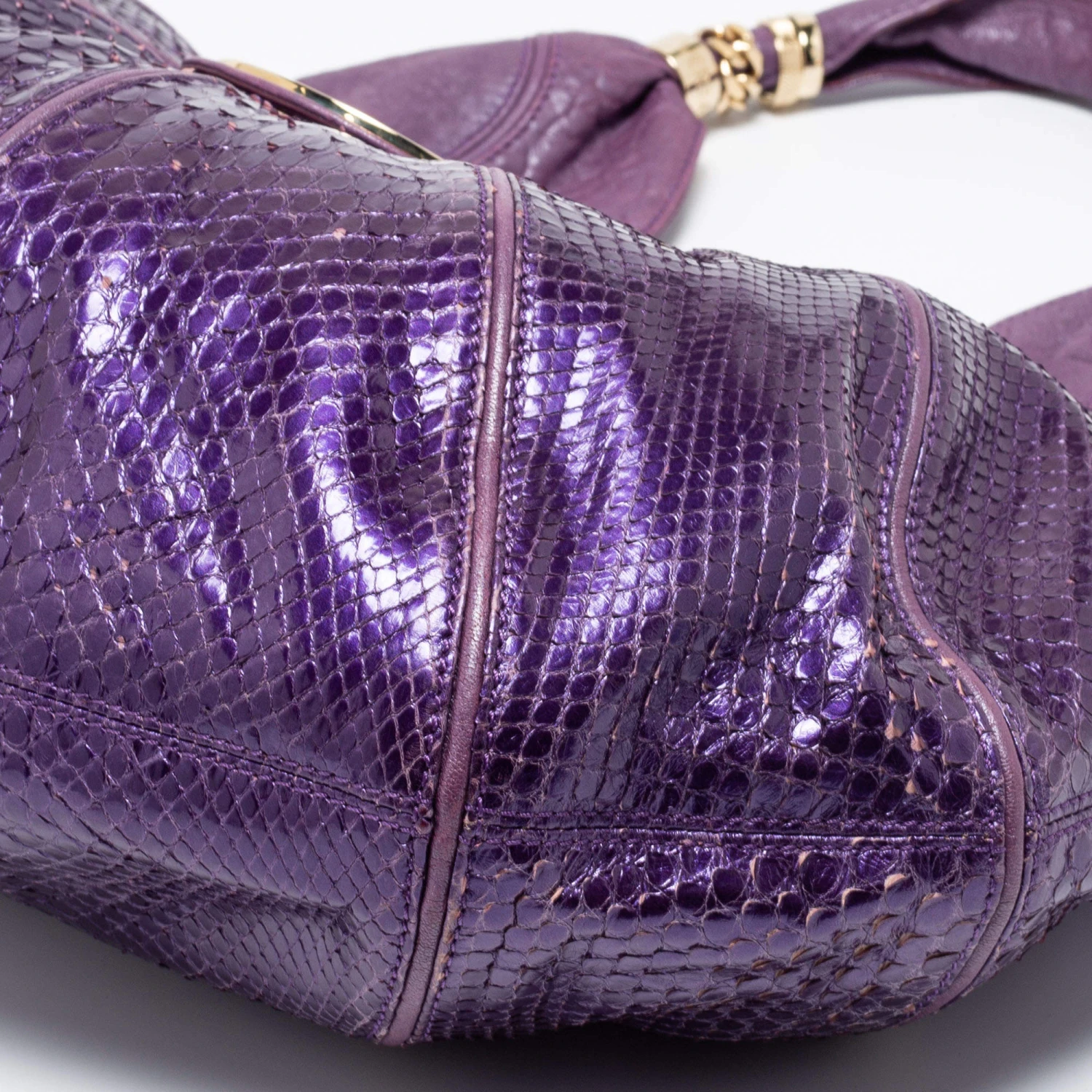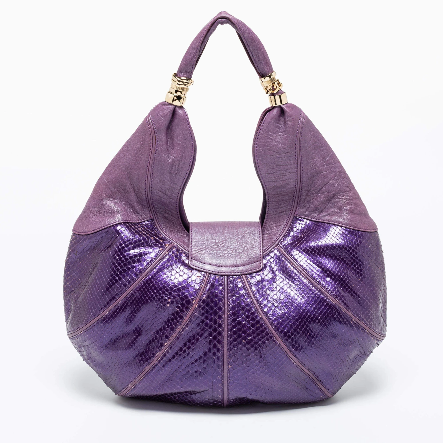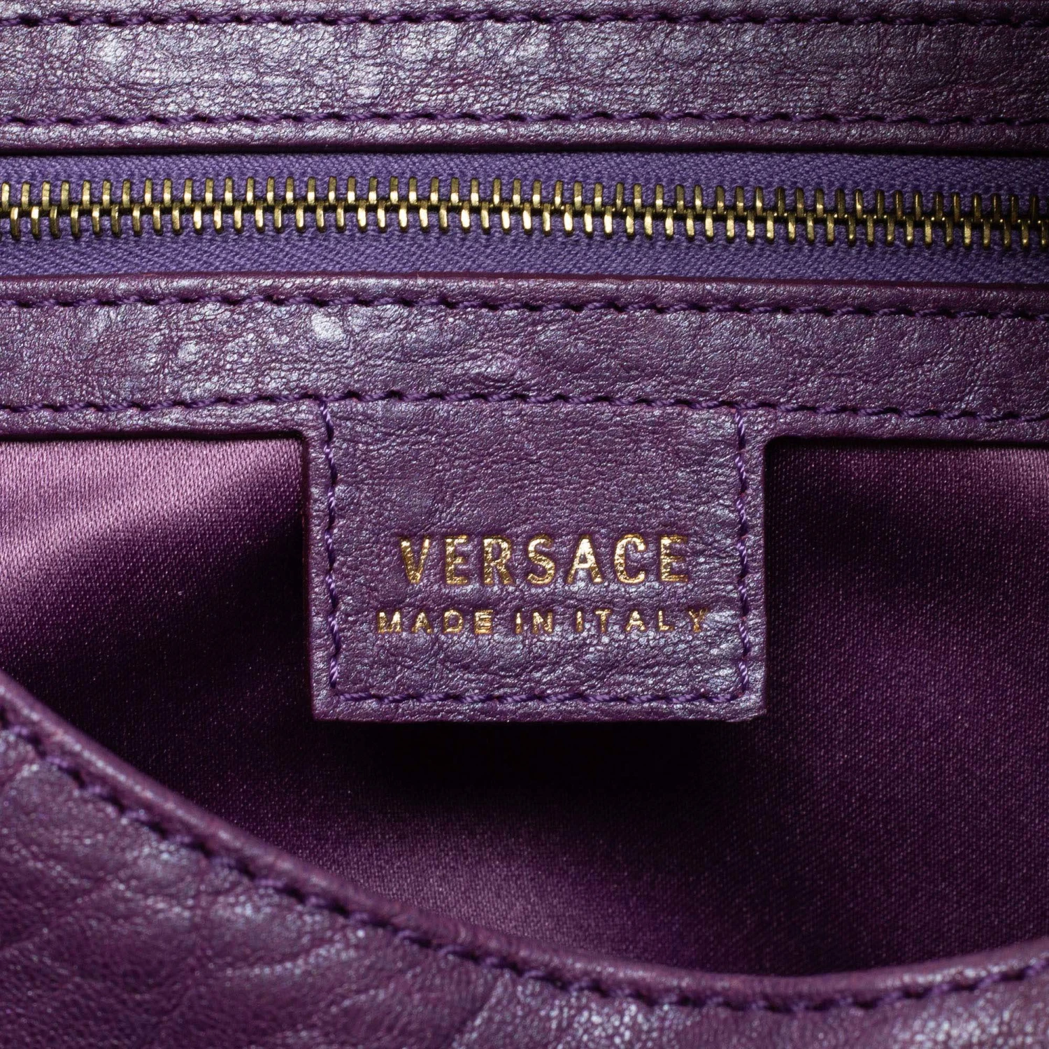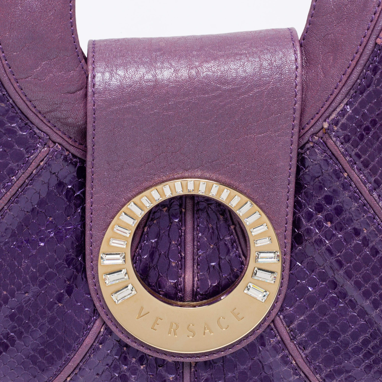 Spacious and captivating, this hobo comes from the House of Versace. It has been crafted from purple snakeskin and leather, with a crystal-embellished accent placed on the front. It features a single handle, gold-toned hardware, and a satin-lined interior. Make this stunning hobo yours today!