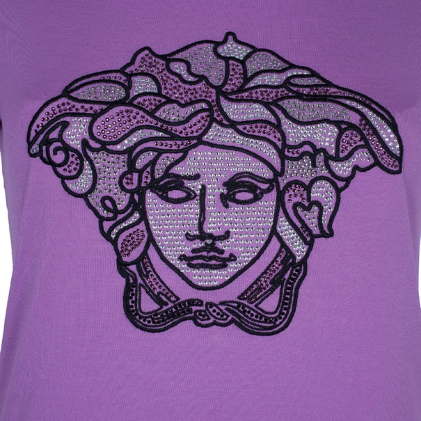 This studded Versace Medusa T-shirt features short sleeves and a round neck. This fun top is highlighted with a studs arranged in an eye-catching Medusa head at the chest. The trim-tailored T-shirt is cut from soft stretch cotton. Pair it with your denims and sneakers for an ultra stylish sporty look!
