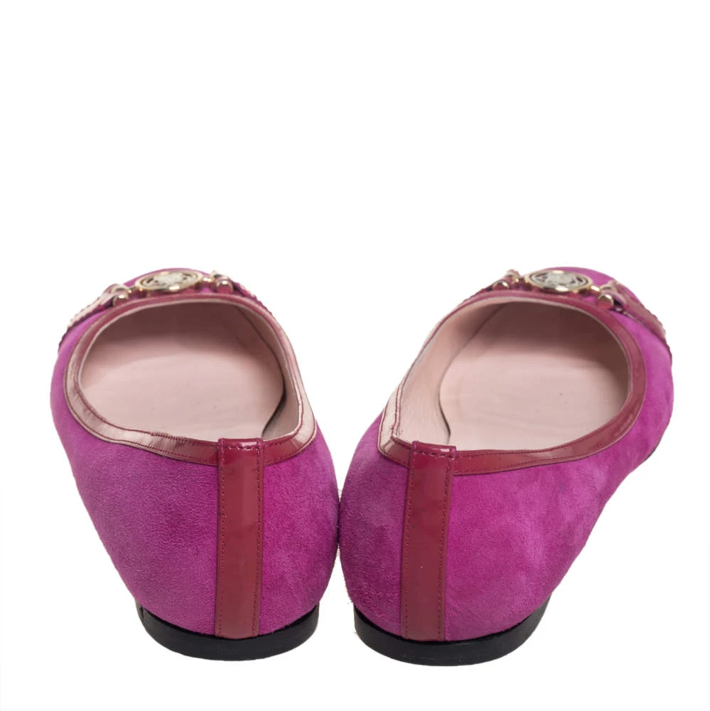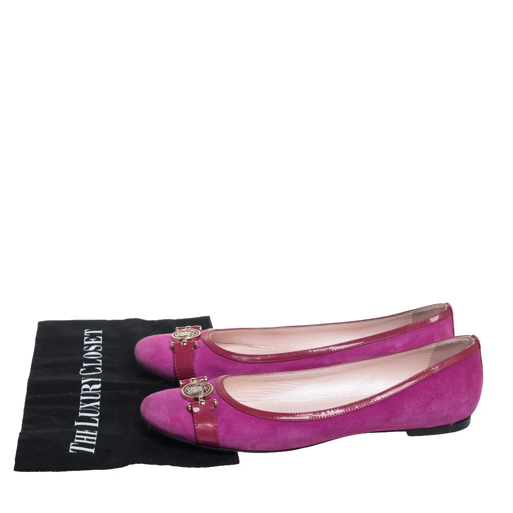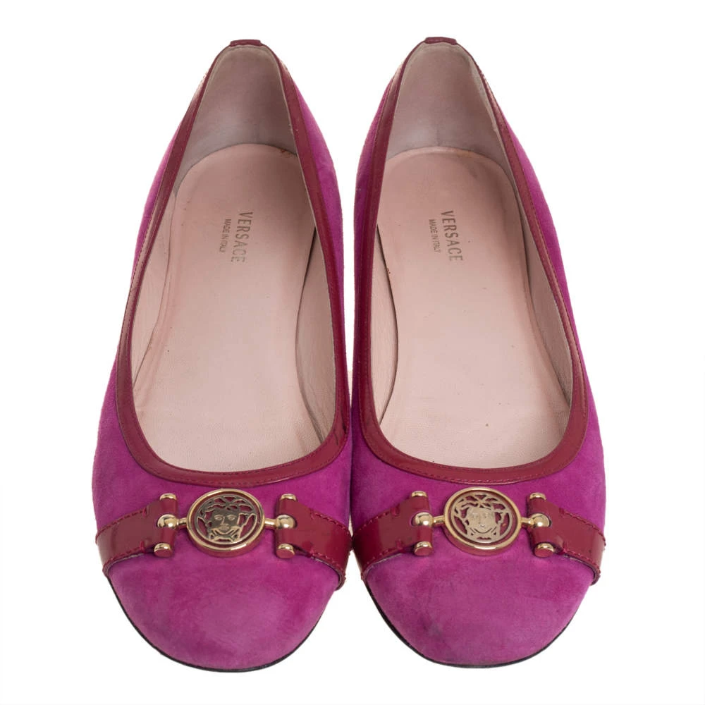 These purple ballerina flats from Versace are perfect for a casual day out or brunch with friends. They have been crafted from suede and styled with round toes and signature accents on the uppers. They are complete with leather-lined insoles.