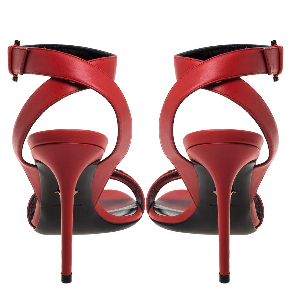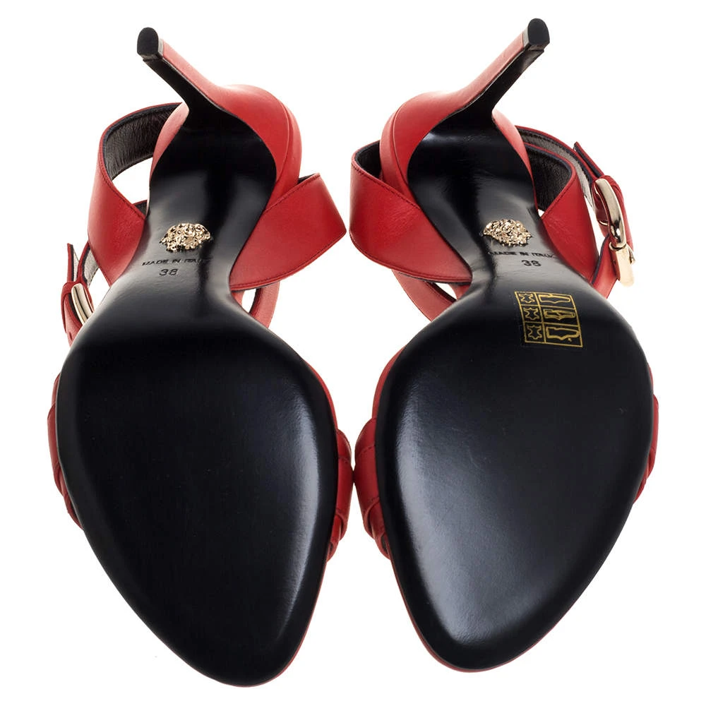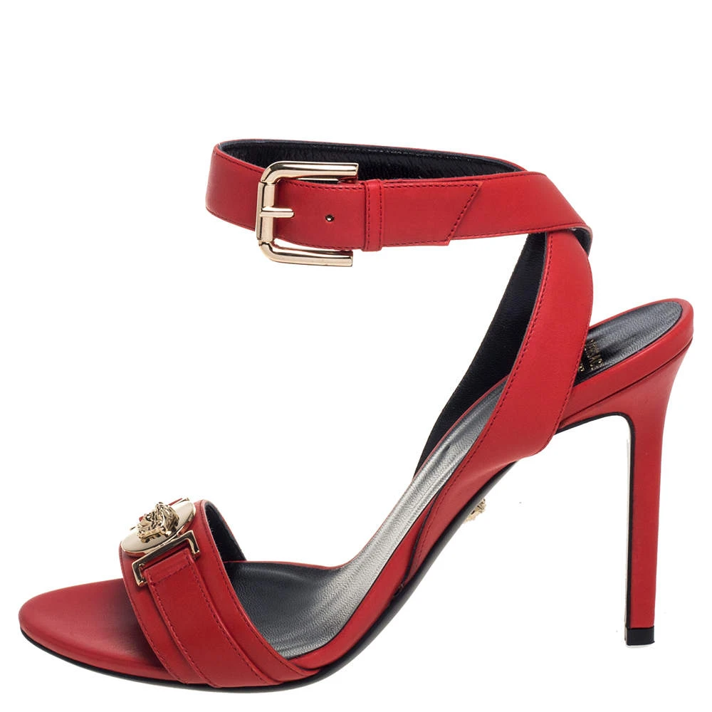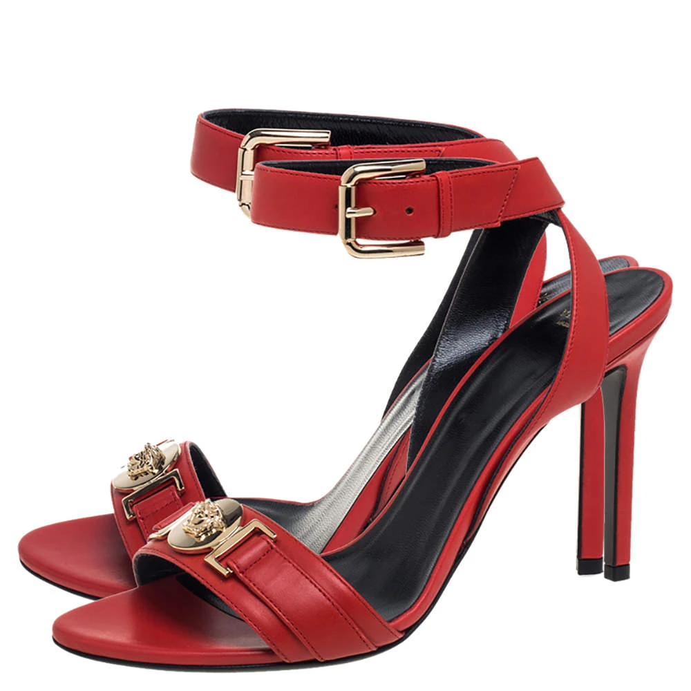 Be ready for constant attention and admirable gasps from your audience when you walk in these sandals from Versace. Crafted from red-hued leather, they carry open toes with the iconic Medusa logo embellished on the vamps and 10 cm heels. The pair is complete with comfortable leather-lined insoles.
