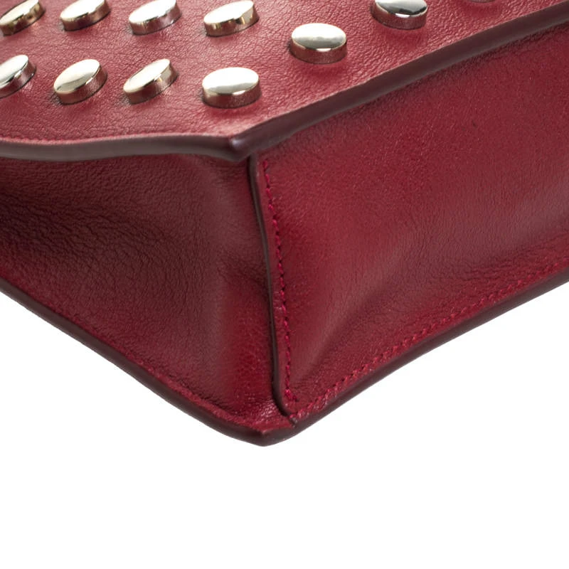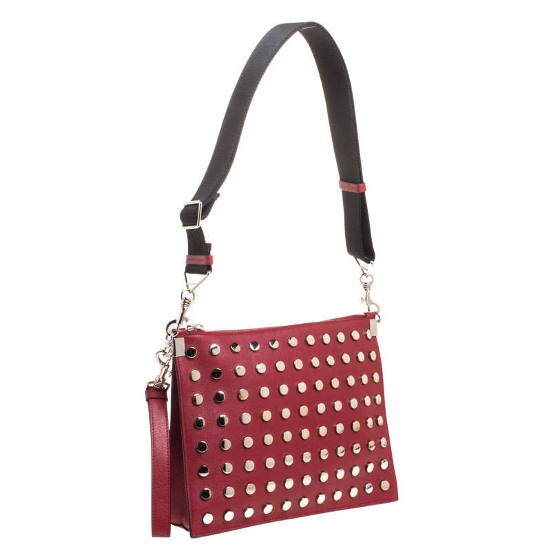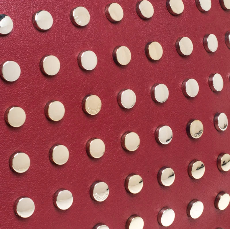 This striking shoulder bag hails from the iconic house of Versace. Crafted in Italy, it is made of quality leather and flaunts a lovely shade of red. It is held by a single handle and features a lovely silhouette. The front has been beautified with silver-tone studs. It is equipped with a zip closure that reveals a fabric-lined interior with a slip pocket. It is finished with a brand logo on the back and silver-tone accents.