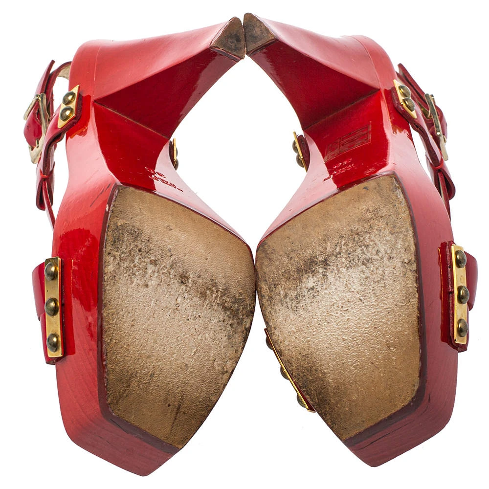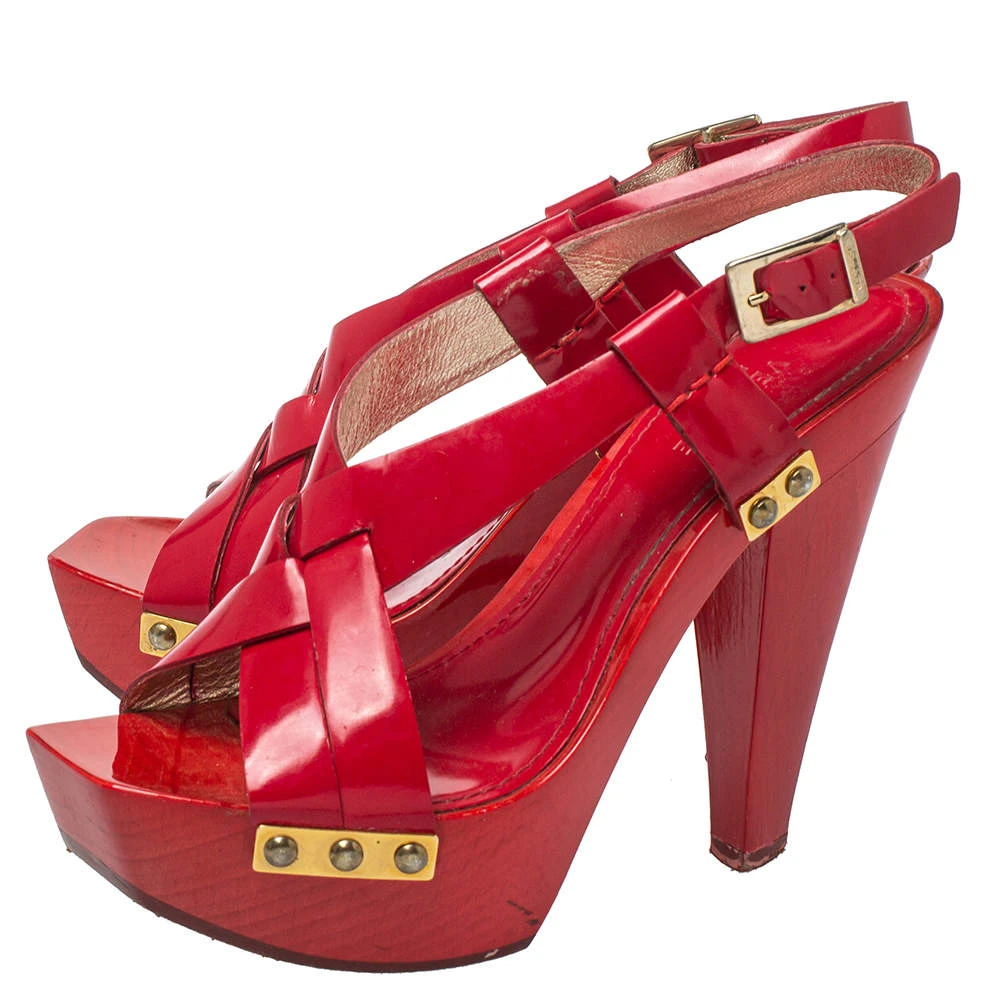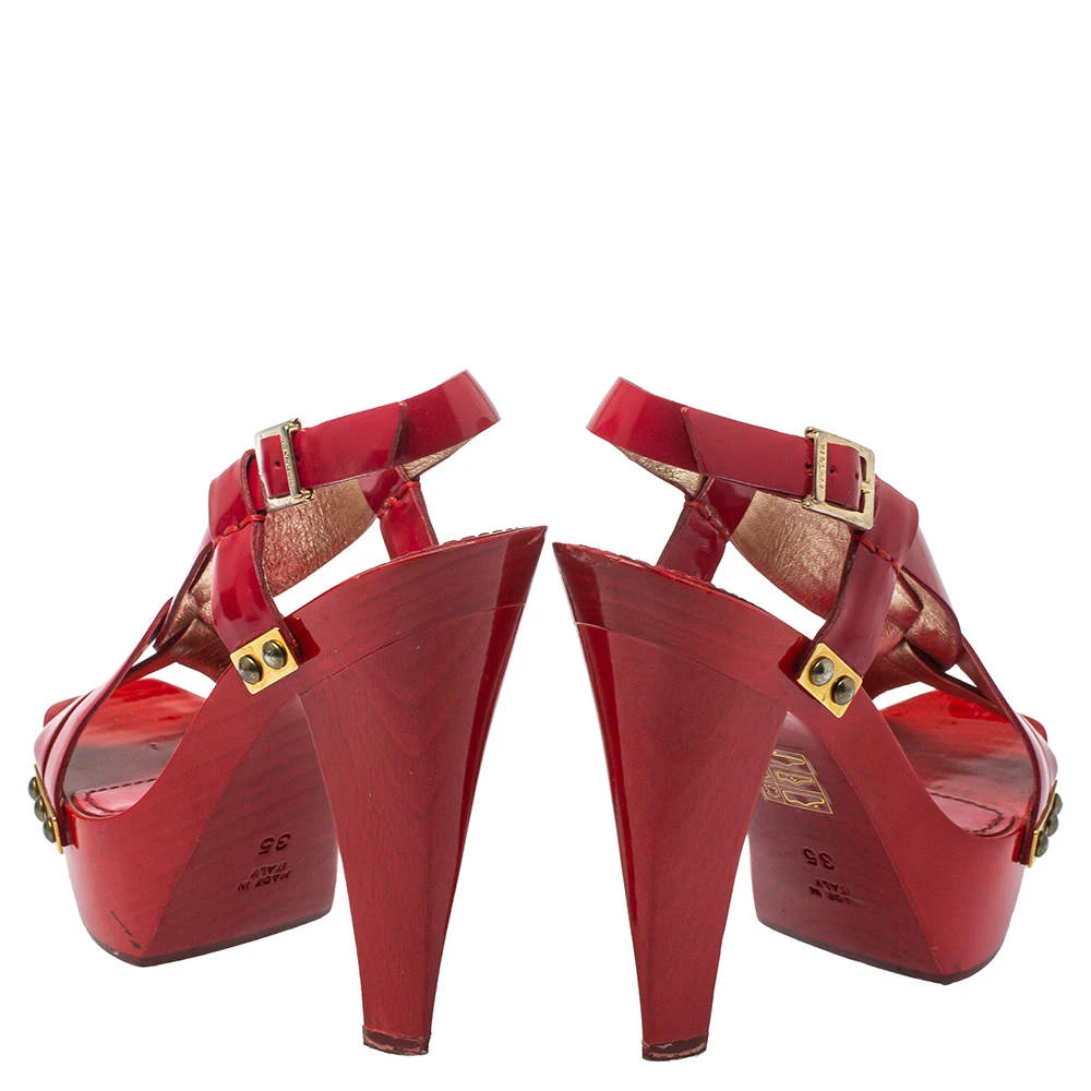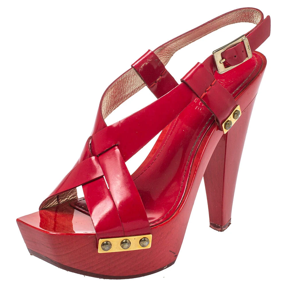 Versace yet again brings a stunning set of sandals that makes us marvel at its beauty and craftsmanship. Crafted from glossy patent leather in a red shade, they are adorned with open toes and block heels supported by platforms. There are endless ways to style these beauties.