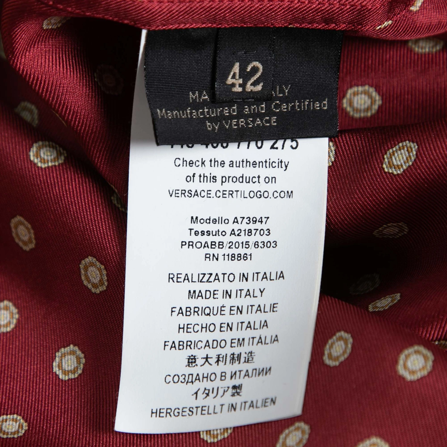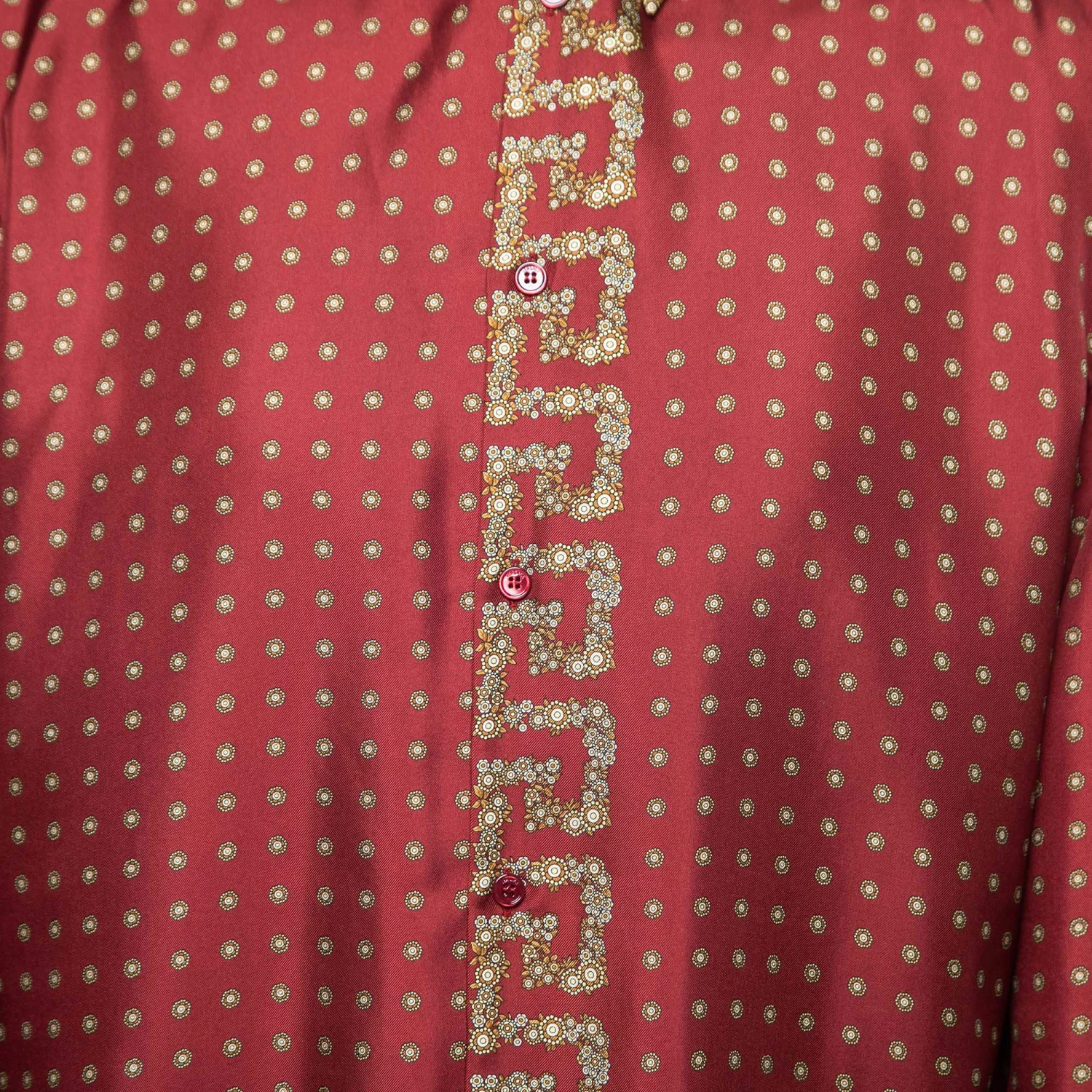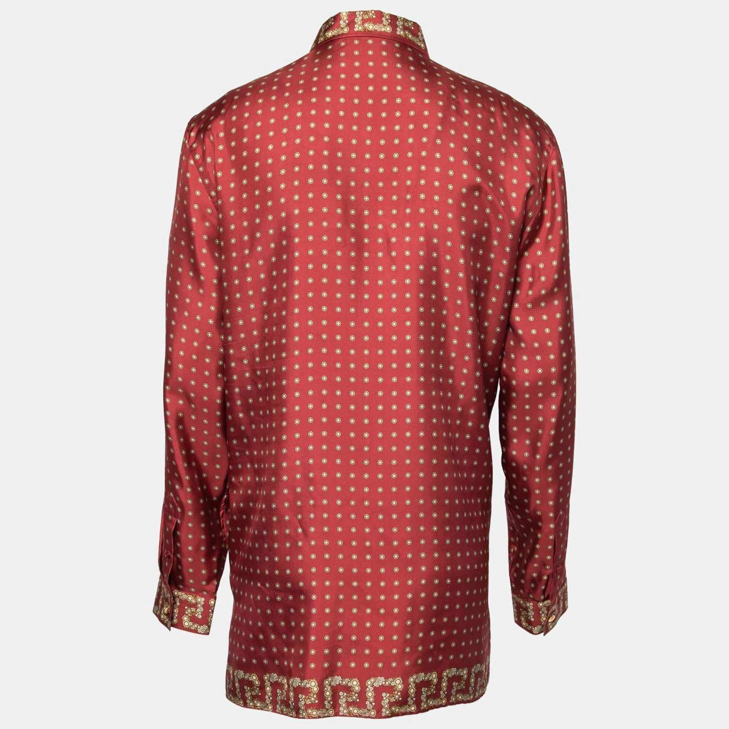 Shirts are an indispensable part of a wardrobe, so Versace brings you a creation that is both versatile and comfortable. It has been tailored from silk in a red shade featuring the Greca motifs along the hem, collars, buttons, and cuffs.