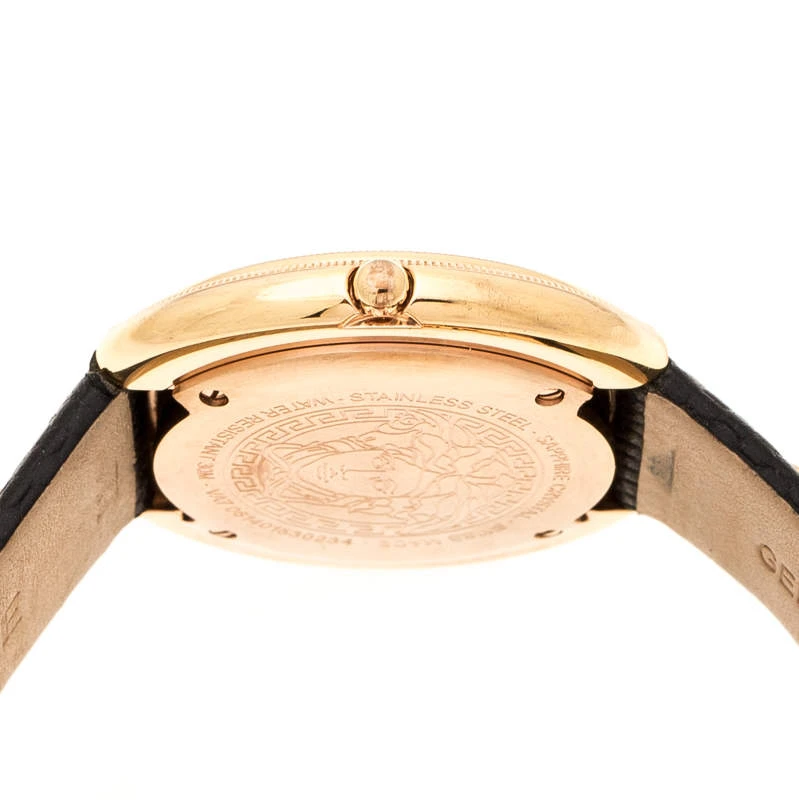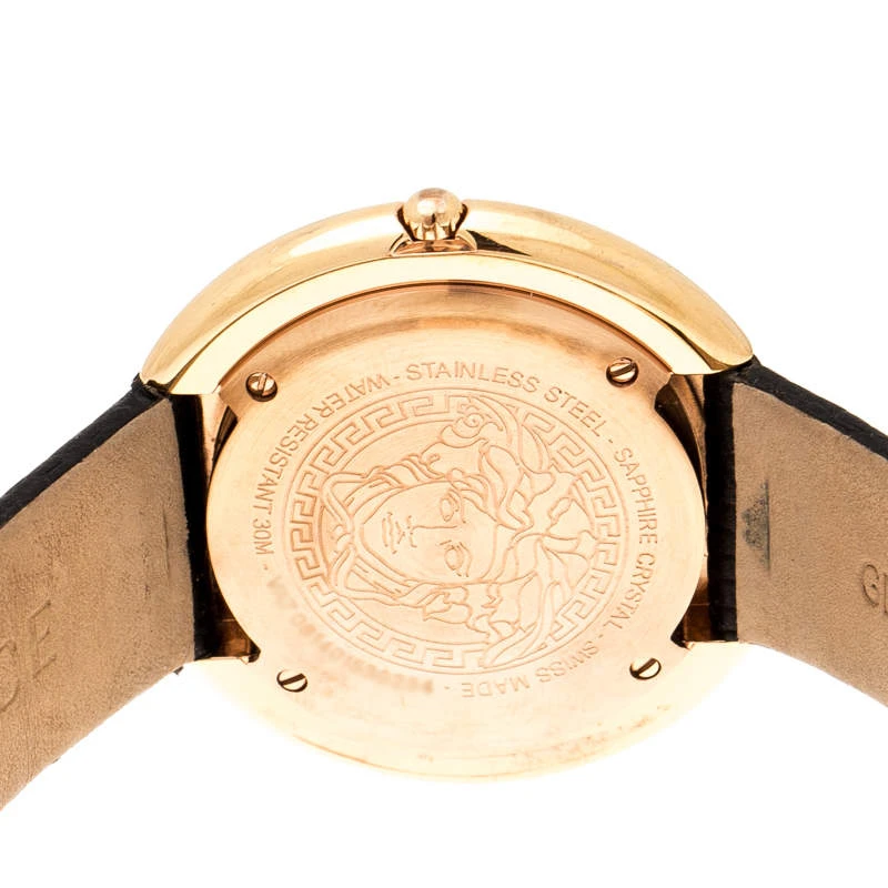 Simplicity and elegance find their way into a perfect combination with style and glamour to complete this stunning watch by Versace. Crafted out of rose gold-plated stainless steel and held by leather, this quartz watch features dot hour markers, two hands on the dial and two medusa studs on the straps. It will always help you be on time.