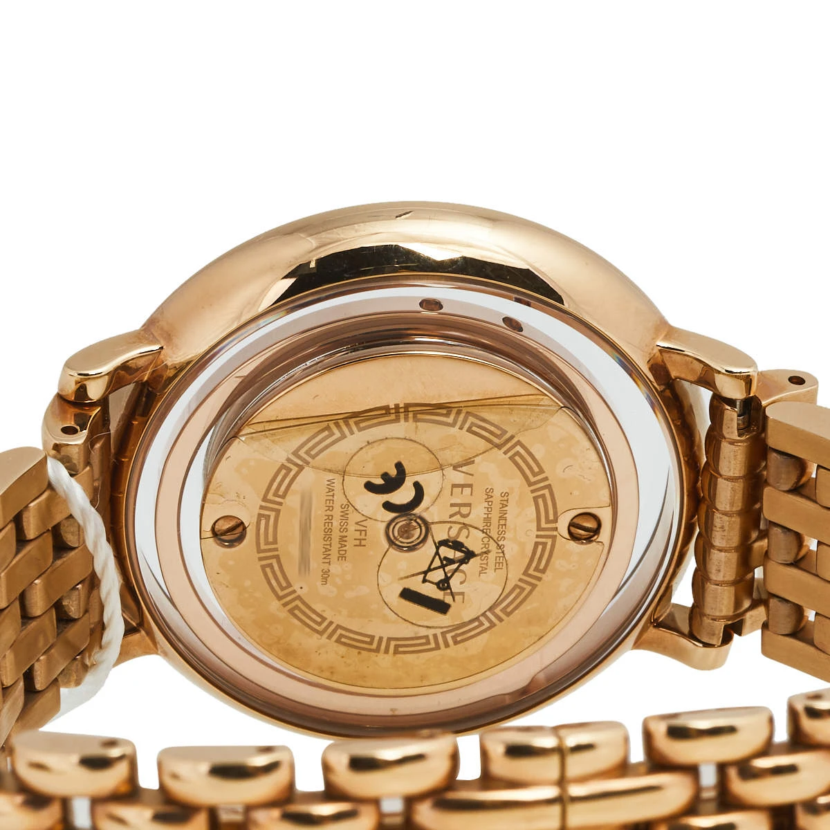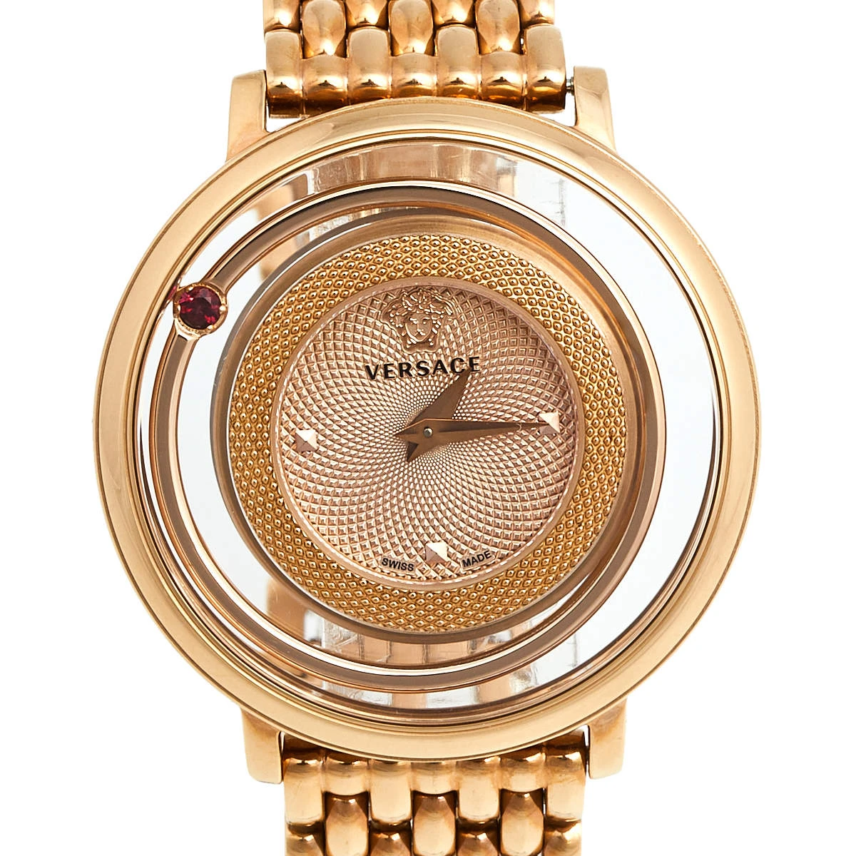 This beautiful timepiece from the house of Versace is sure to be a conversation starter with its eclectic and eye-catching design. Constructed in rose gold-tone stainless steel, this Venus watch features a transparent panel around the case and one of the rims holds a single pink crystal. The dial is set with stud markers, the iconic Medusa logo, and two hands.