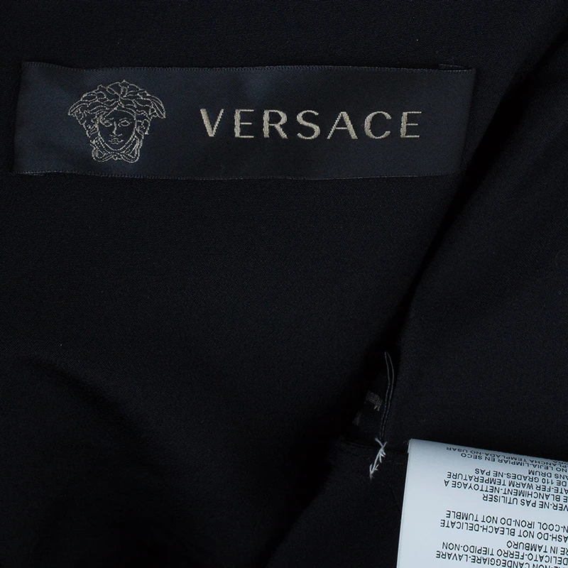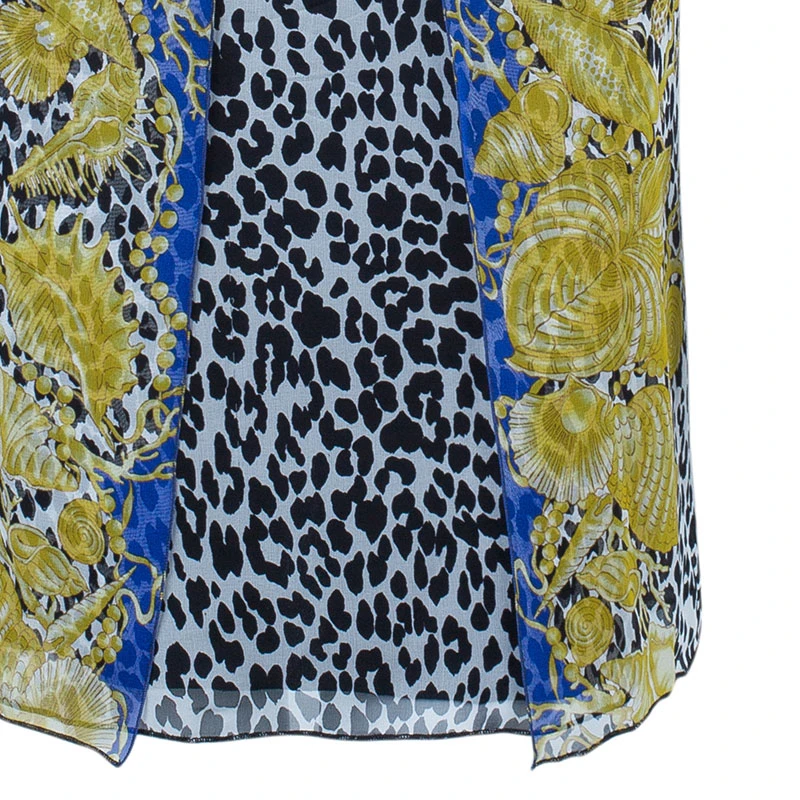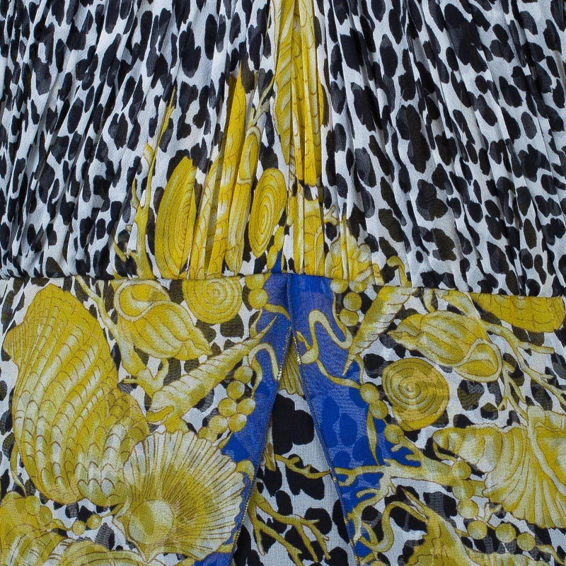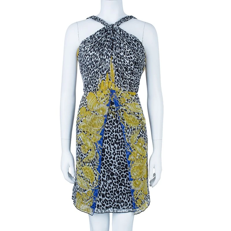 This chic halter neck dress by Versace has a leopard print with a flowery vertical pattern in the front in yellow. The flair gives this dress a unique look. The dull yellow goes superbly well with the dark base print. A quick pick for any day break!