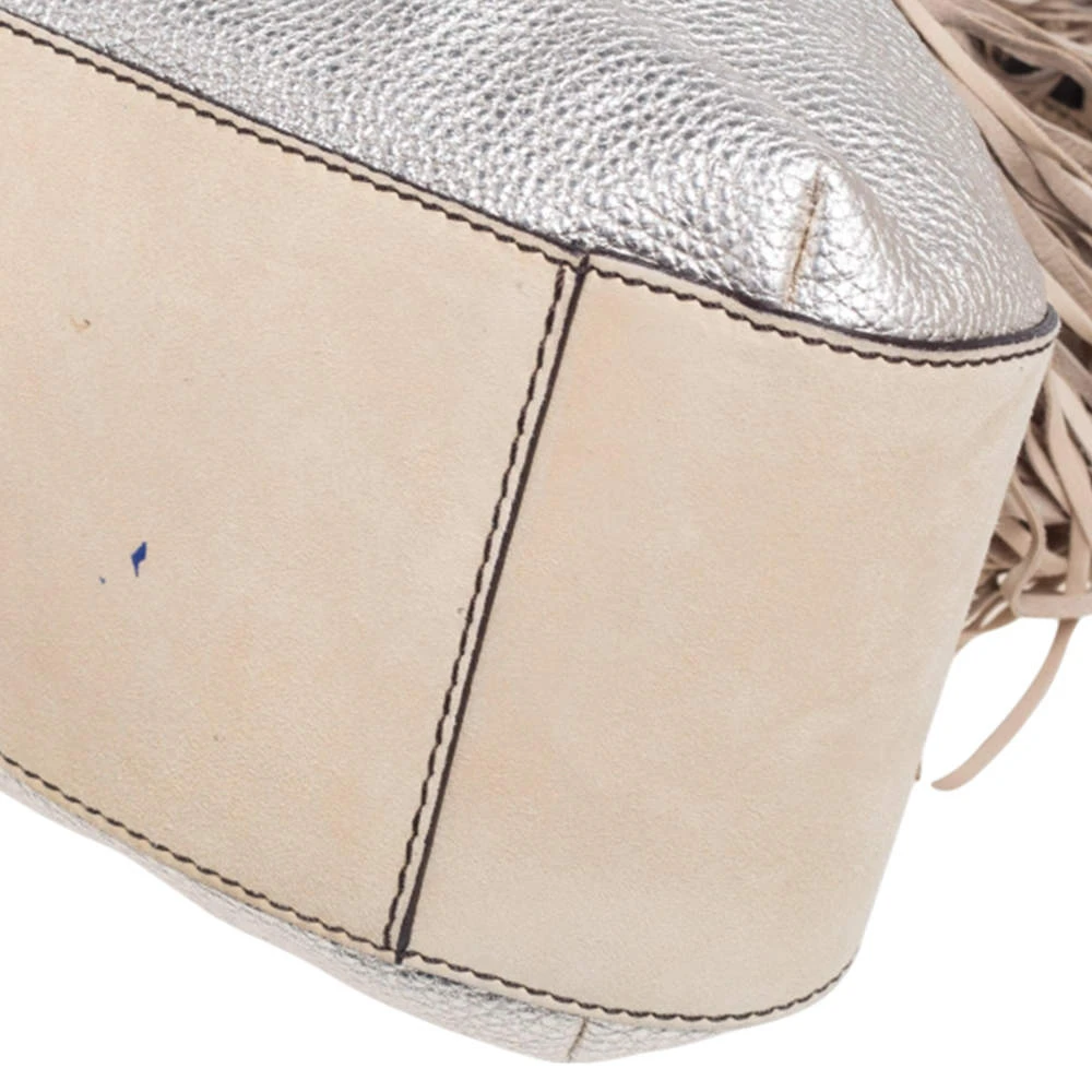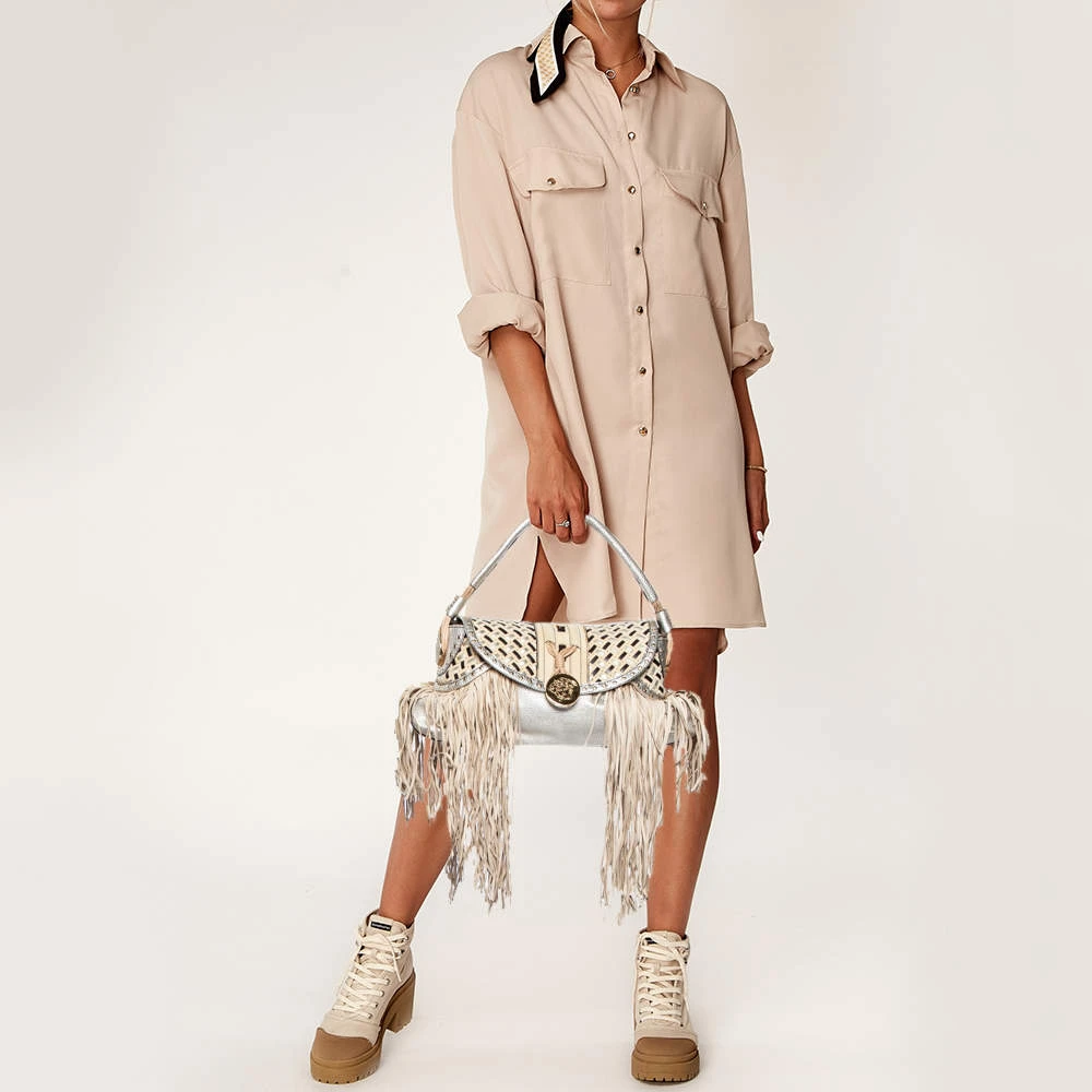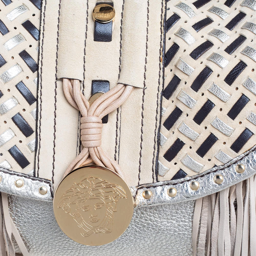 When utility meets high style, we get this Versace bag. Crafted from woven leather, this bag features a top handle, the Medusa logo charm on the embellished front flap, heavy fringes on the exterior, and a fabric interior to house the things you need.