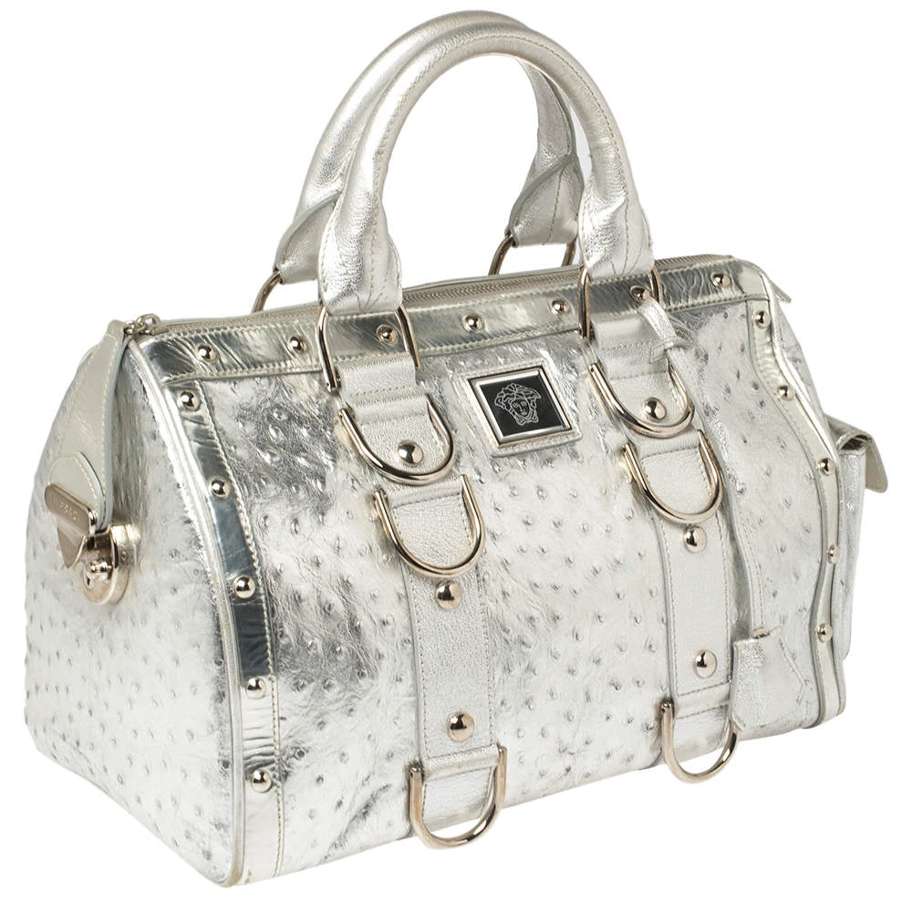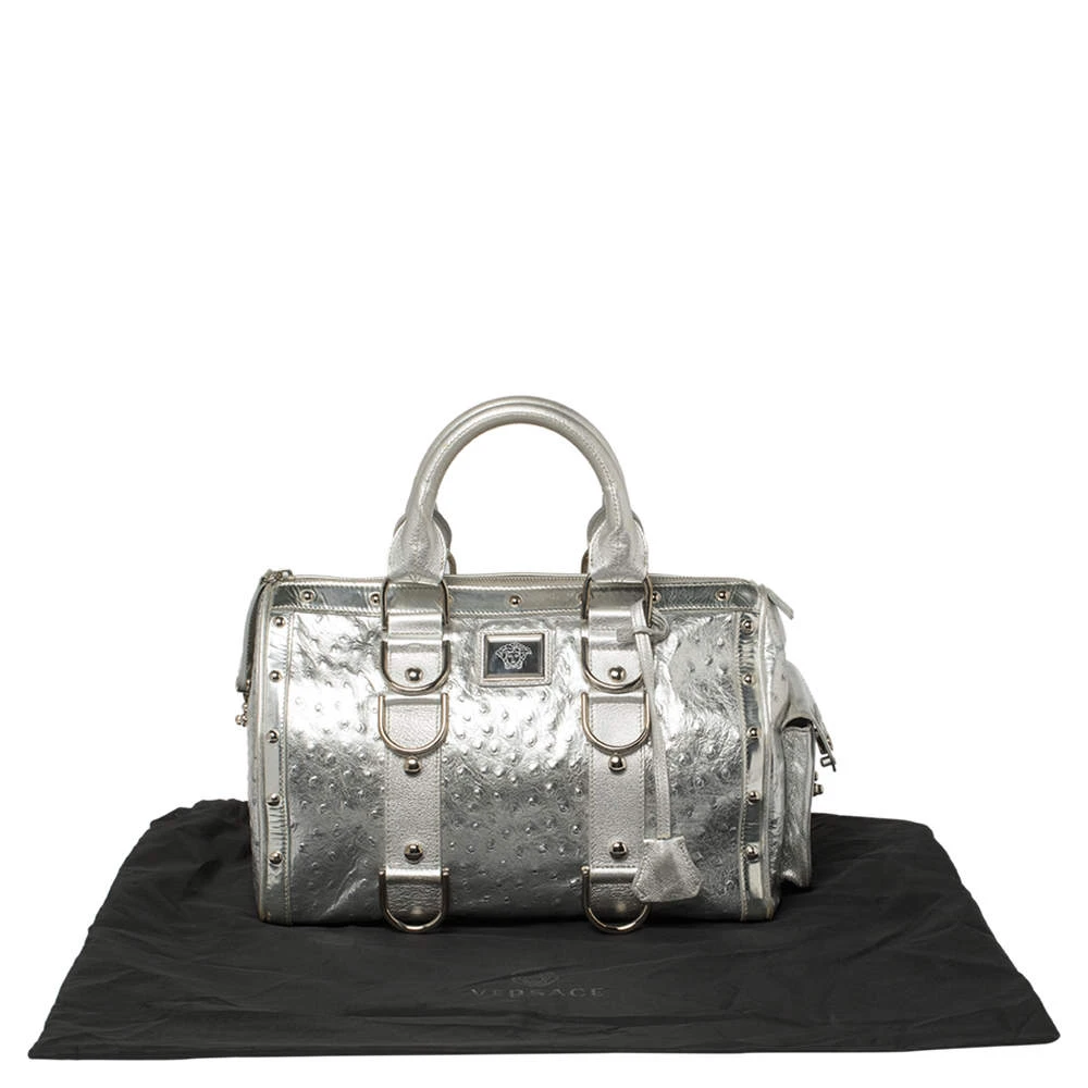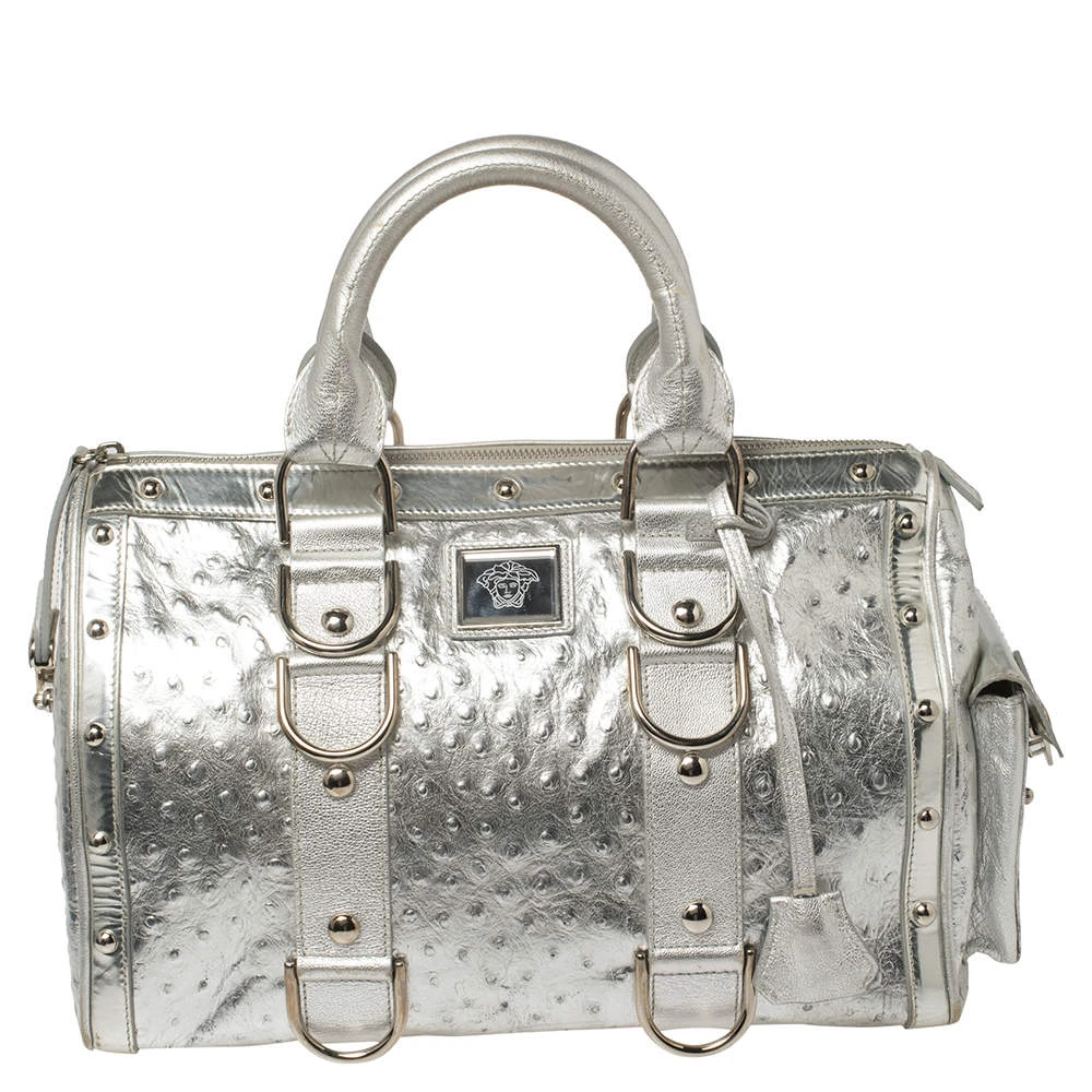 How gorgeous is this satchel from Versace! It carries an outstanding design and a fabulous interplay of ostrich-embossed leather and silver-tone hardware. It has a top leading to a satin interior while being held by two top handles. The shape and the Medusa logo on the front just uplift its beauty and makes it a buy you will not regret.